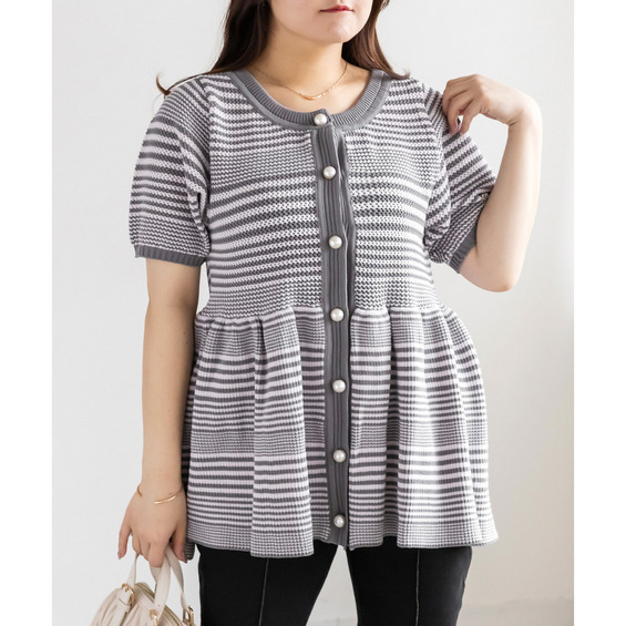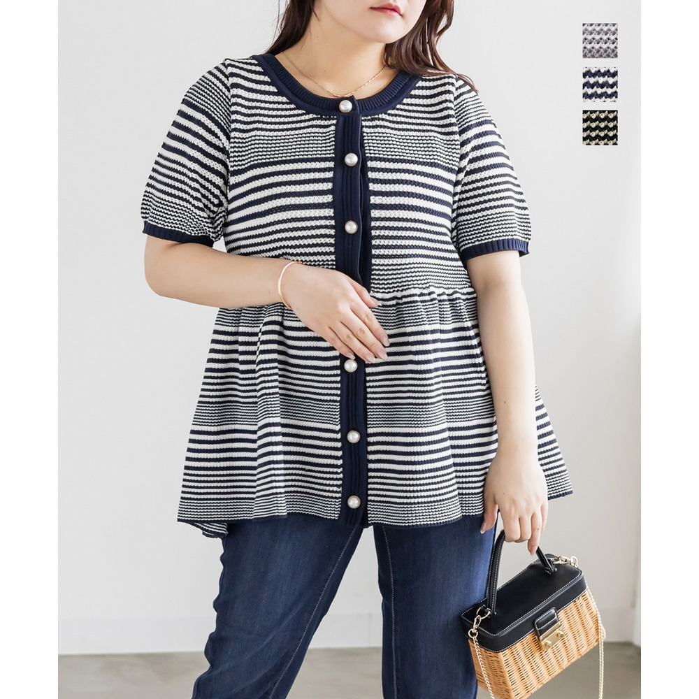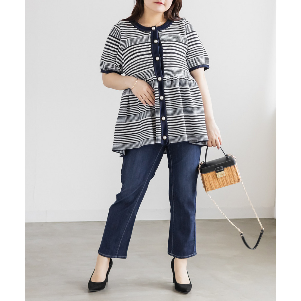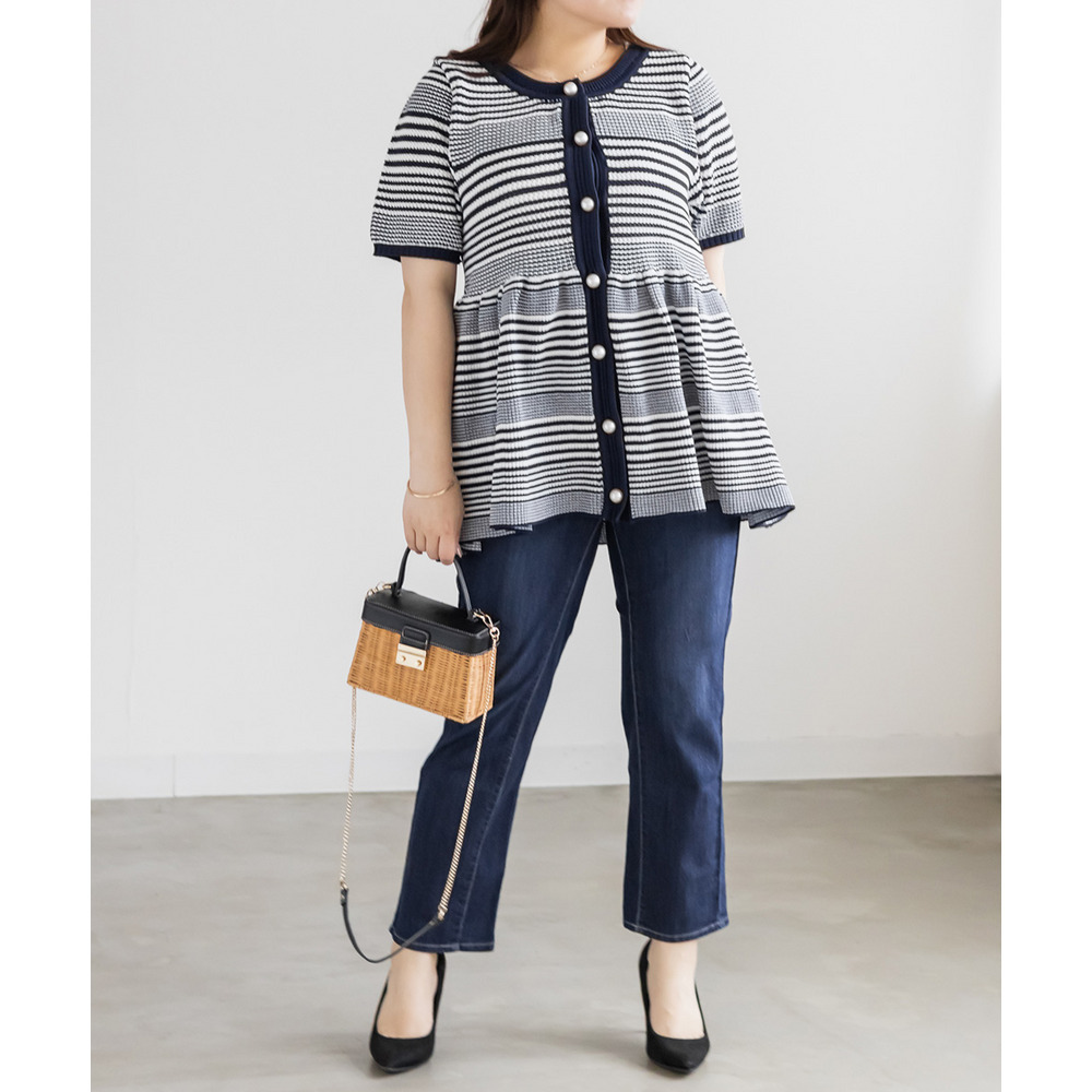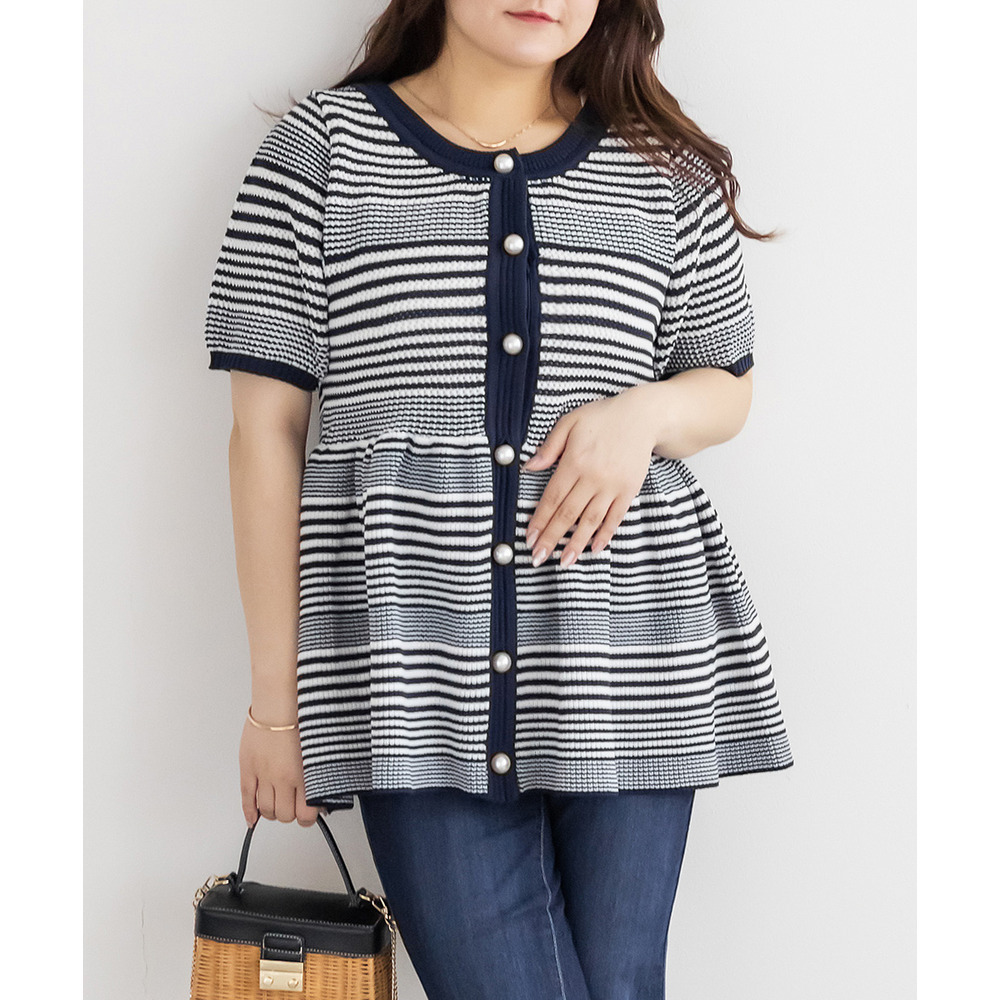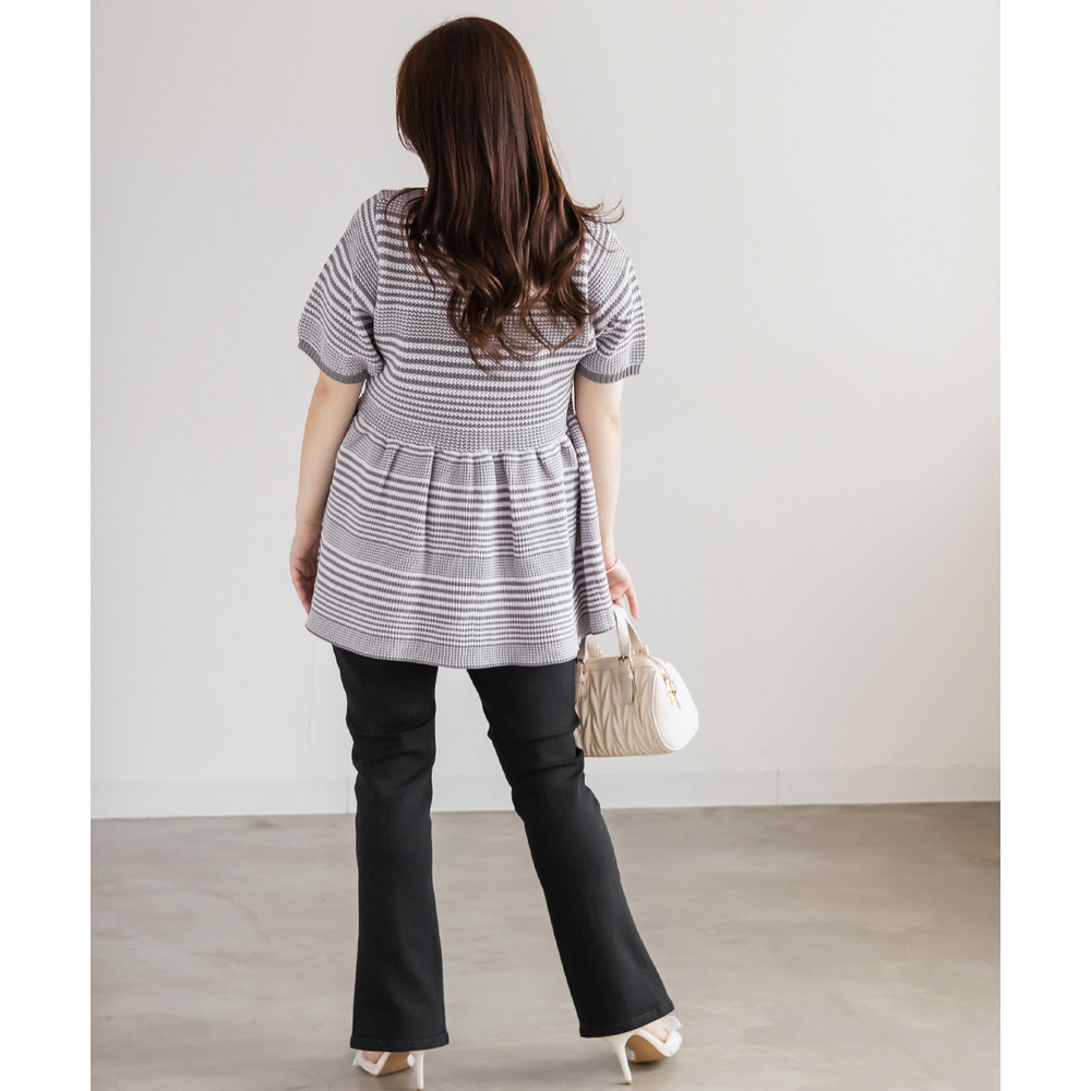 LLサイズを着用してちょうどいいサイズ感でした!ボーダー柄にパールボタンのデザインがアクセントになって、上品に着られるのが嬉しいです◎ペプラムシルエットがふんわり広がって、お腹まわりをさりげなくカバーしつつ女性らしい印象に見せてくれました♪ニット素材も柔らかくて着心地がよく、1枚でしっかりコーデが決まるアイテムです!