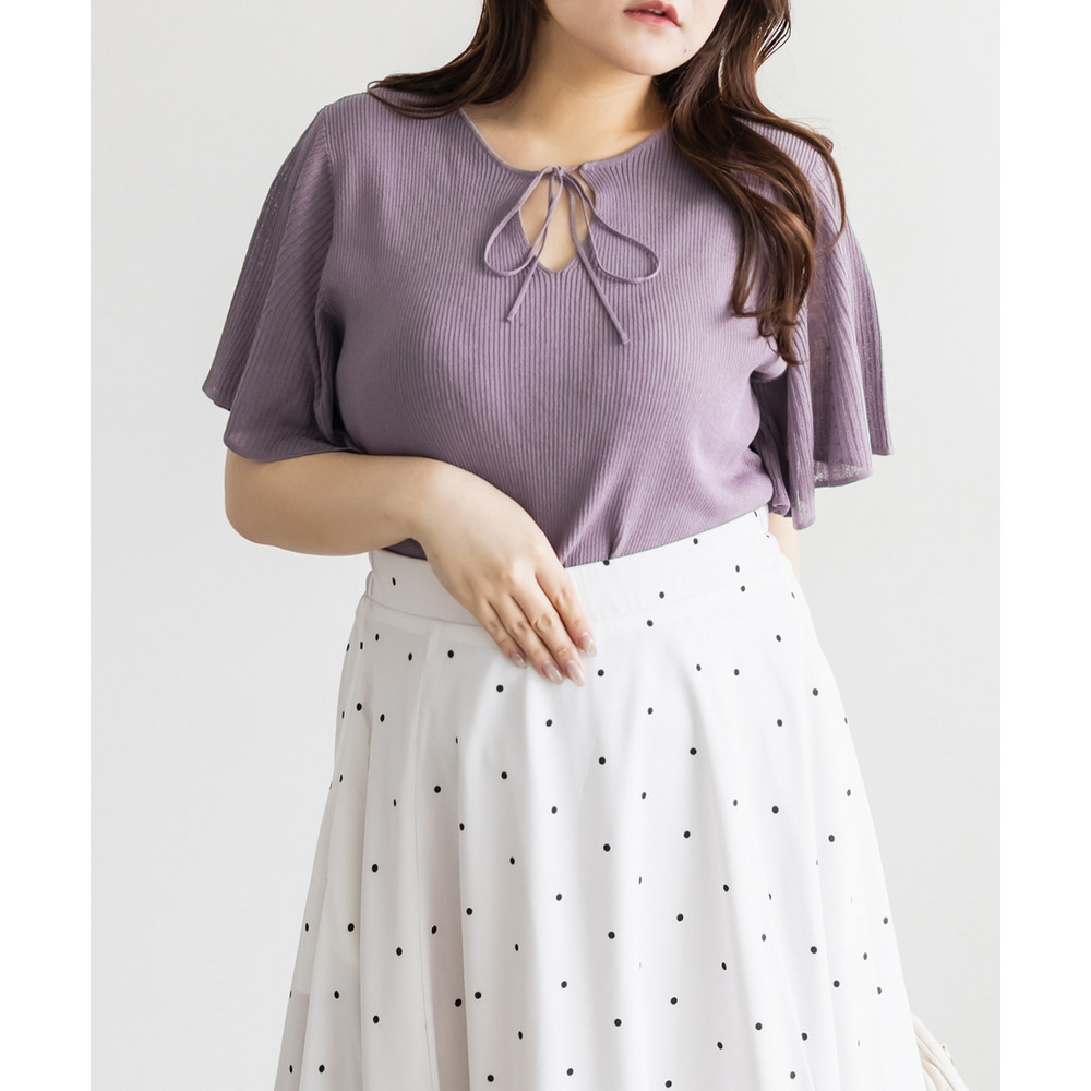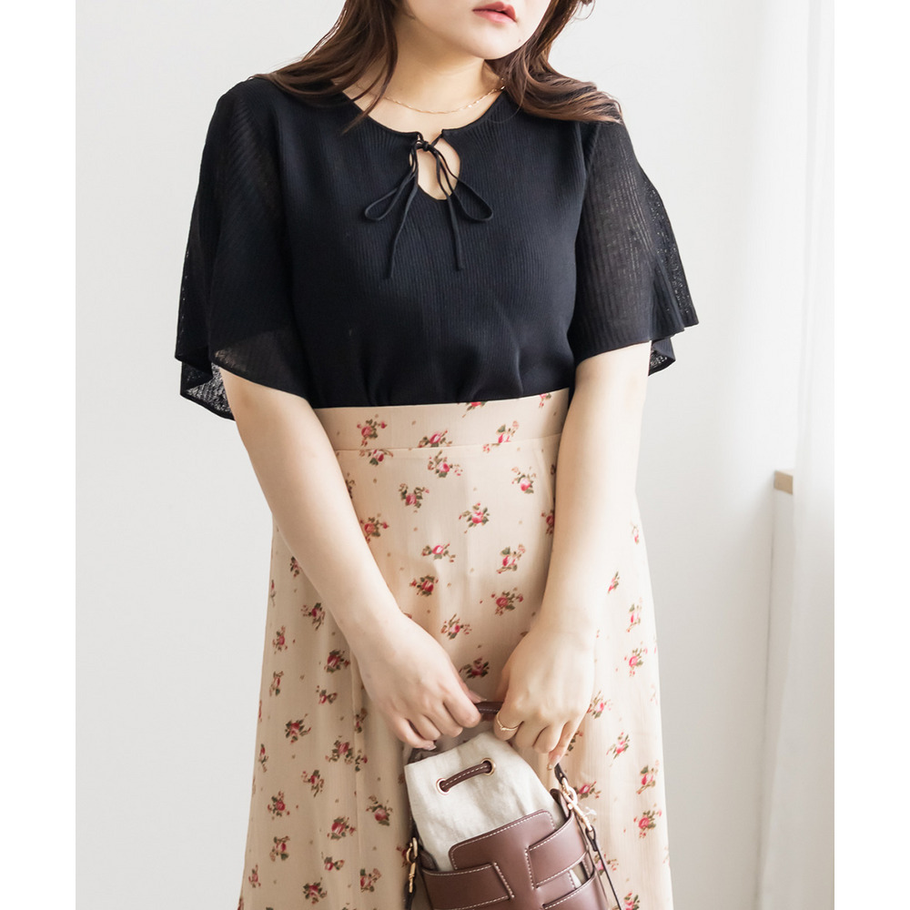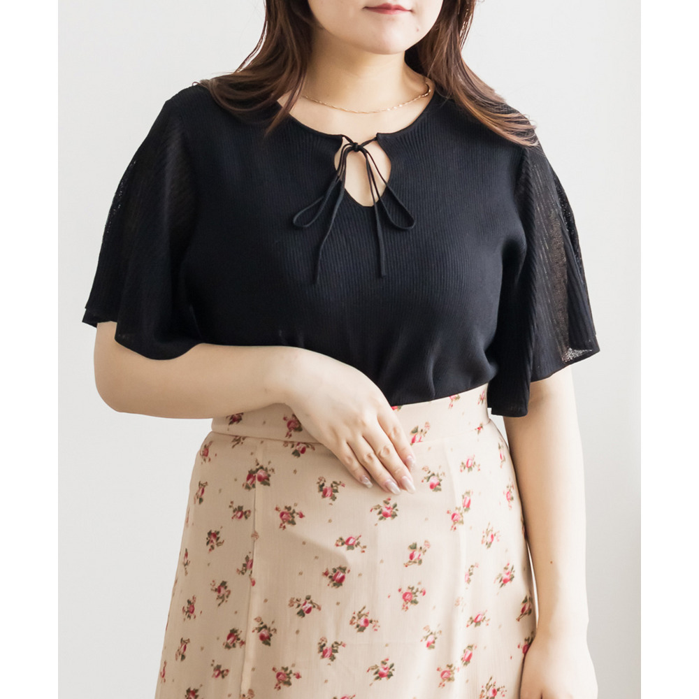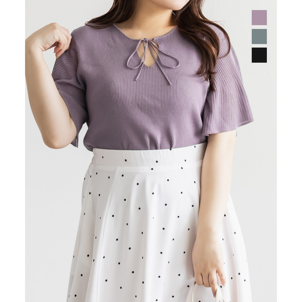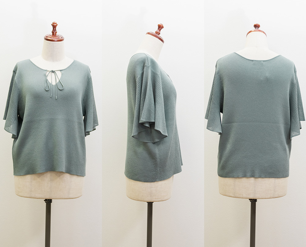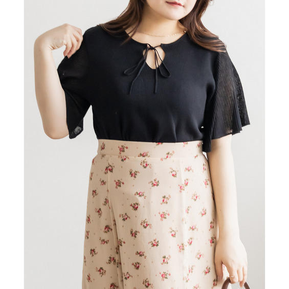 | LLサイズを着用してちょうどいいサイズ感でした!肩まわりや身頃は程よくフィットしつつも窮屈感がなく、ニットも薄手で柔らかくチクチク感なく快適に着られる着心地でした◎フレア袖がふんわり広がって華やかな印象に見せてくれて、気になる腕まわりもさりげなくカバーしてくれます♪リボンネックのデザインが顔まわりのアクセントになって、1枚でしっかり着映えするのが嬉しいポイントでした!きれいめにもカジュアルにも着回ししやすい一枚です。 |