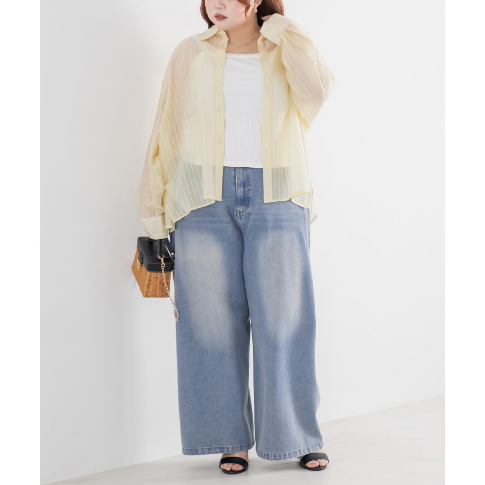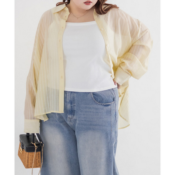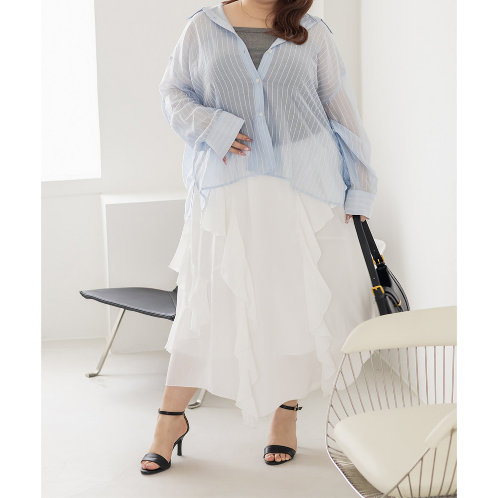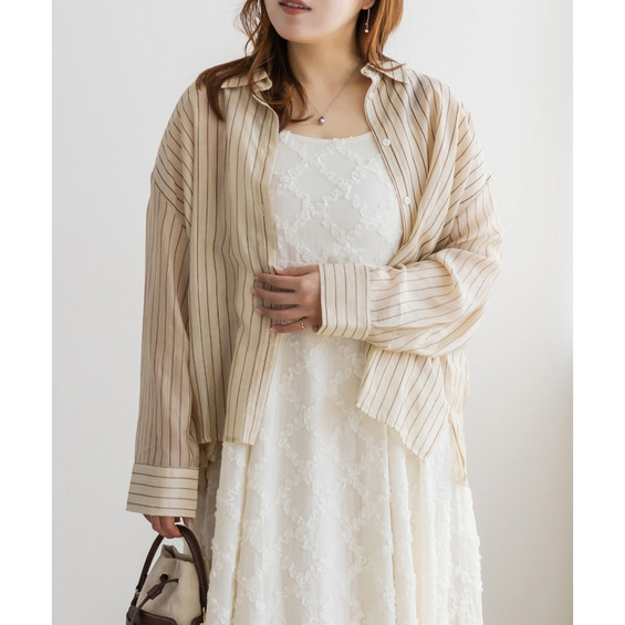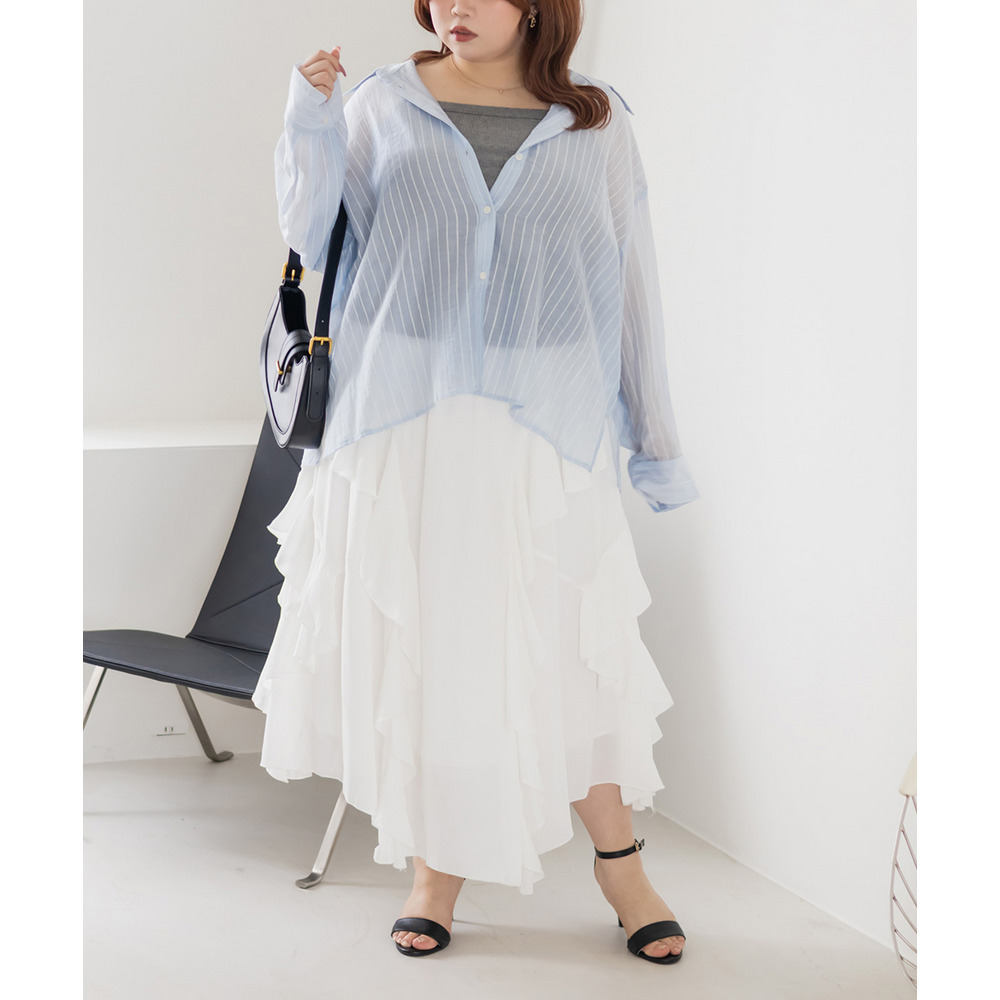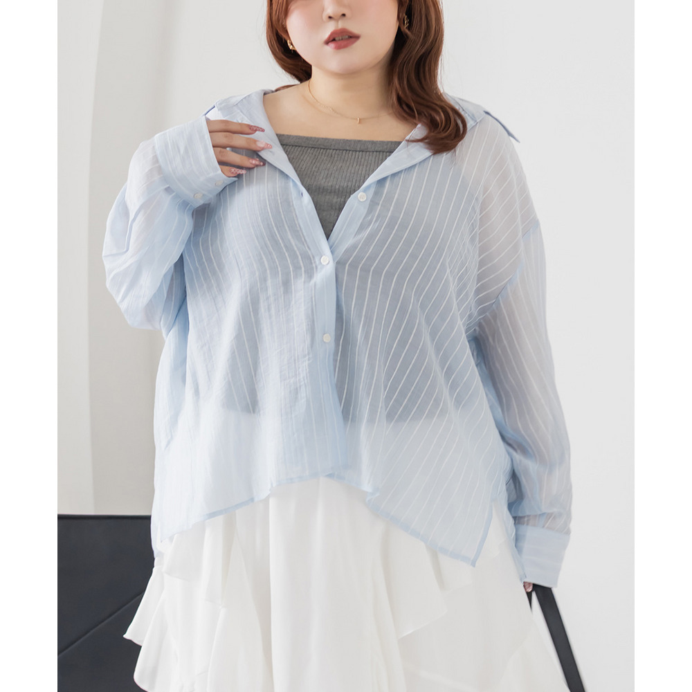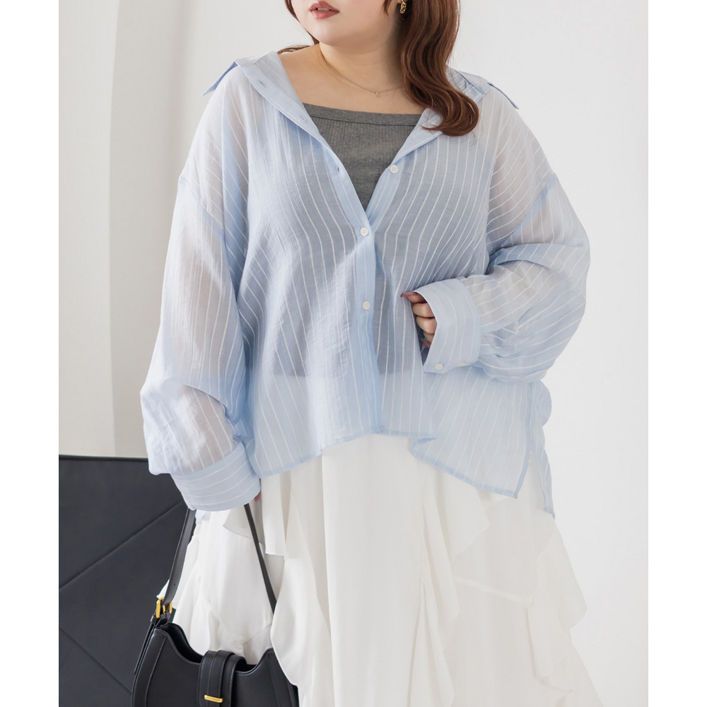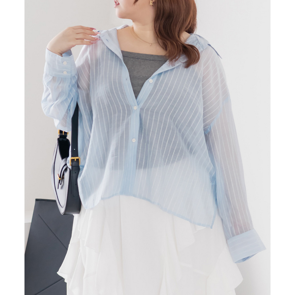 | 3Lサイズを着用しました。全体的にゆとりのあるシルエットで、ちょうどいい着心地でした。とても軽くてさらっとしたシアー素材なので、肌離れがよく夏でも涼しく着られます。透け感があることでカジュアルになりすぎず、自然と女性らしい印象に仕上がるのが嬉しいポイント♪ ヒップまで隠れる丈感なので体のラインを拾いにくく、パンツ合わせでも安心感があります。前を開けて羽織として使えば、日焼け対策や冷房対策にも◎ スカート合わせでフェミニンにも着られて、着回し力の高い1枚だと思いました。 |
