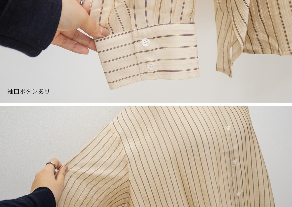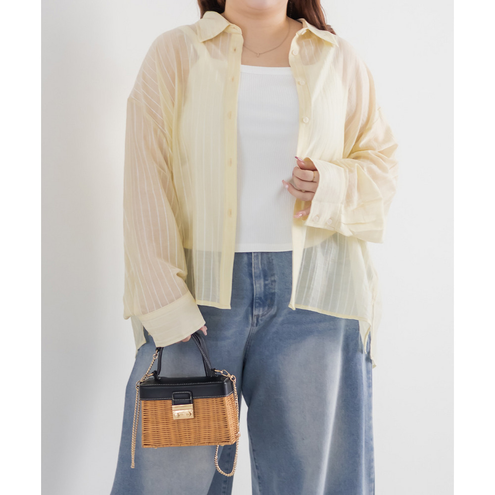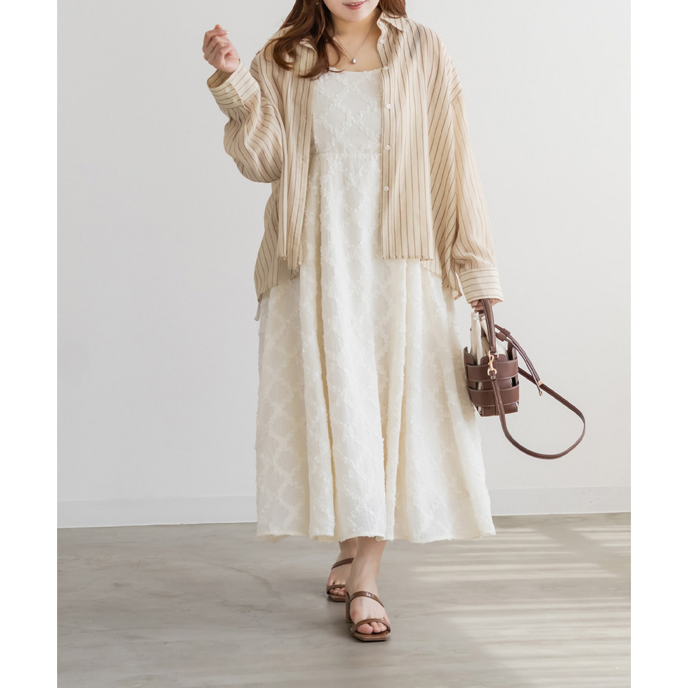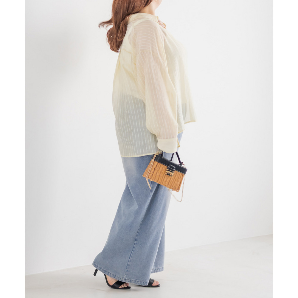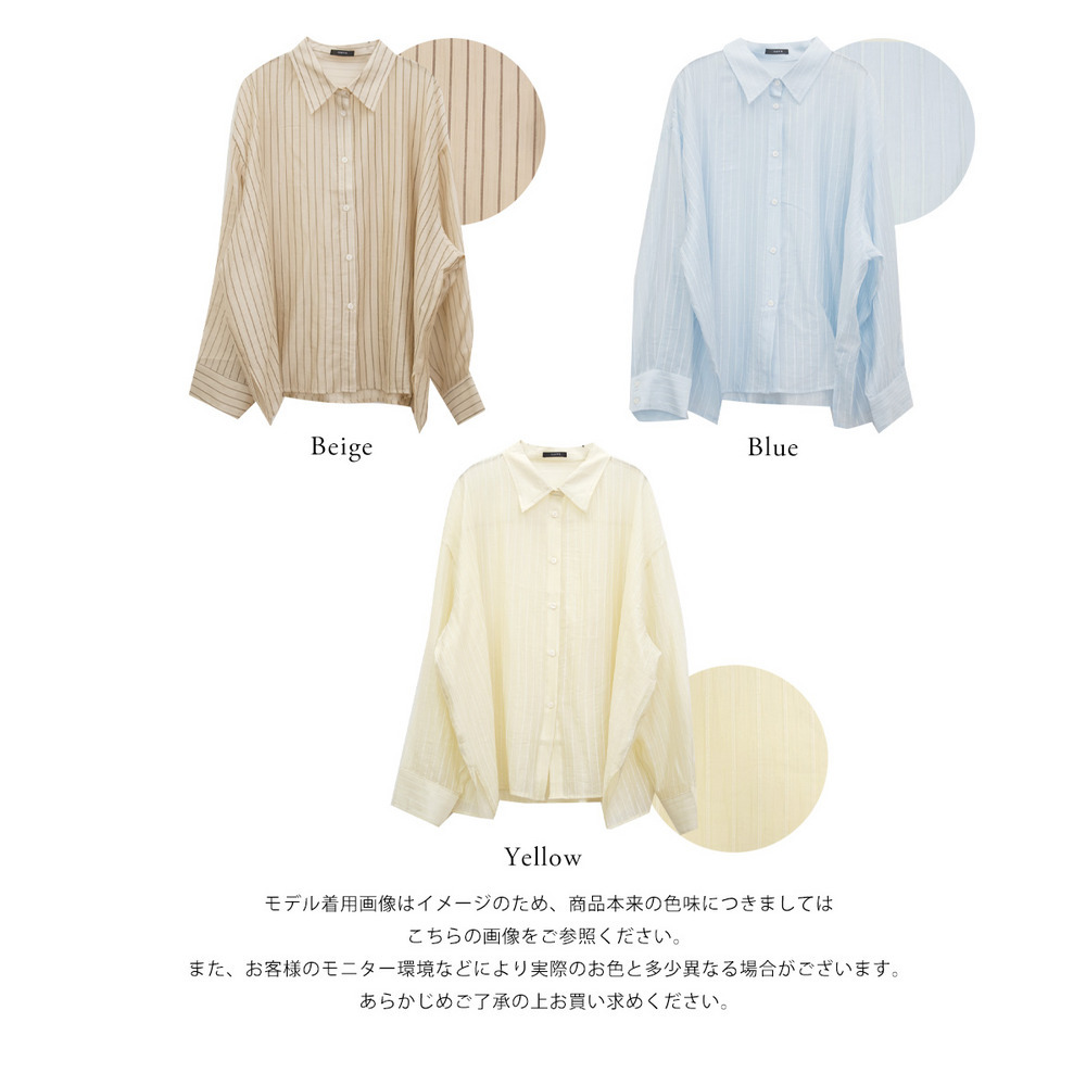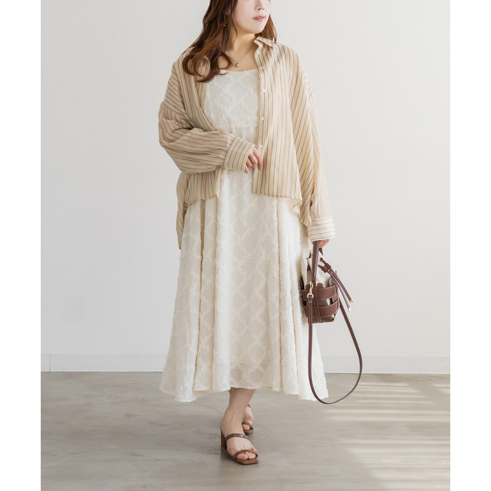 | 3Lサイズを着用しました。全体的にゆとりのあるシルエットで、ちょうどいい着心地でした。とても軽くてさらっとしたシアー素材なので、肌離れがよく夏でも涼しく着られます。透け感があることでカジュアルになりすぎず、自然と女性らしい印象に仕上がるのが嬉しいポイント♪ ヒップまで隠れる丈感なので体のラインを拾いにくく、パンツ合わせでも安心感があります。前を開けて羽織として使えば、日焼け対策や冷房対策にも◎ スカート合わせでフェミニンにも着られて、着回し力の高い1枚だと思いました。 |