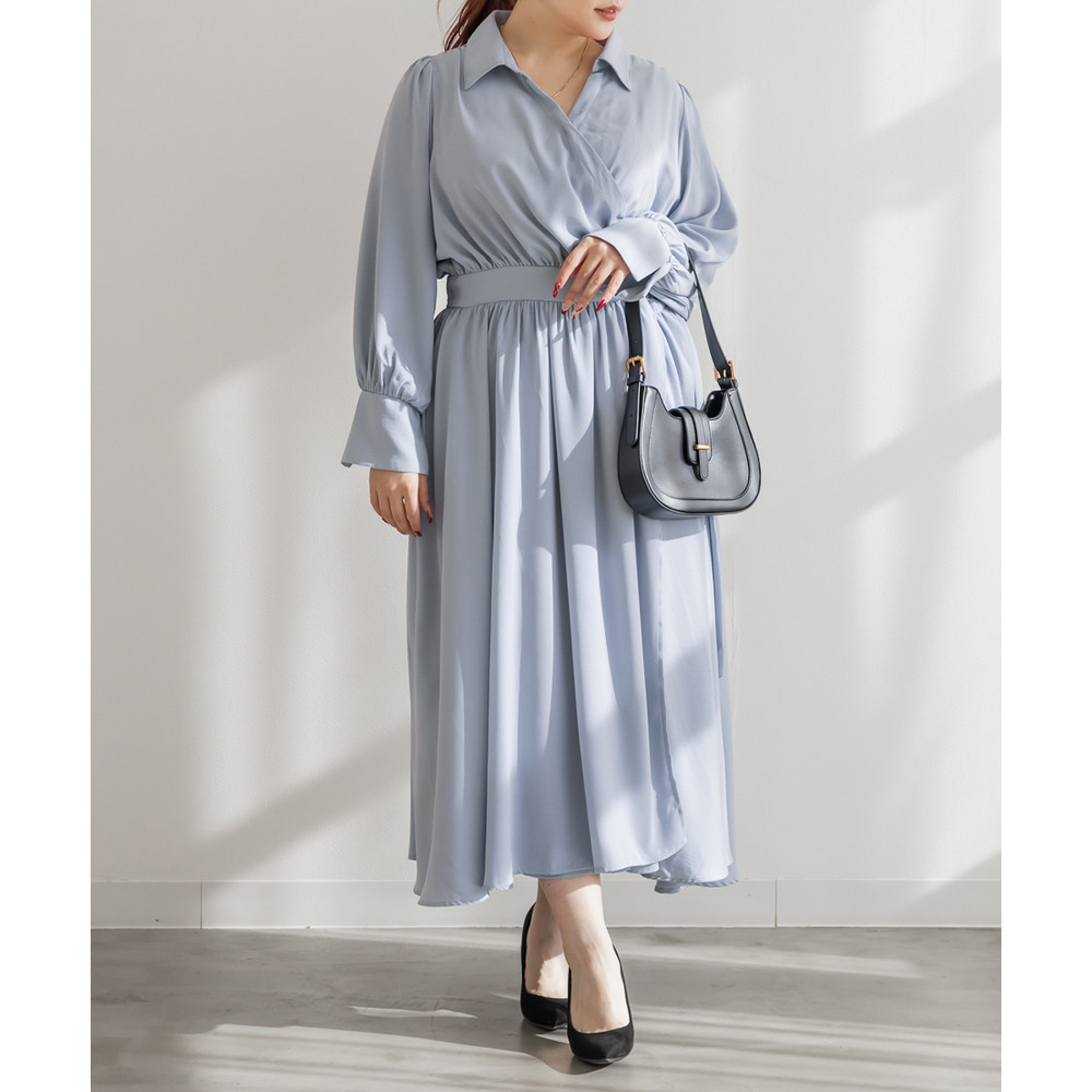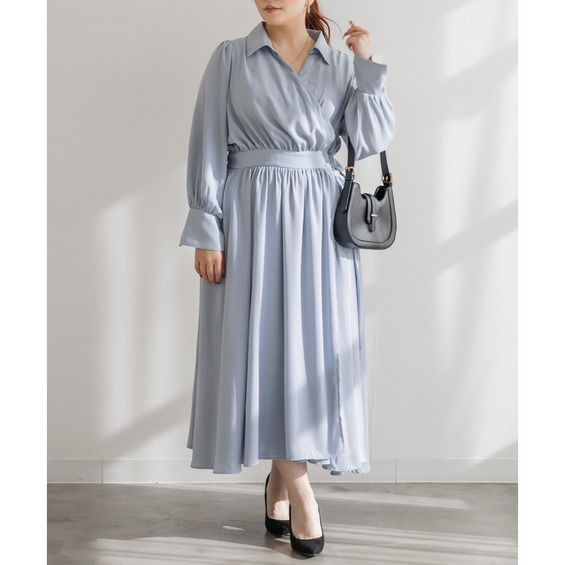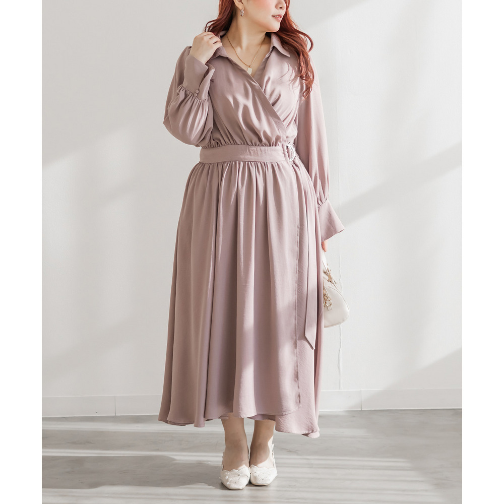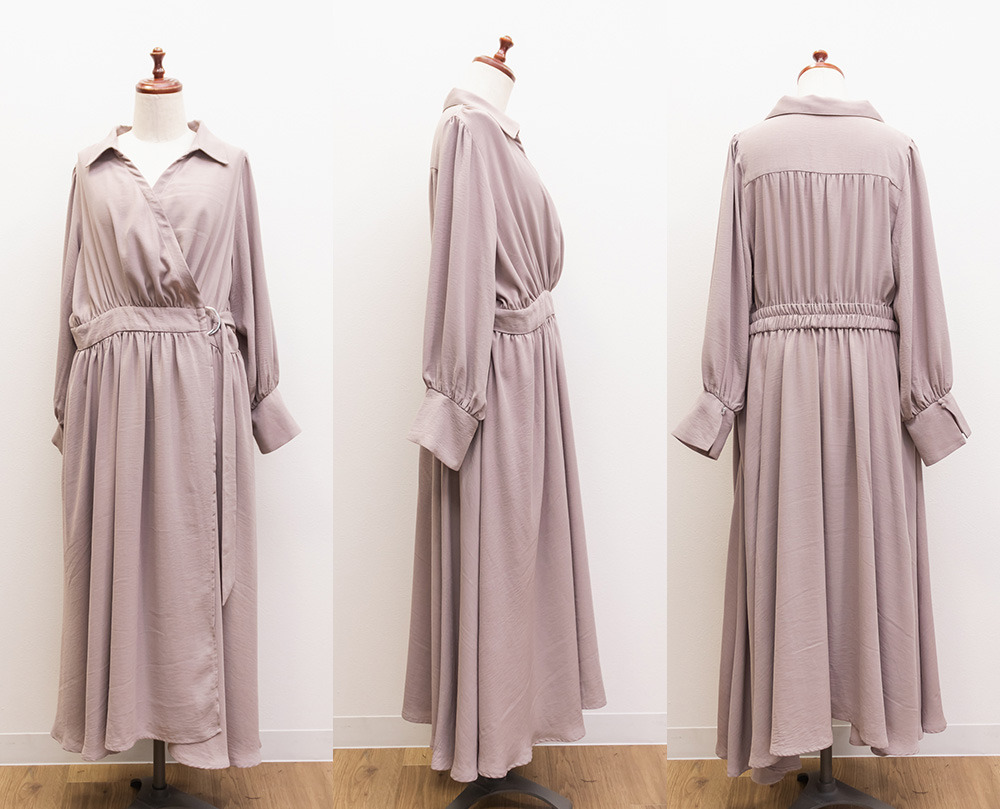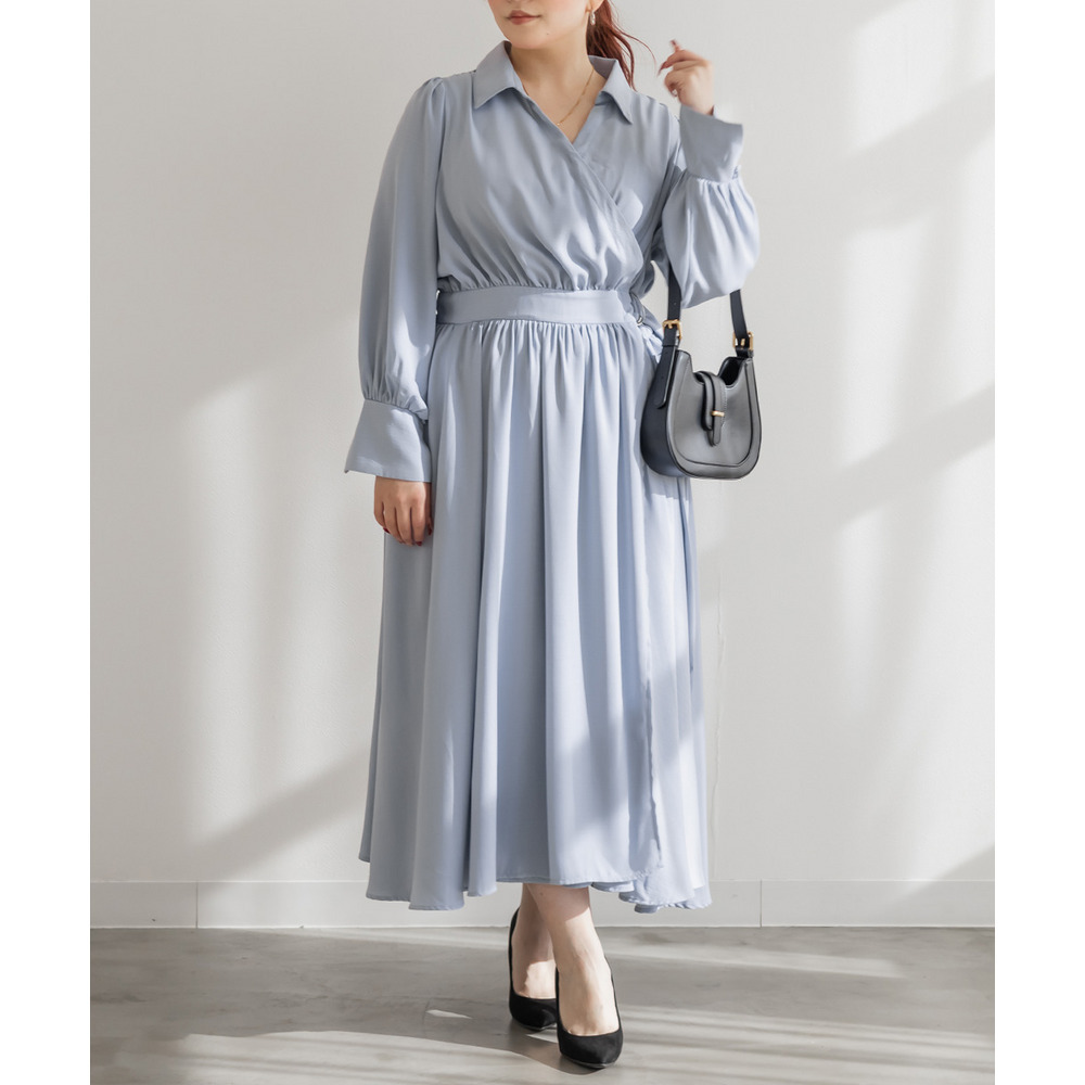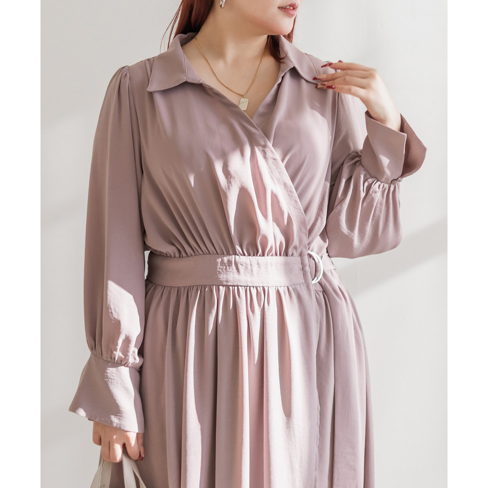 | 3Lサイズを着用しました。こちらはウエストまわりにほどよくフィット感がありつつ、ギャザーのおかげで窮屈さはなく、ちょうどいいサイズ感でした。カシュクールデザインが自然にウエストを引き締めてくれて、着るだけでメリハリのあるシルエットになるのが嬉しいです!サイドのゴールドバックルがさりげないアクセントになっていて、上品な印象です。ショートブーツやパンプスできれいめにまとめても、スニーカーで少しカジュアルに外しても可愛く、お出かけやちょっとしたお呼ばれにもおすすめの1枚です♪ |