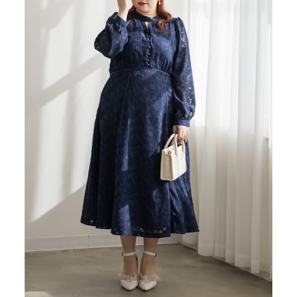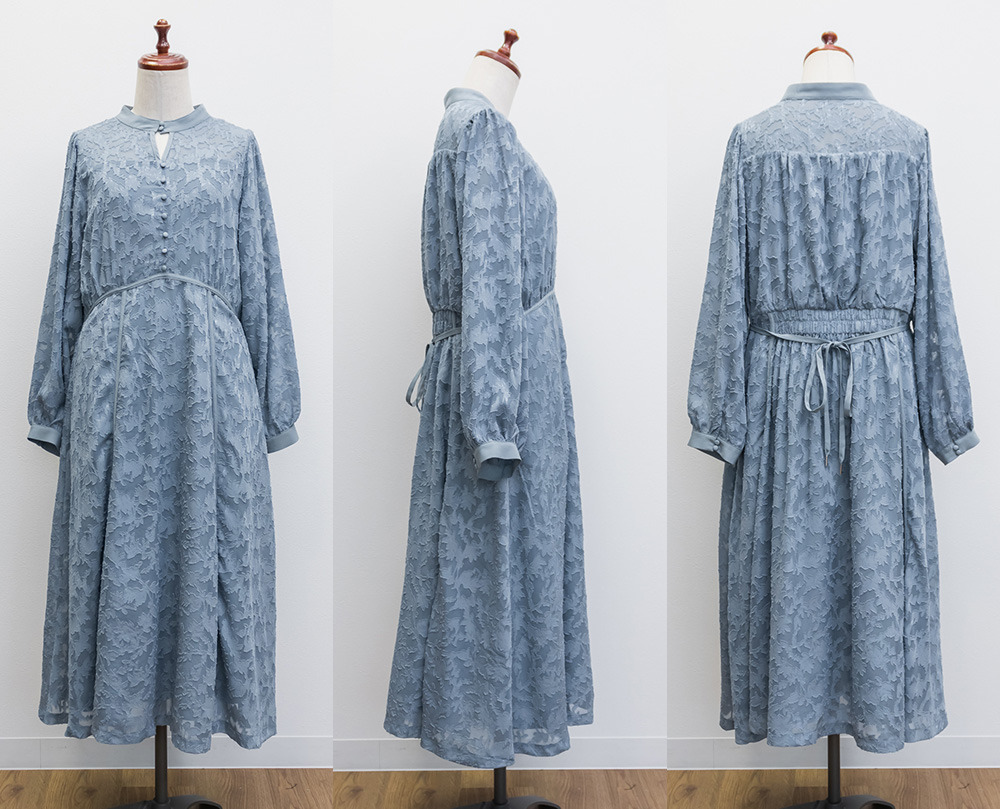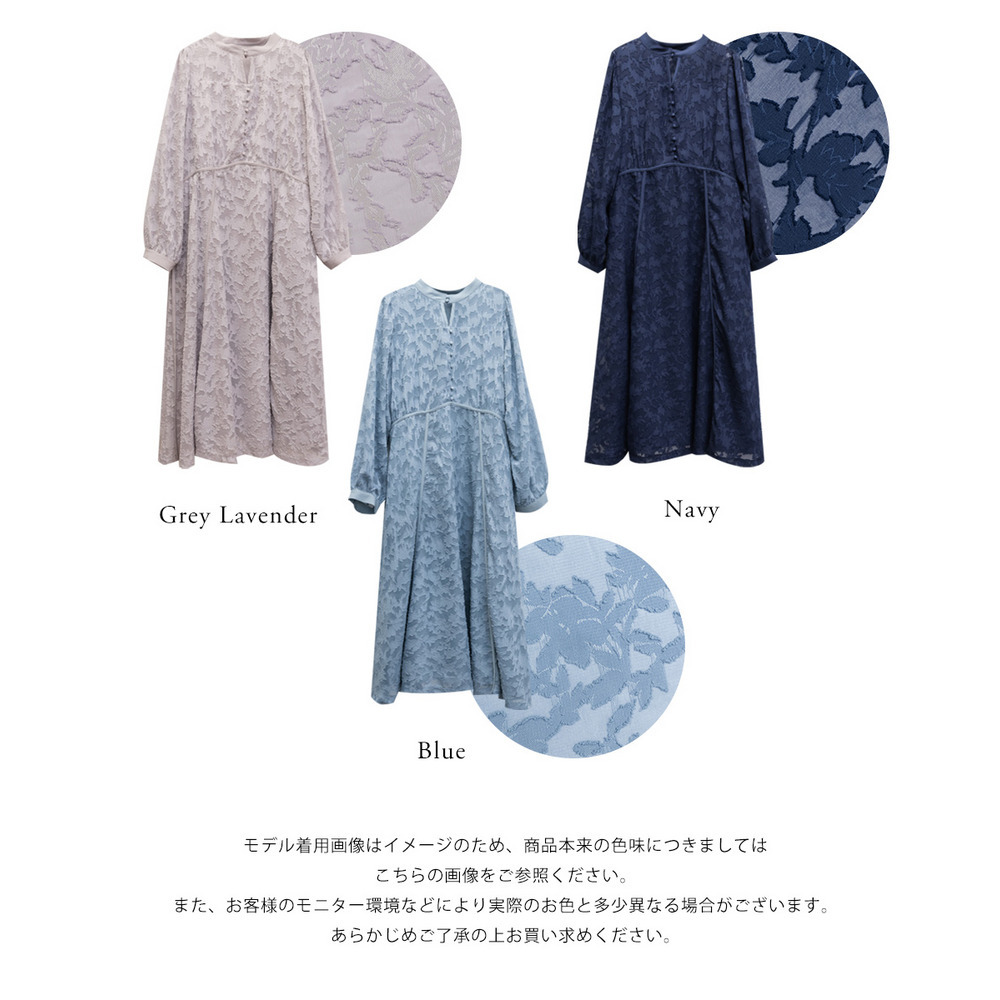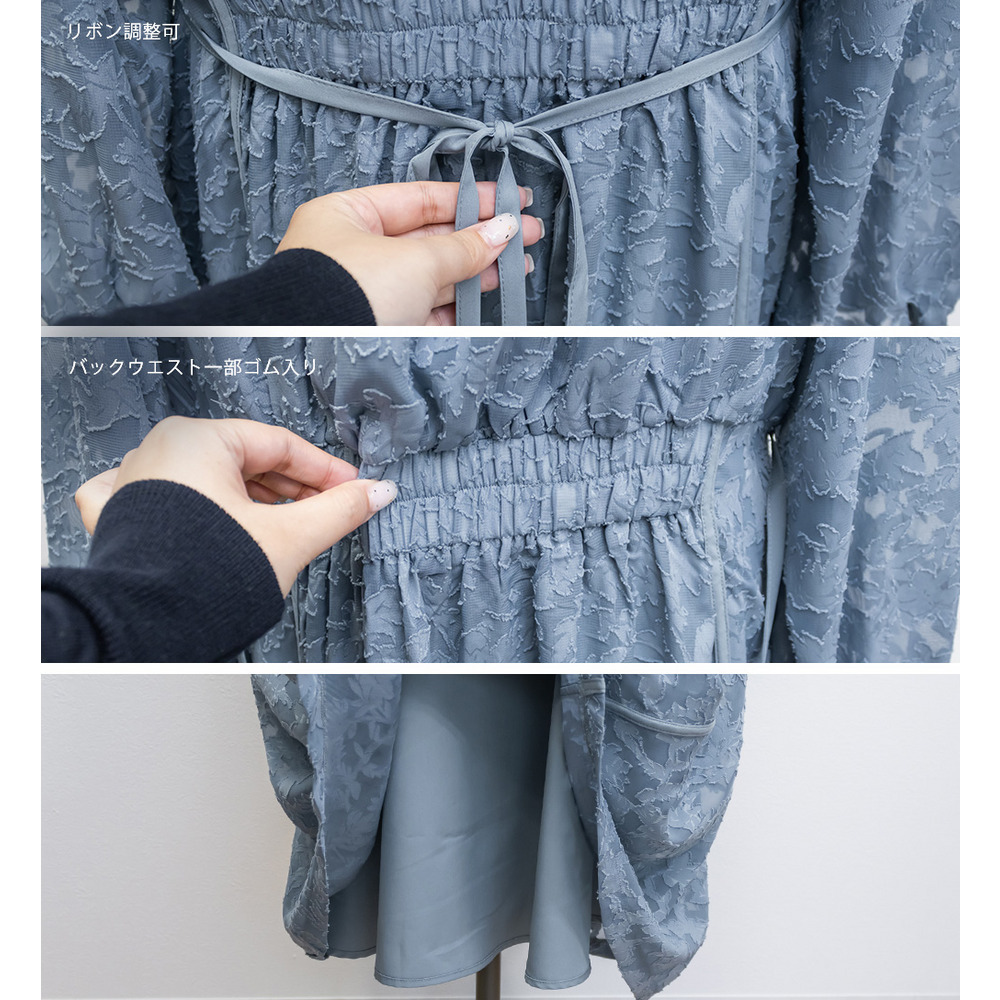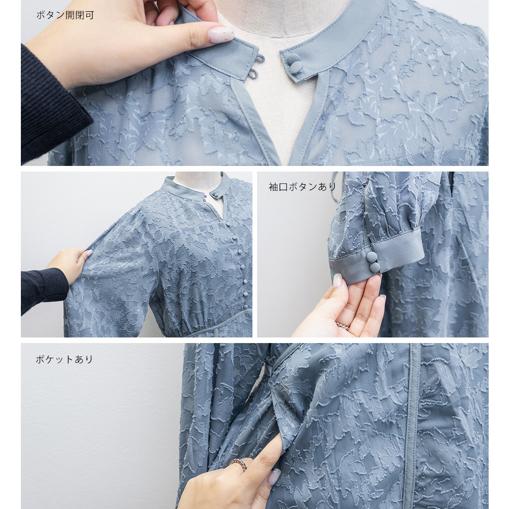 | 素材 | ■素材 【表地】ポリエステル100%、【裏地】ポリエステル95%、ポリウレタン5% ■裏地・透け感・伸縮性 裏地有り、透け感少し有り、伸縮性無し ■ポケット 有り ■生地感 透け感のあるジャガード織のような表地生地。透けている部分と柄の部分で違った表面感のある上品な素材です。身頃部分は伸縮性のないさらりとした肌触りの裏地付きです。(デコルテ&袖は裏地無し) |