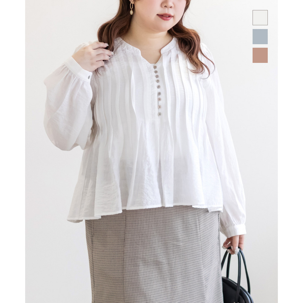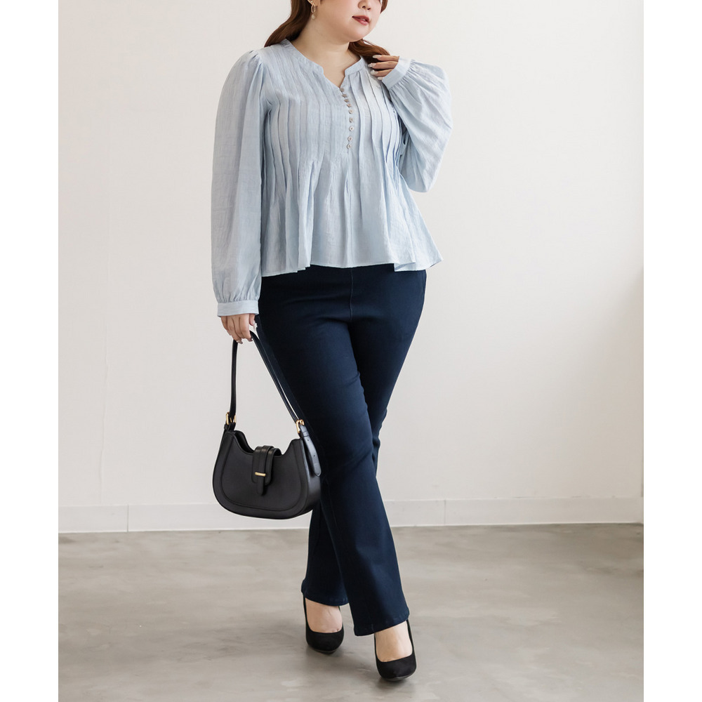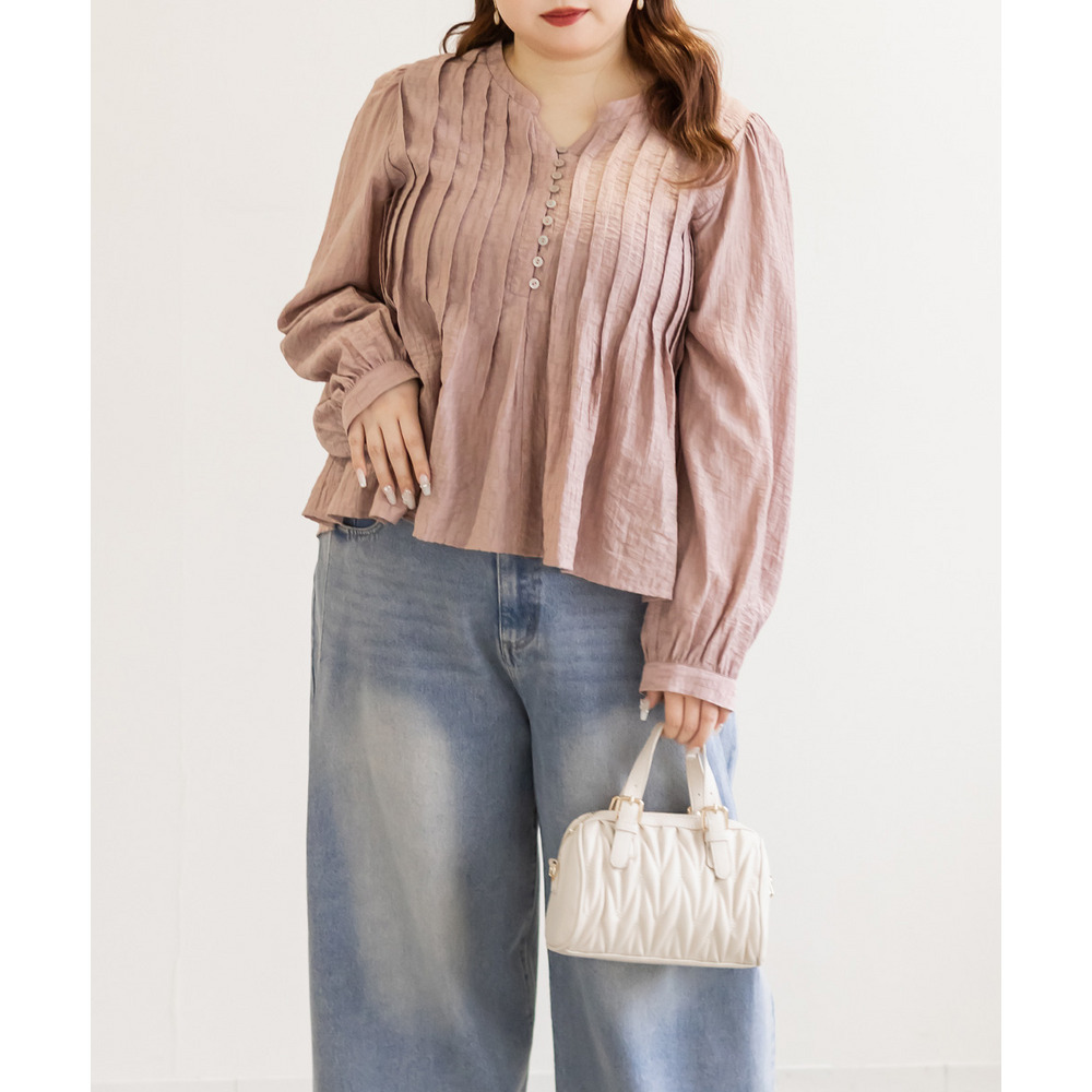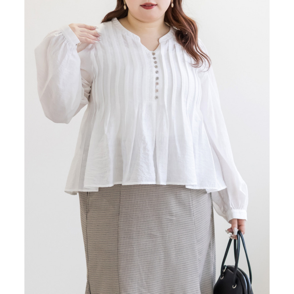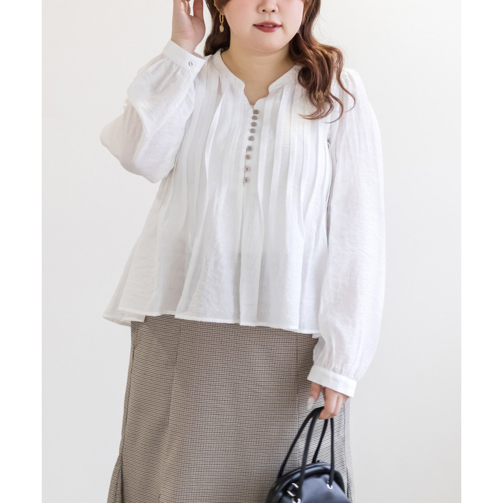 | 3Lサイズを着用しました。ウエスト・バストにゴムが無くタックでくびれてるように見えるすっきりとしたシルエットのブラウスです。伸縮性は無いので心配な方はサイズ確認をおすすめします◎ウエストラインまで入ったピンタックが縦ラインを強調してくれるので、自然とすっきり華奢見えするのが嬉しいです!お腹や腰まわりはしっかりカバーされていて安心感もあります。さらっとした軽い着心地で、ややシアーな素材感が女性らしい印象です。短め丈なのでロングスカートやパンツと合わせるとバランスよく、デイリーからお仕事にもおすすめです♪ |