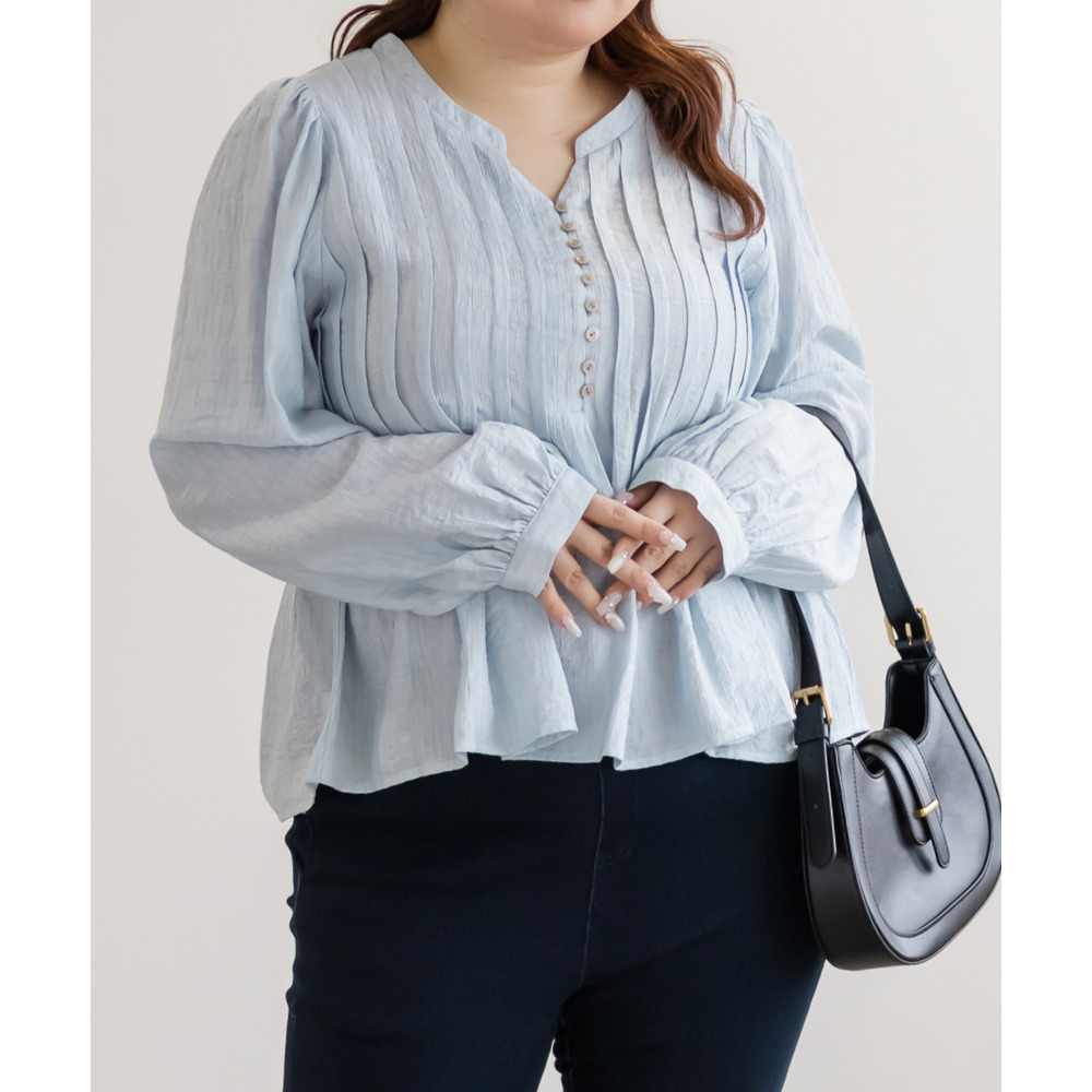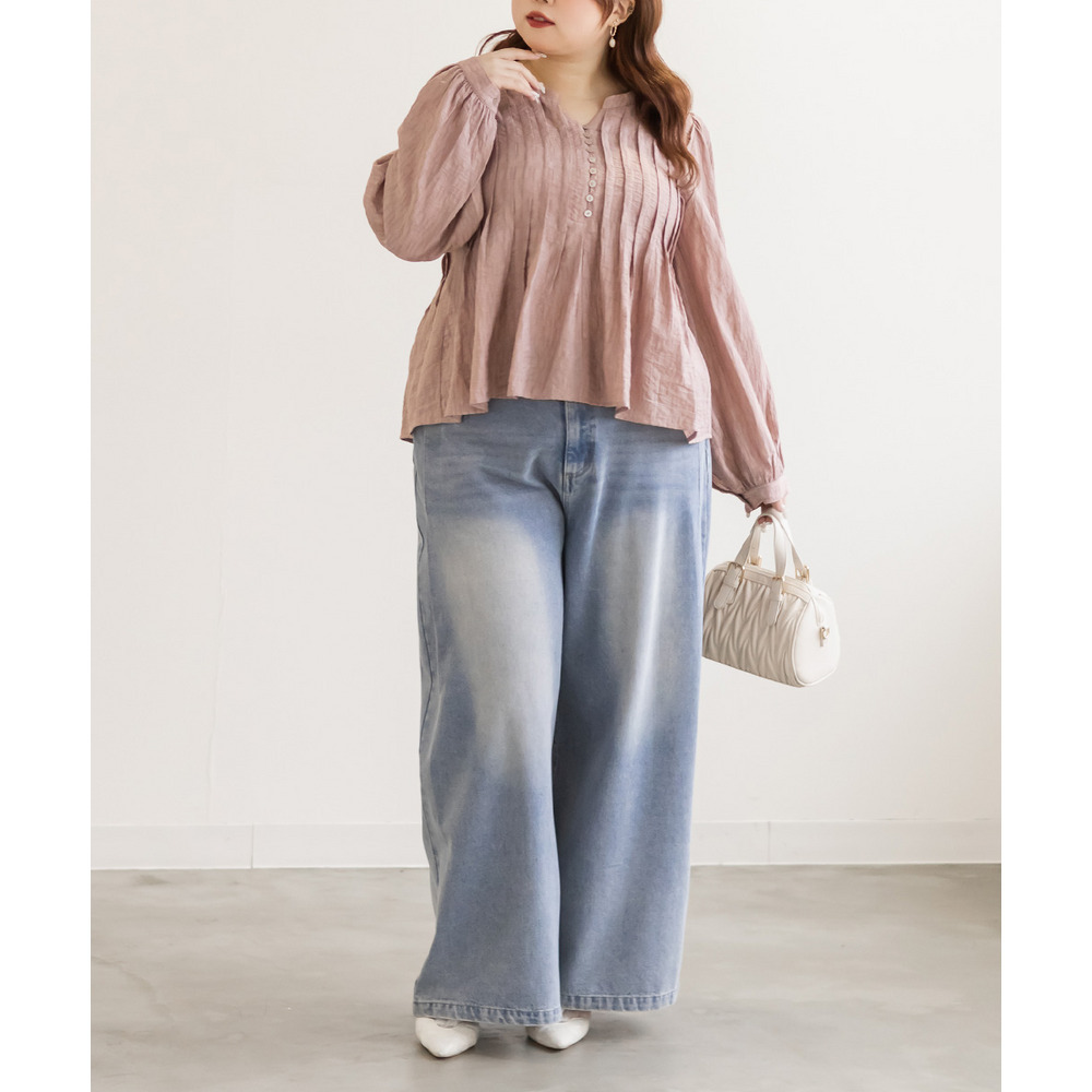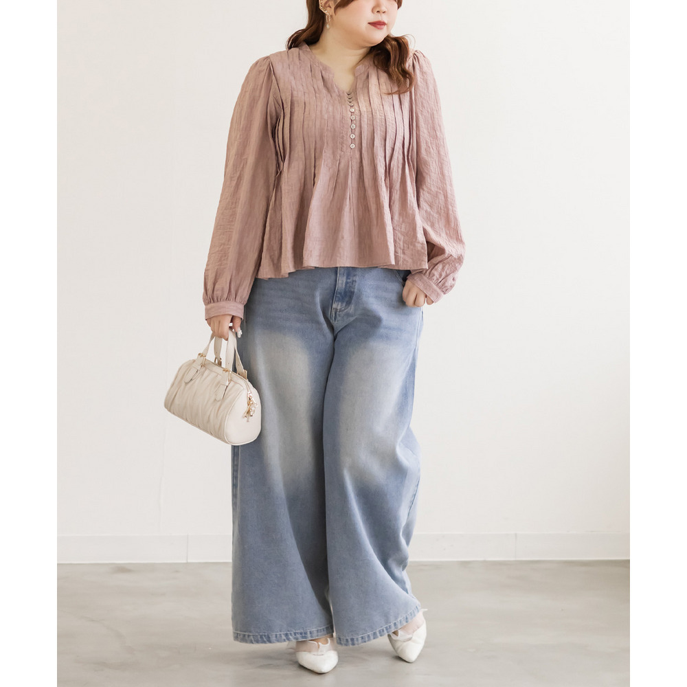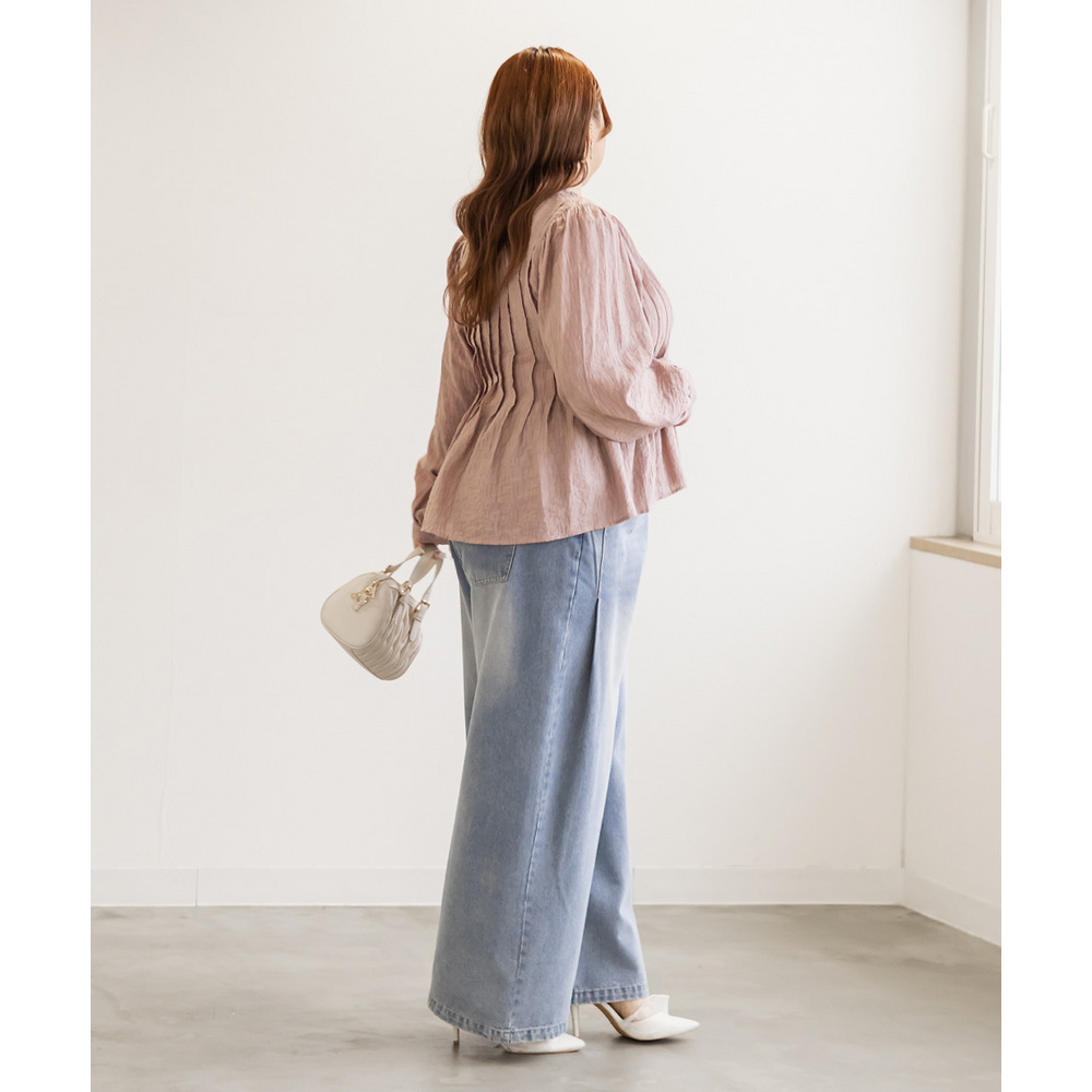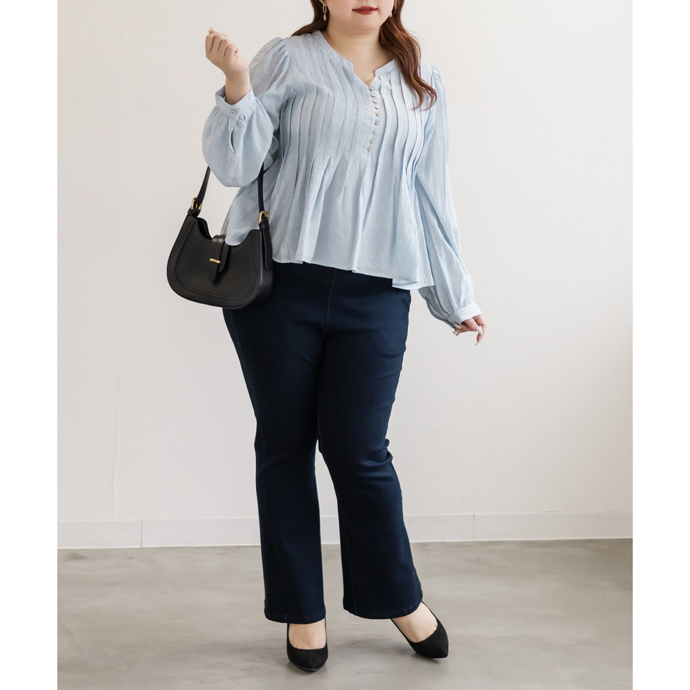 | 3Lサイズを着用しました。ウエスト・バストにゴムが無くタックでくびれてるように見えるすっきりとしたシルエットのブラウスです。伸縮性は無いので心配な方はサイズ確認をおすすめします◎ウエストラインまで入ったピンタックが縦ラインを強調してくれるので、自然とすっきり華奢見えするのが嬉しいです!お腹や腰まわりはしっかりカバーされていて安心感もあります。さらっとした軽い着心地で、ややシアーな素材感が女性らしい印象です。短め丈なのでロングスカートやパンツと合わせるとバランスよく、デイリーからお仕事にもおすすめです♪ |