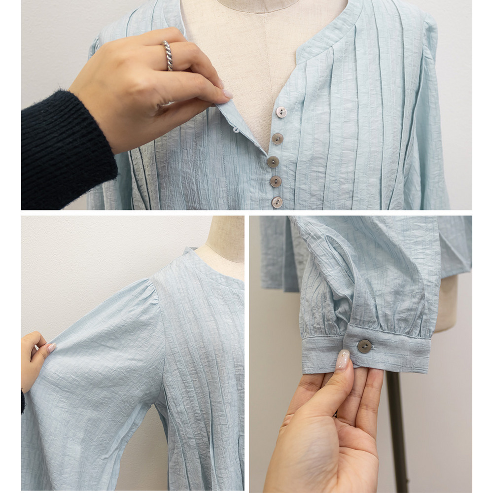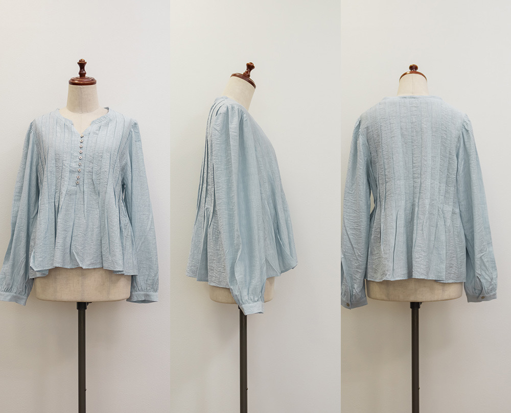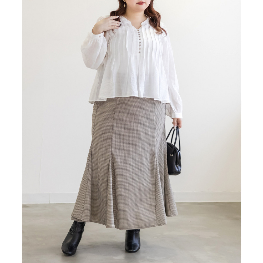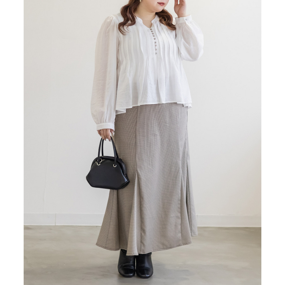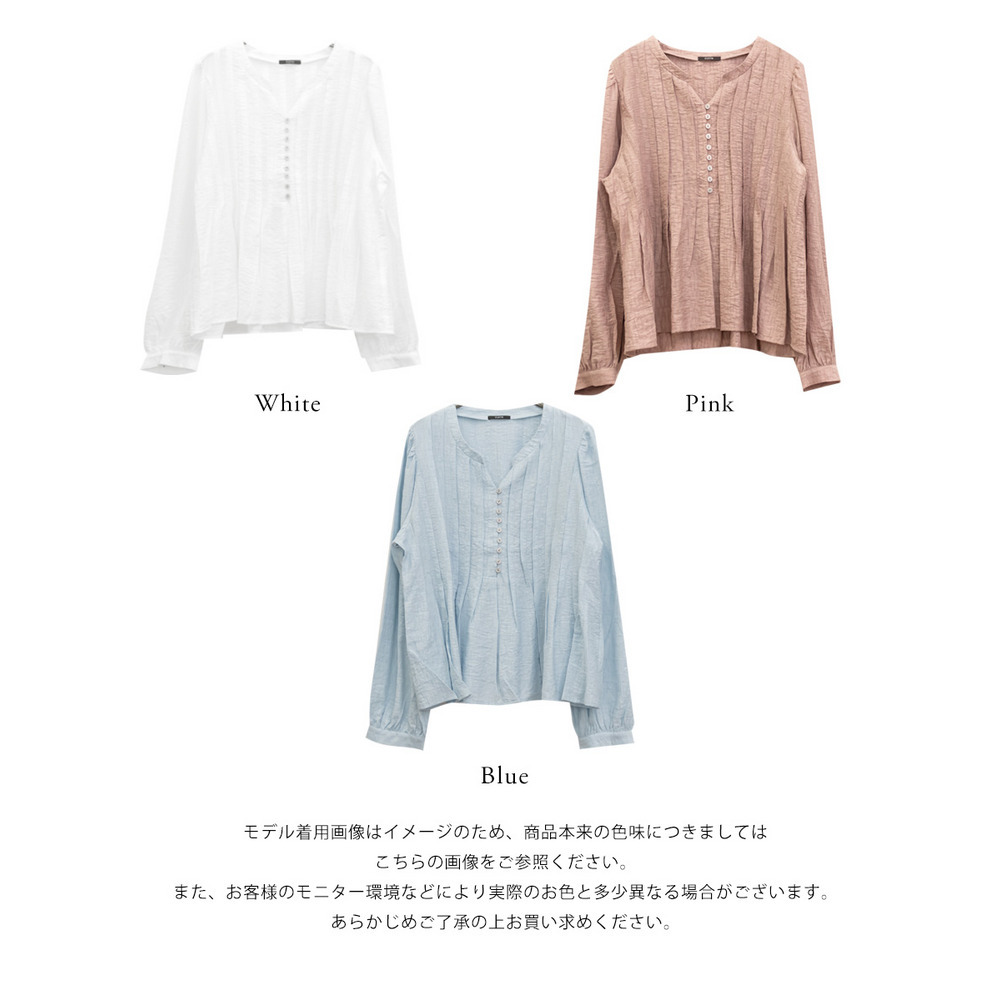 | 3Lサイズを着用しました。ウエスト・バストにゴムが無くタックでくびれてるように見えるすっきりとしたシルエットのブラウスです。伸縮性は無いので心配な方はサイズ確認をおすすめします◎ウエストラインまで入ったピンタックが縦ラインを強調してくれるので、自然とすっきり華奢見えするのが嬉しいです!お腹や腰まわりはしっかりカバーされていて安心感もあります。さらっとした軽い着心地で、ややシアーな素材感が女性らしい印象です。短め丈なのでロングスカートやパンツと合わせるとバランスよく、デイリーからお仕事にもおすすめです♪ |