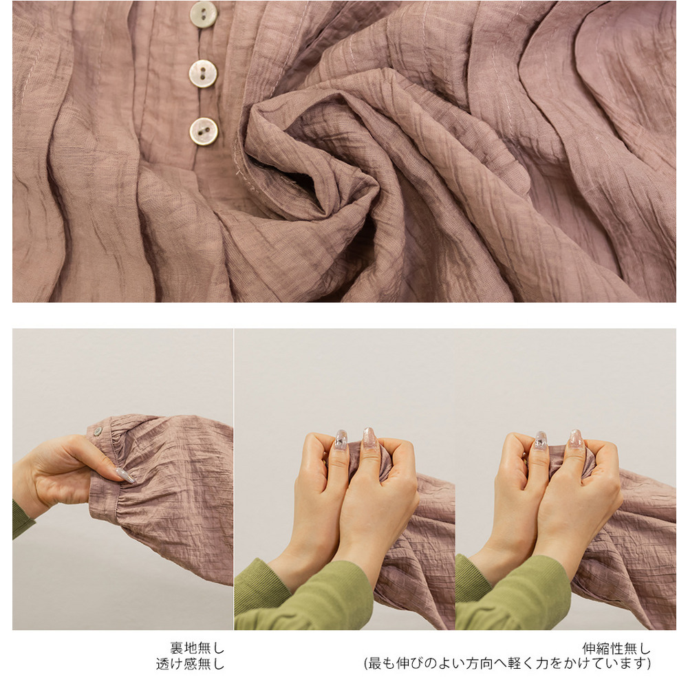 | 素材 | ■素材 レーヨン82%、ナイロン18% ■裏地・透け感・伸縮性 裏地無し、透け感少し有り、伸縮性無し ■ポケット 無し ■生地感 クレープ調で表面感のある、少し透け感のある布帛素材。伸縮性のないさらりとした肌触りです。 |