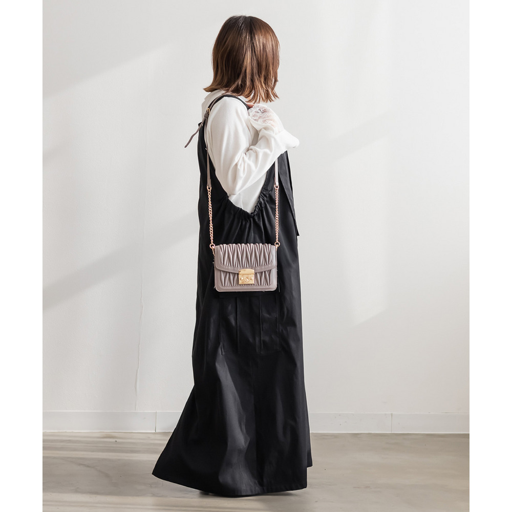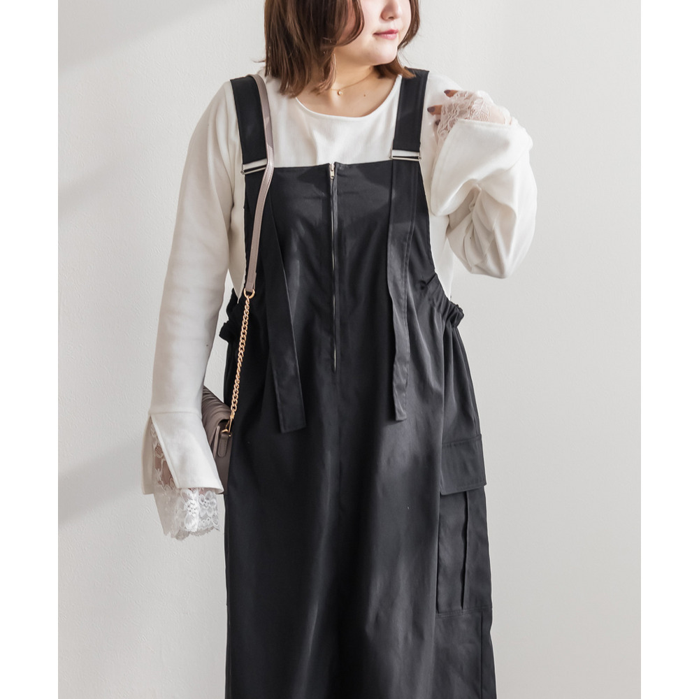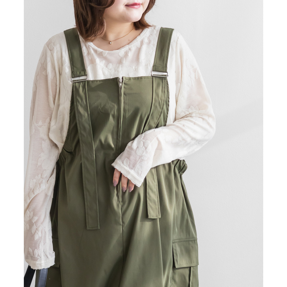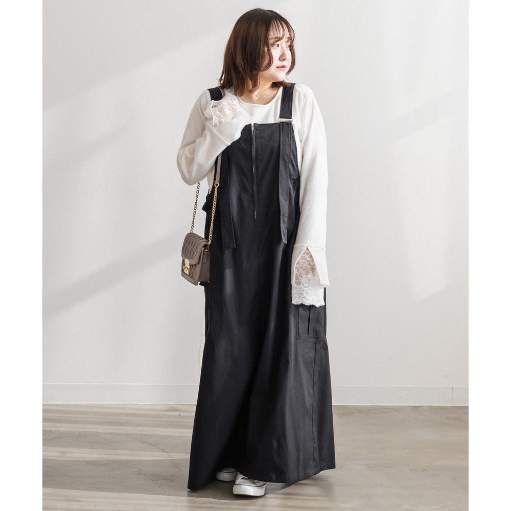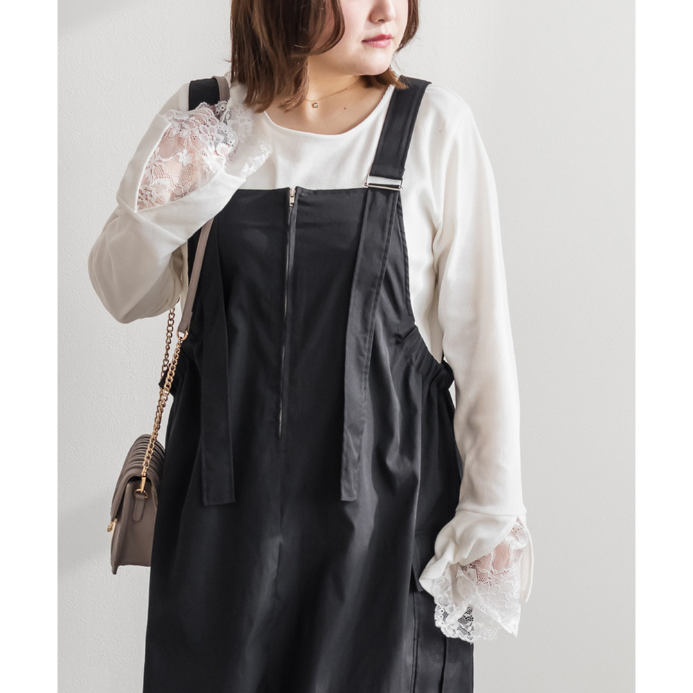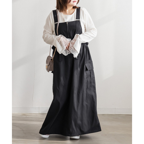 3Lサイズを着用して、程よくゆとりのあるサイズ感でした♪ ゆったりとしたシルエットですが、ストンと落ちるデザインなのでスッキリ見えます◎ 太めのストラップが肩にしっかりフィットしてくれるので安定感があり、楽な着心地でした! サイドにはポケット付きで機能性も抜群♪ 軽やかな生地感でロングシーズン使えるのも嬉しいポイントです。 今回はレーストップスと合わせてフェミニンにしましたが、Tシャツやスウェットを合わせてカジュアルに着こなすのもおすすめです! スニーカーやブーツなど、足元のアレンジで印象を変えられる万能ジャンスカワンピです♪