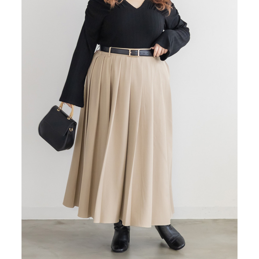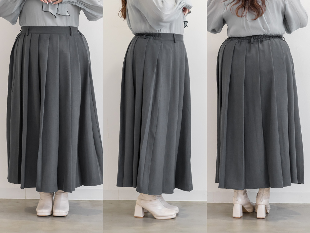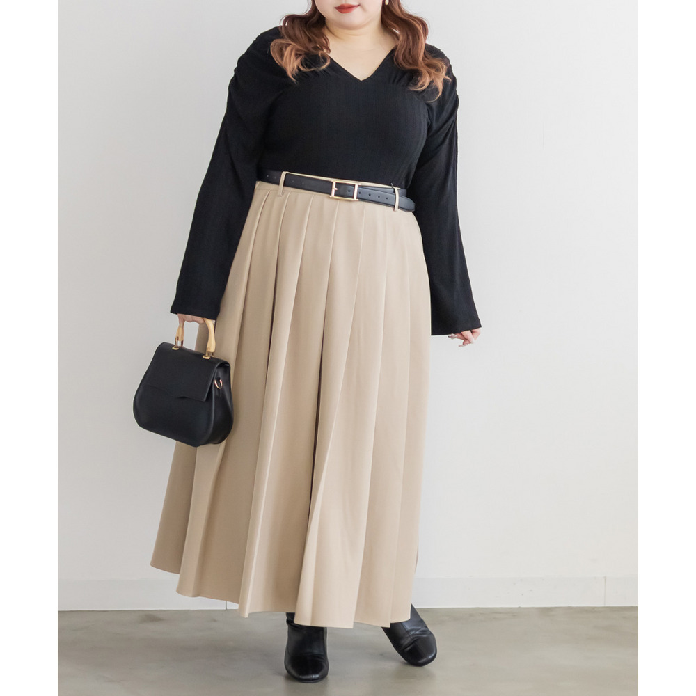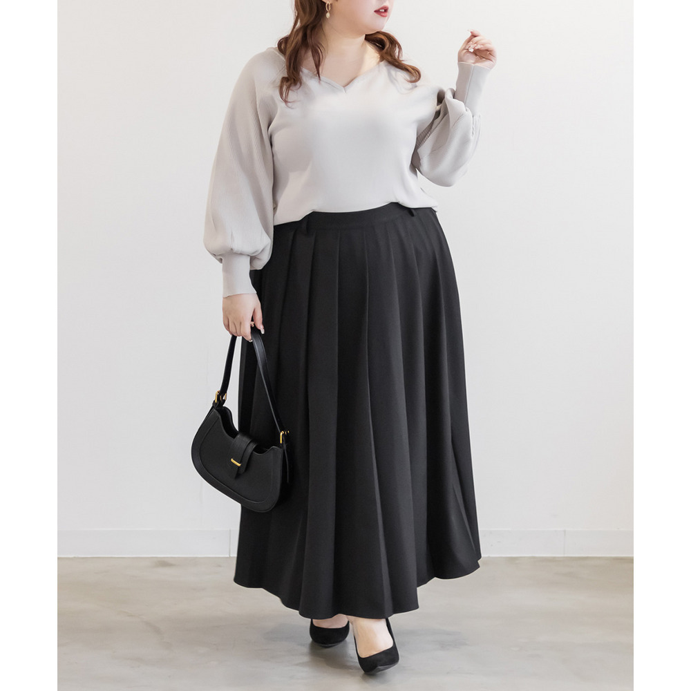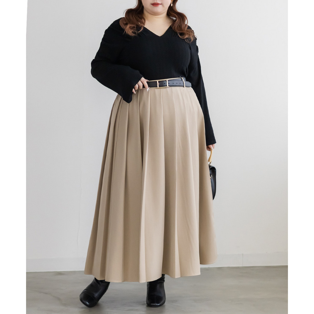 | 3Lサイズを着用しました。ウエストは後ろゴム仕様で楽に穿けるのに、プリーツの落ち感がきれいで上品見えします。トレンドコーデにぴったりです!ウエストからきれいに広がるプリーツスカートがお腹周りや腰回りをカバーしてくれて、ブーツ合わせはもちろん、フラットシューズでもヒールでもバランスよく合わせられそうです!きれいめにもカジュアルにも使えて、オンオフ問わず活躍してくれるスカートです! |