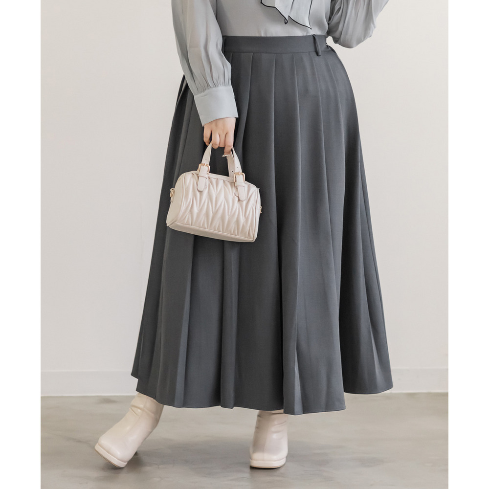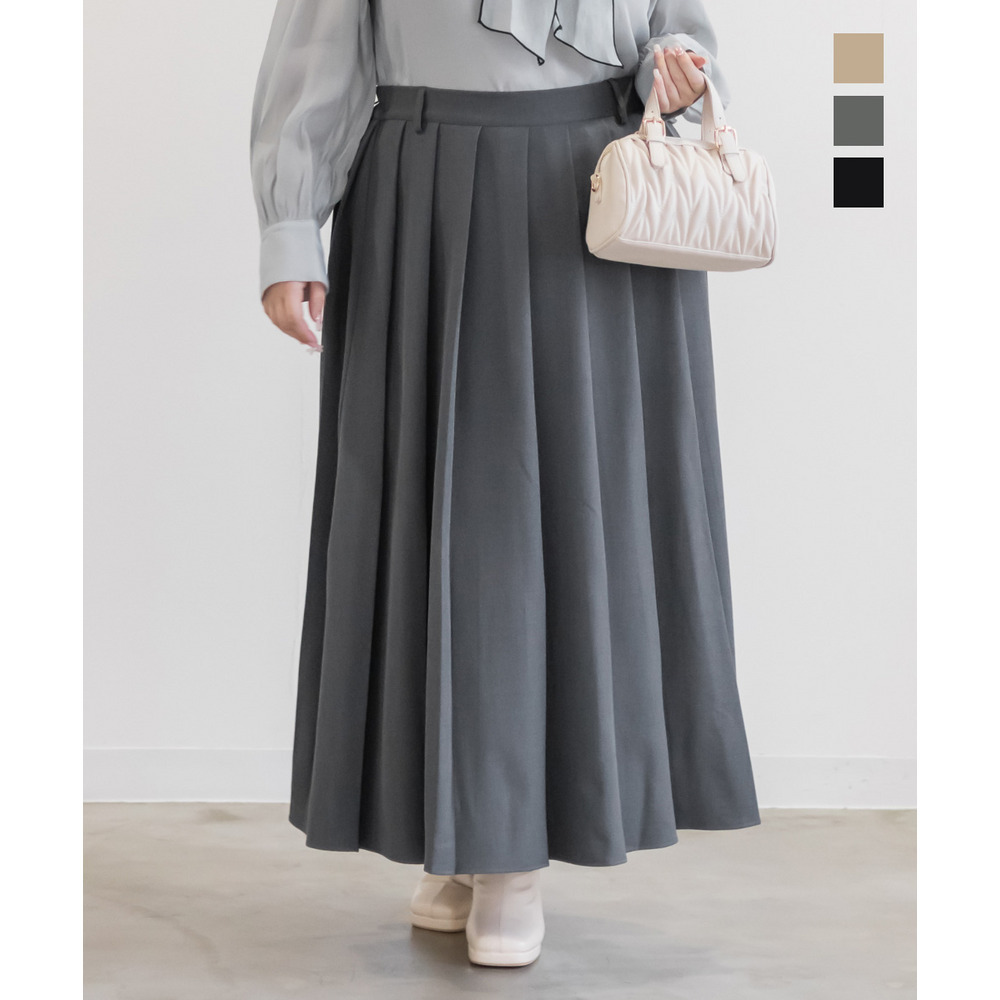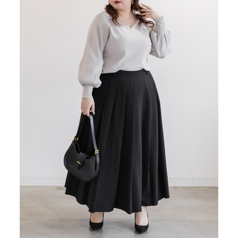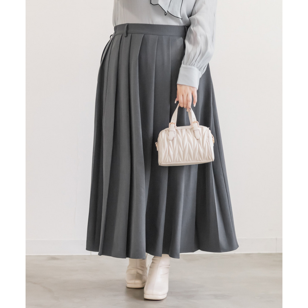 | 3Lサイズを着用しました。ウエストは後ろゴム仕様で楽に穿けるのに、プリーツの落ち感がきれいで上品見えします。トレンドコーデにぴったりです!ウエストからきれいに広がるプリーツスカートがお腹周りや腰回りをカバーしてくれて、ブーツ合わせはもちろん、フラットシューズでもヒールでもバランスよく合わせられそうです!きれいめにもカジュアルにも使えて、オンオフ問わず活躍してくれるスカートです! |