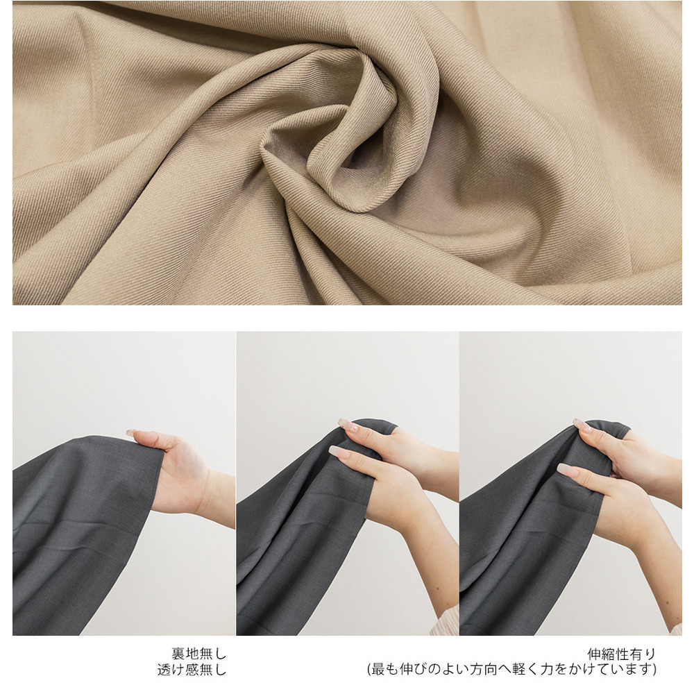 | 素材 | ■素材 ポリエステル95%、ポリウレタン5% ■裏地・透け感・伸縮性 裏地無し、透け感無し、伸縮性有り ■生地感 程よくしっかりとした素材です。 |