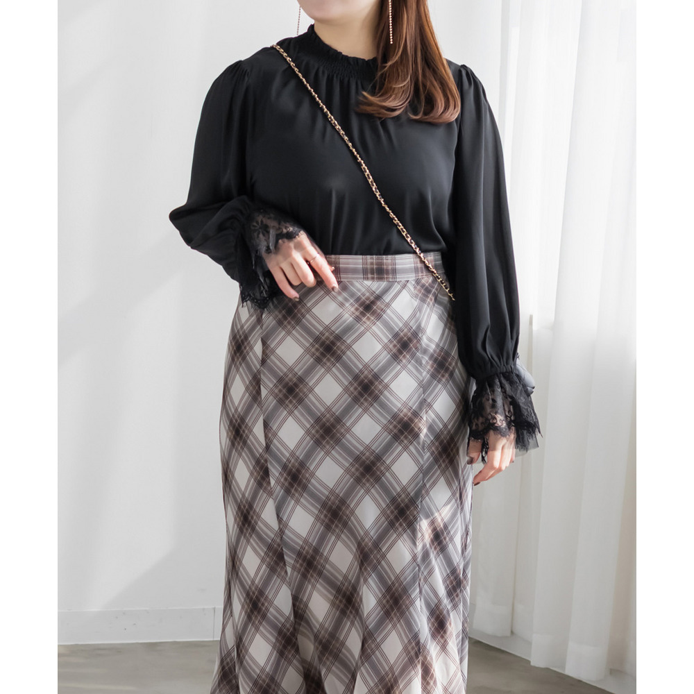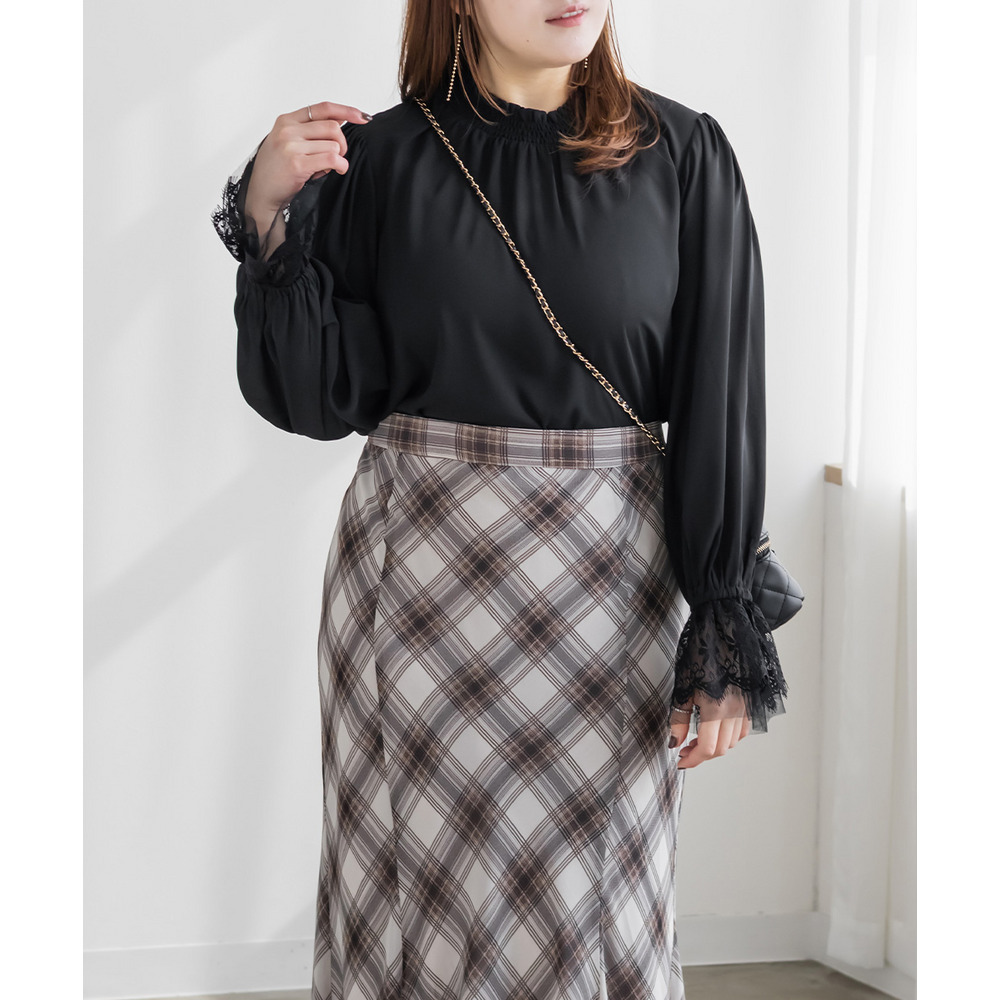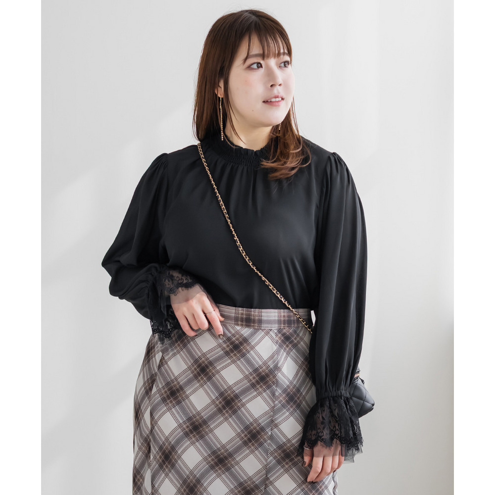 3Lサイズを着用しました。身幅や肩まわりに程よくゆとりがあり、ちょうどいい着心地でした。襟元はシャーリング仕様なので窮屈感がなく、首まわりも楽に着られます。袖のレースがさりげなく華やかで、1枚でフェミニンな印象に仕上がるのが嬉しいポイント♪身頃はすっきり見えつつ、体のラインを拾いすぎないので安心感があります。スカート合わせで甘めにも、パンツ合わせで大人っぽくも着られて、オンオフ問わず活躍してくれそうなブラウスだと思いました◎