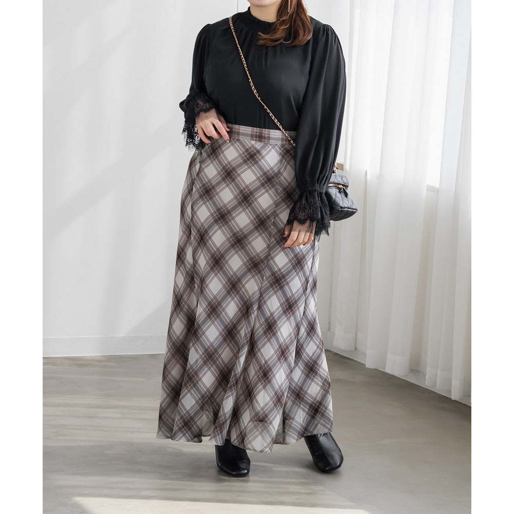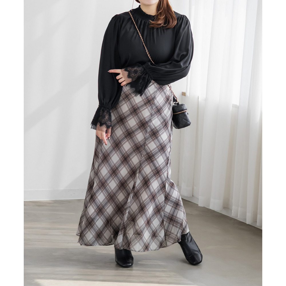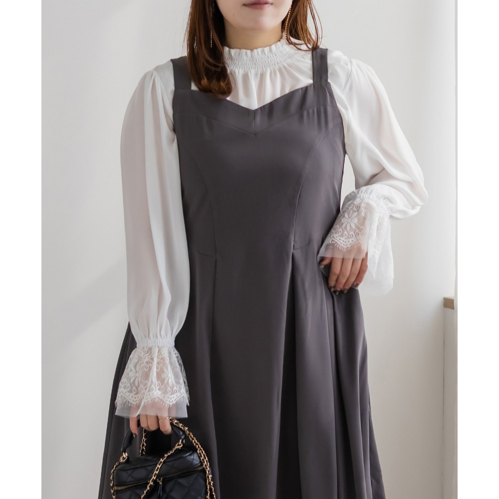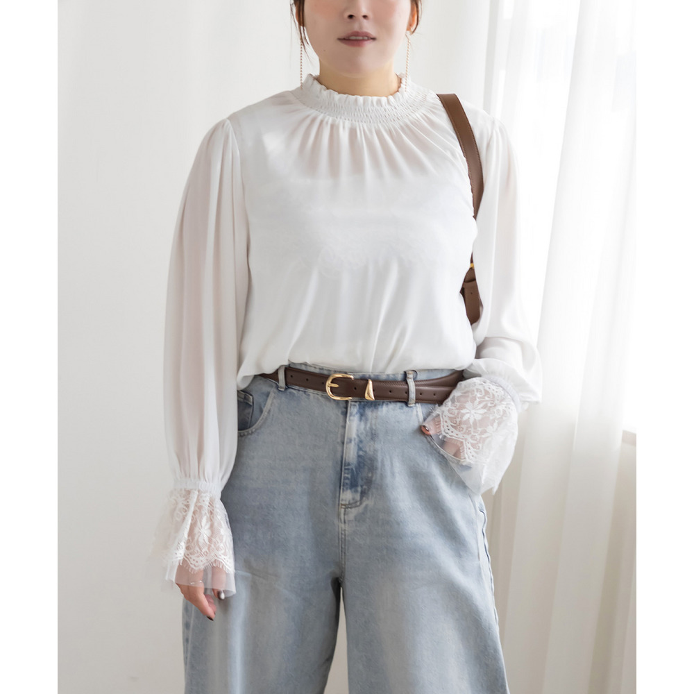 3Lサイズを着用しました。身幅や肩まわりに程よくゆとりがあり、ちょうどいい着心地でした。襟元はシャーリング仕様なので窮屈感がなく、首まわりも楽に着られます。袖のレースがさりげなく華やかで、1枚でフェミニンな印象に仕上がるのが嬉しいポイント♪身頃はすっきり見えつつ、体のラインを拾いすぎないので安心感があります。スカート合わせで甘めにも、パンツ合わせで大人っぽくも着られて、オンオフ問わず活躍してくれそうなブラウスだと思いました◎