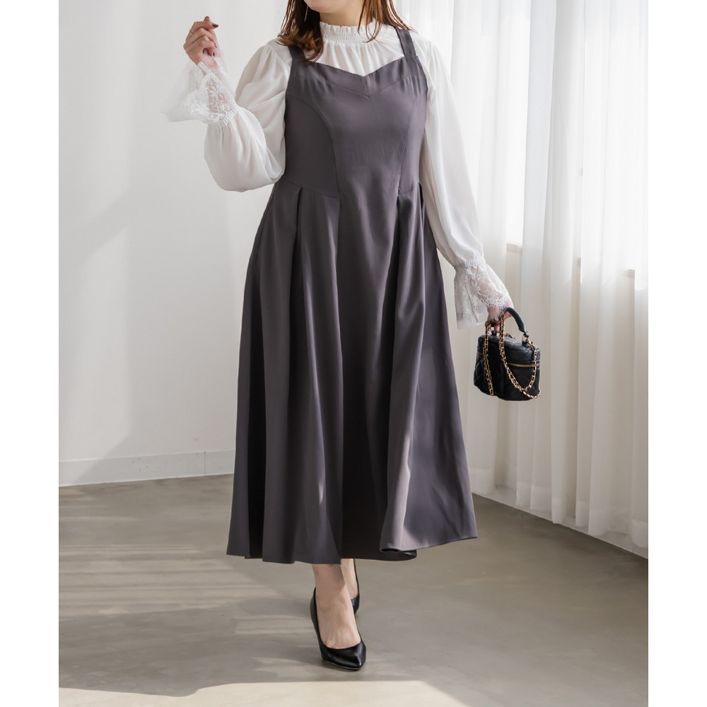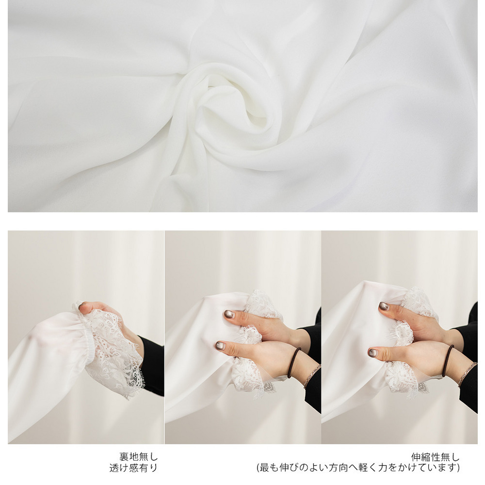 素材 ■素材 【本体】ポリエステル100%、【レース】ポリエステル100% ■裏地・透け感・伸縮性 裏地無し、透け感少し有り、伸縮性無し ■ポケット 無し ■生地感 伸縮性のない薄手のジョーゼット生地。