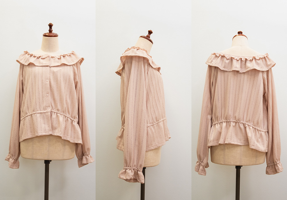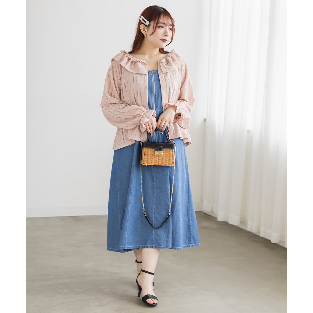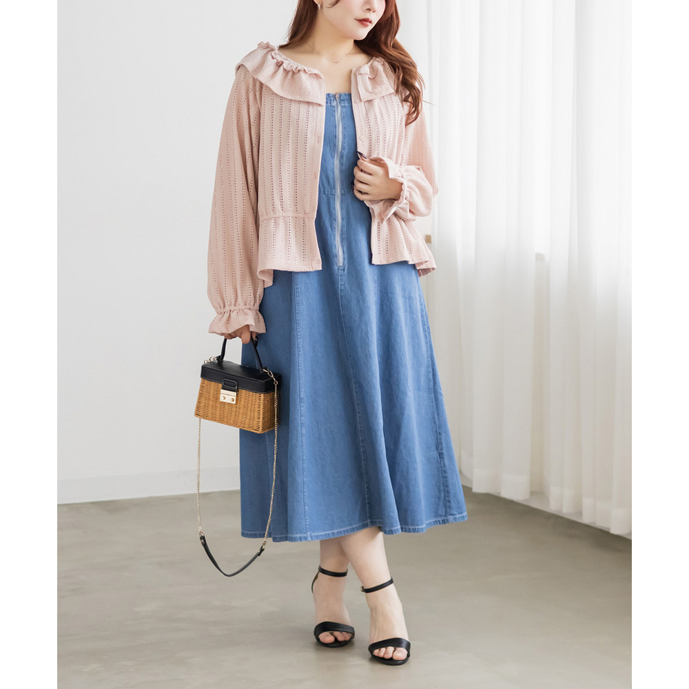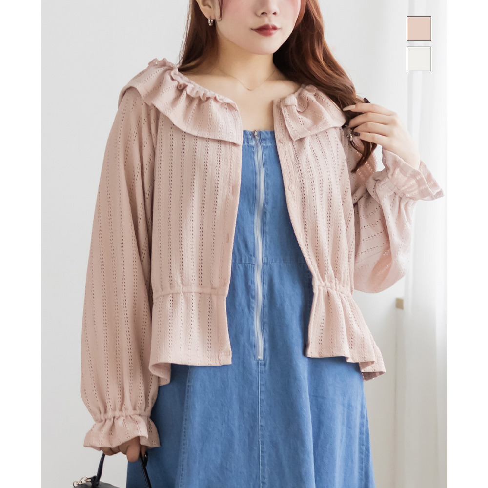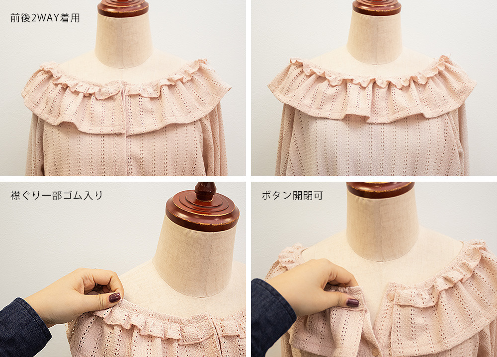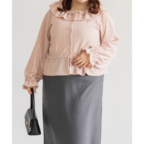 3Lサイズを着用しました。身頃や腕まわりに程よくゆとりがあり、全体的にちょうどいい着心地でした。フリルデザインがさりげなく華やかで、着るだけでフェミニンな雰囲気に仕上がるのが嬉しいポイントです♪ 前後2WAYで着られるデザインなので、その日のコーデや気分に合わせて着こなしを変えられるのも魅力でした。ボタンを前にしてカーディガンとして羽織るのはもちろん、プルオーバー風に着るのも可愛くておすすめです◎ パンツにもスカートにも合わせやすく、デイリーコーデに取り入れやすいアイテムだと思いました。