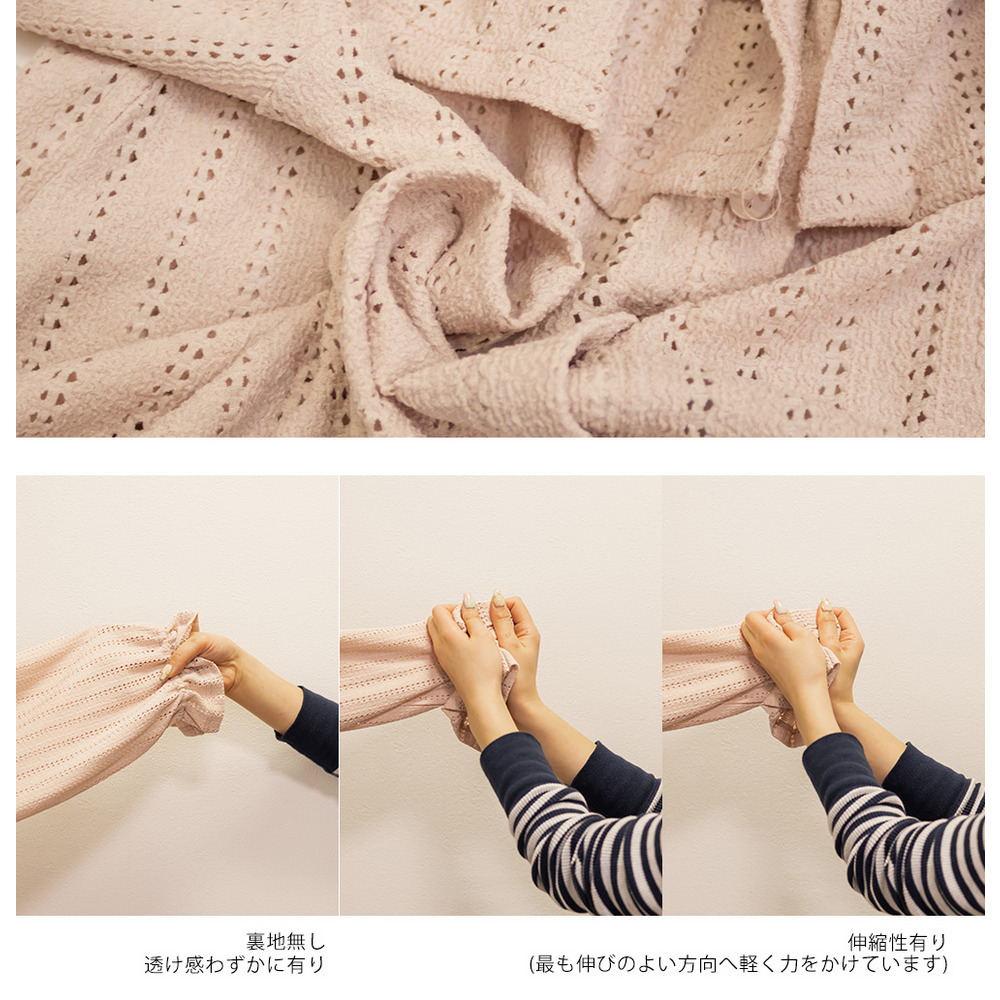 素材 ■素材 ポリエステル97%、ポリウレタン3% ■裏地・透け感・伸縮性 裏地無し、透け感少し有り、伸縮性有り ■ポケット 無し ■生地感 やや表面感のある柔らかな素材です。
