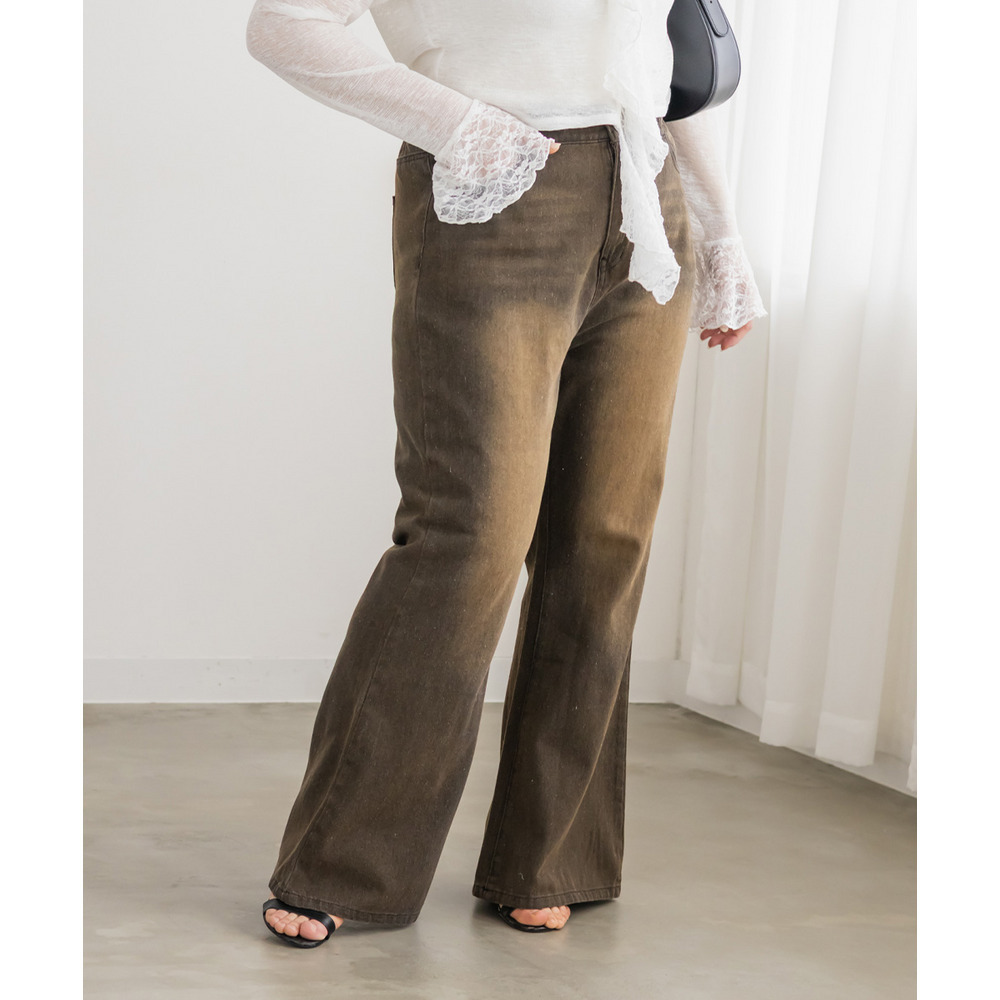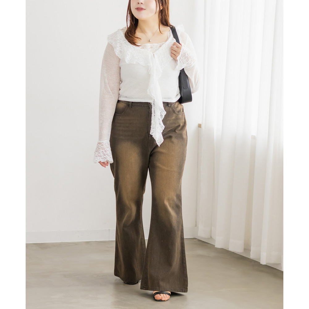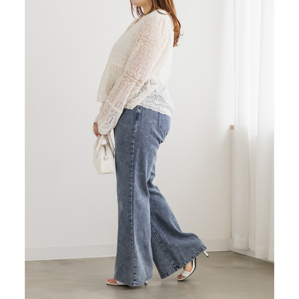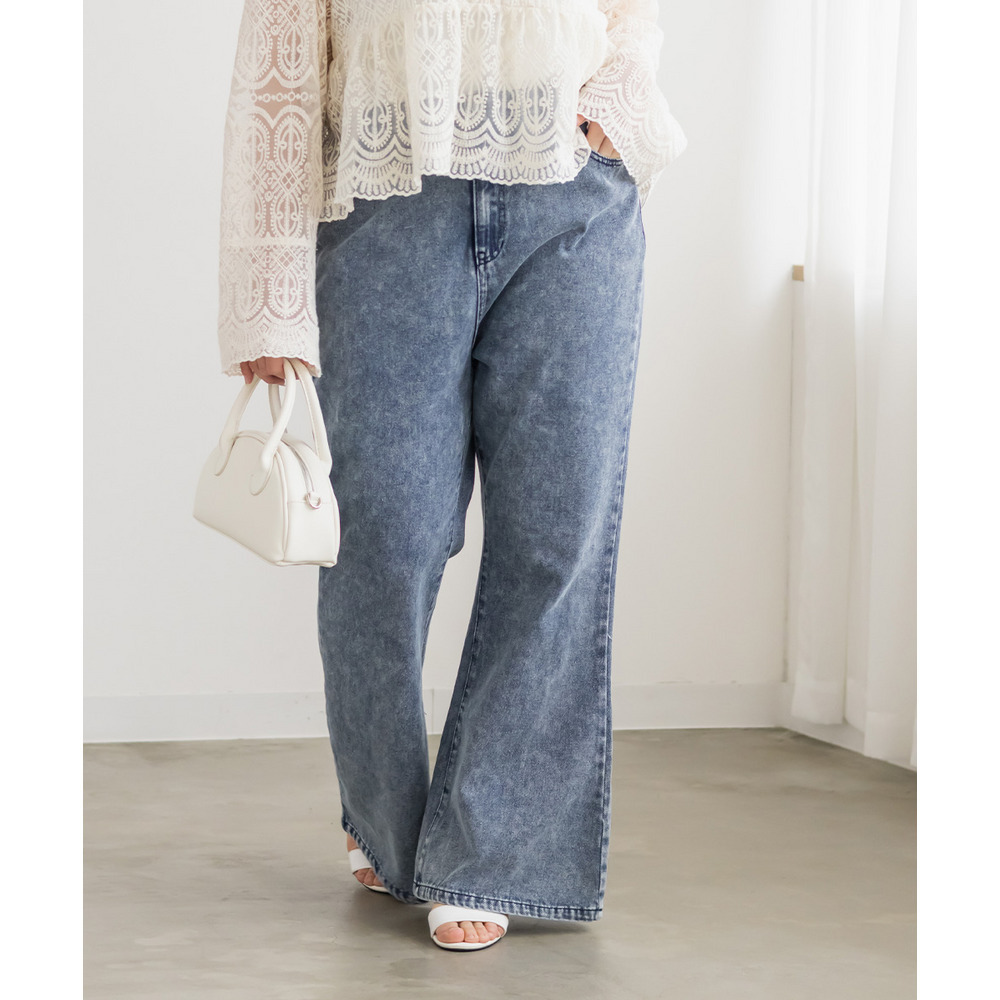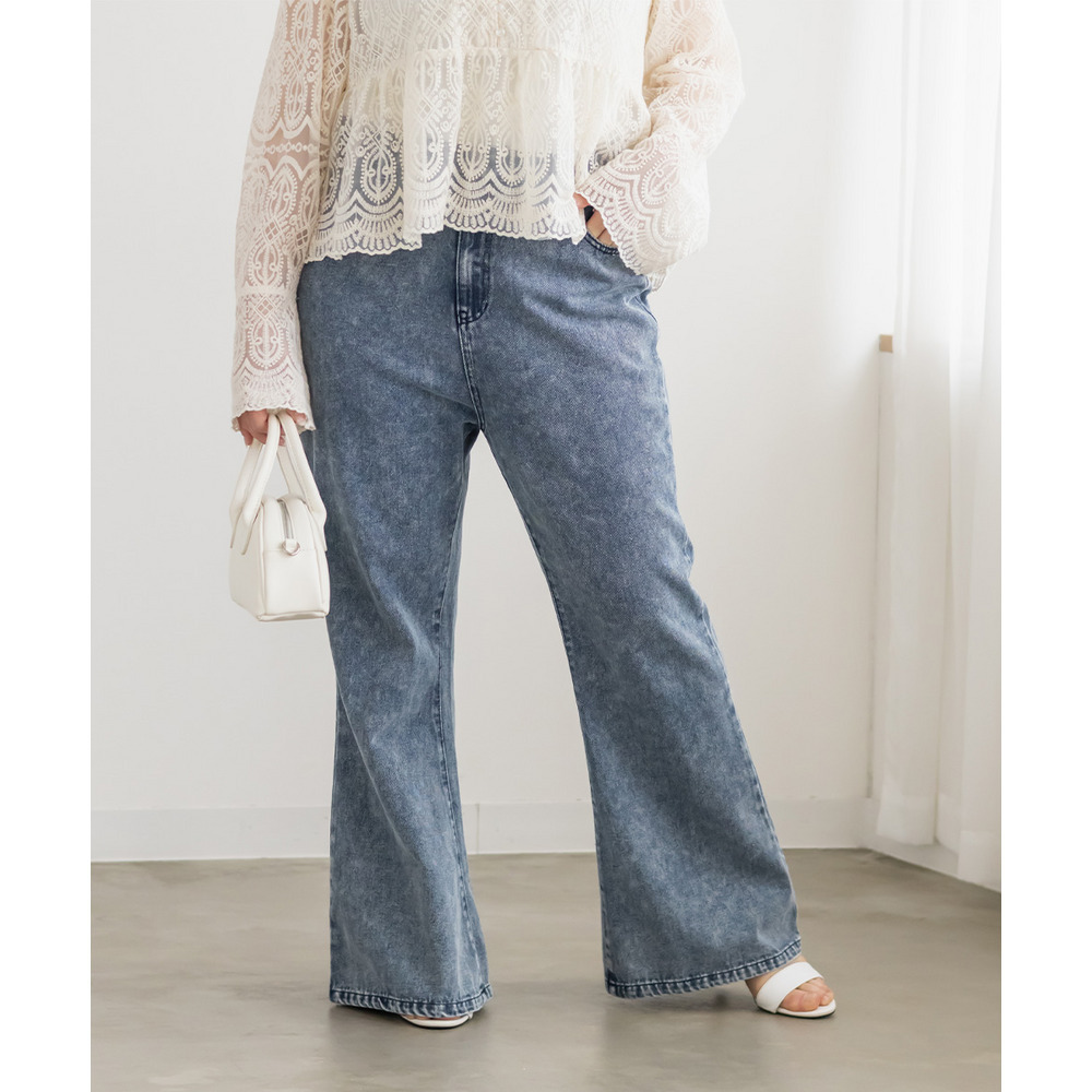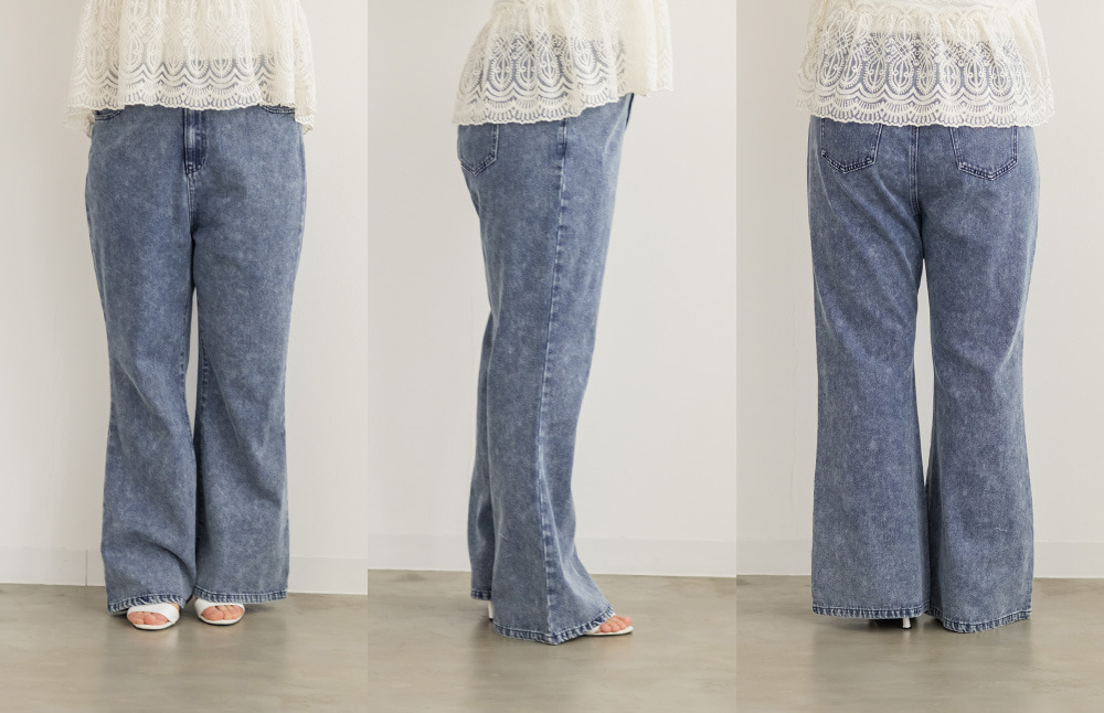 | 3Lサイズを着用して丁度良い着用感でした。フレアシルエットが脚のラインをきれいに見せてくれて、スタイルアップ効果も抜群な1本です! 加工感が今っぽくて、コーデに取り入れるだけで一気にトレンド感が出ます◎シンプルなアイテムと合わせてもおしゃれ見えが叶います。 生地は程よく軽めのデニムで、動きやすさも◎ デイリーコーデにピッタリな1本です。 |