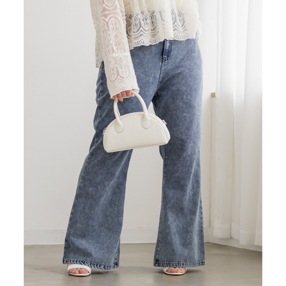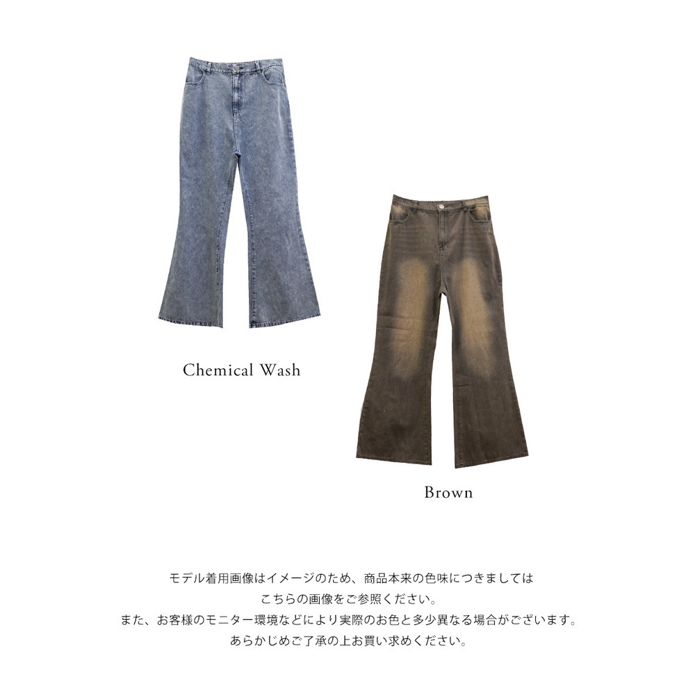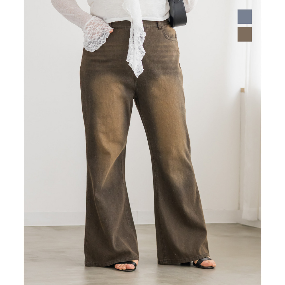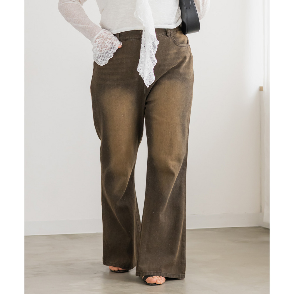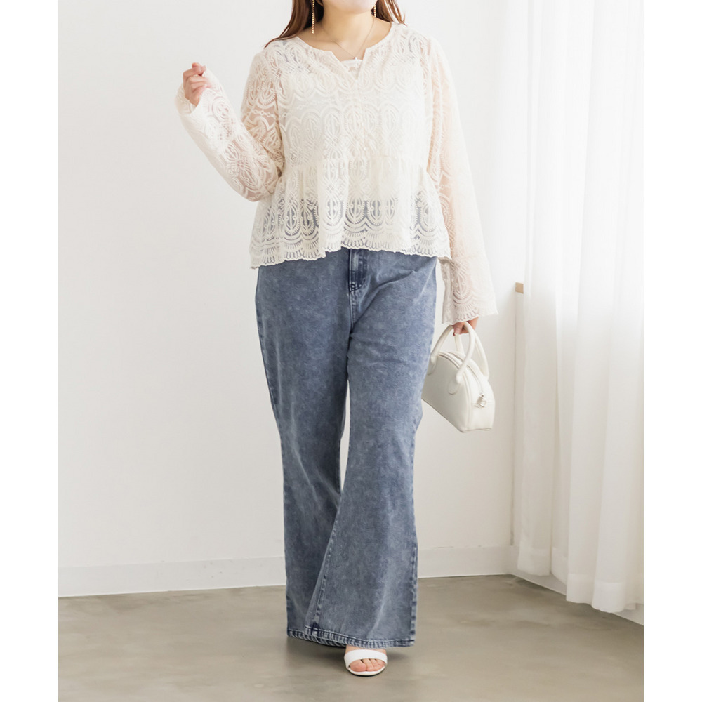| 3Lサイズを着用して丁度良い着用感でした。フレアシルエットが脚のラインをきれいに見せてくれて、スタイルアップ効果も抜群な1本です! 加工感が今っぽくて、コーデに取り入れるだけで一気にトレンド感が出ます◎シンプルなアイテムと合わせてもおしゃれ見えが叶います。 生地は程よく軽めのデニムで、動きやすさも◎ デイリーコーデにピッタリな1本です。 |