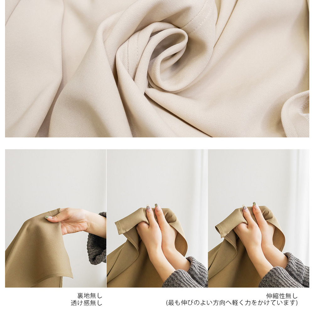 | 素材 | ■素材 ポリエステル95%、ポリウレタン5% ■裏地・透け感・伸縮性 裏地無し、透け感無し、伸縮性無し ■ポケット 有り ■生地感 程よくしっかりとした柔らかな素材でオールシーズン着用可能。 |