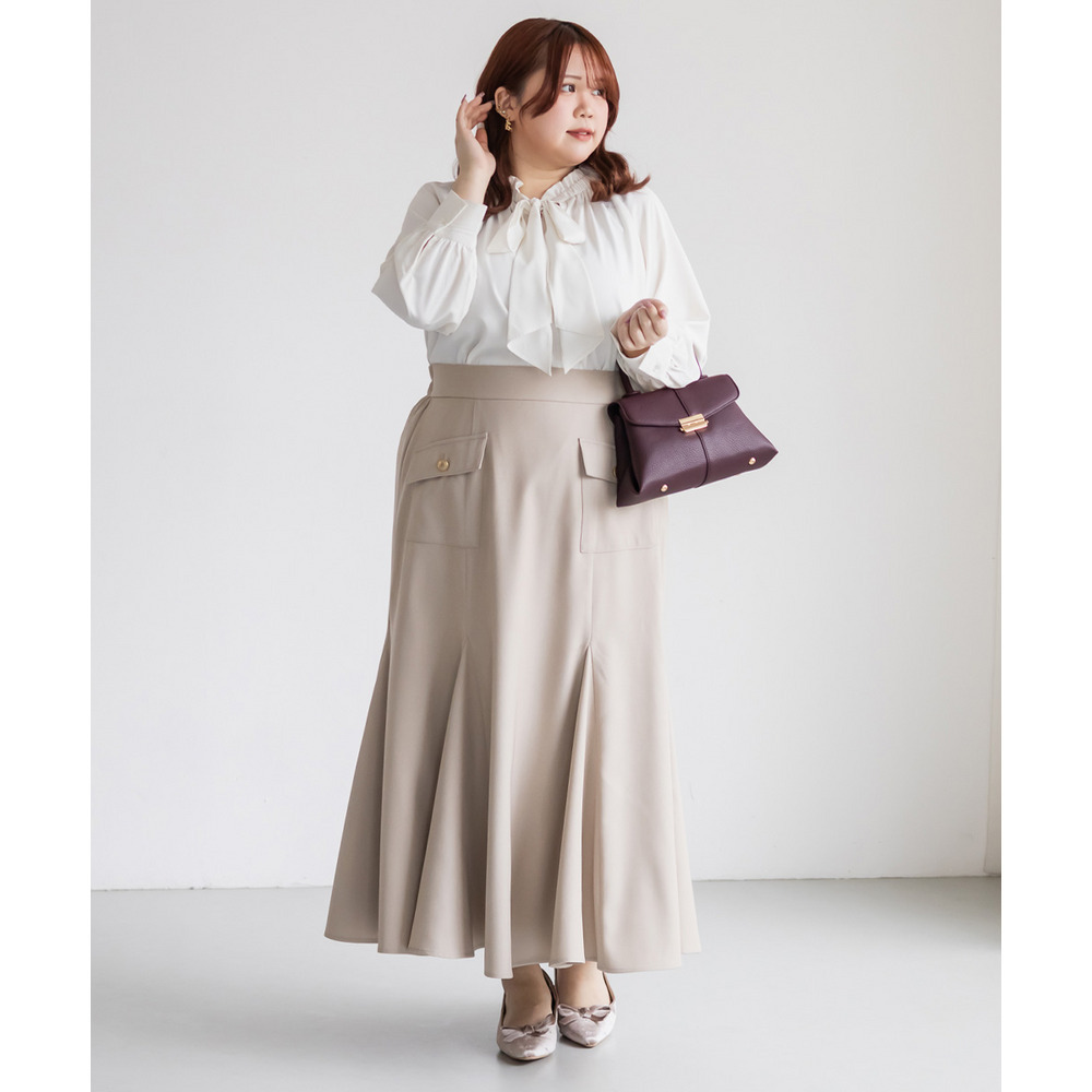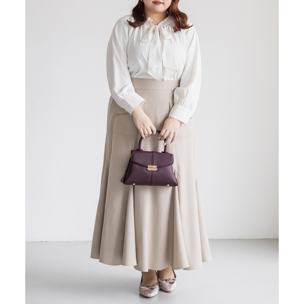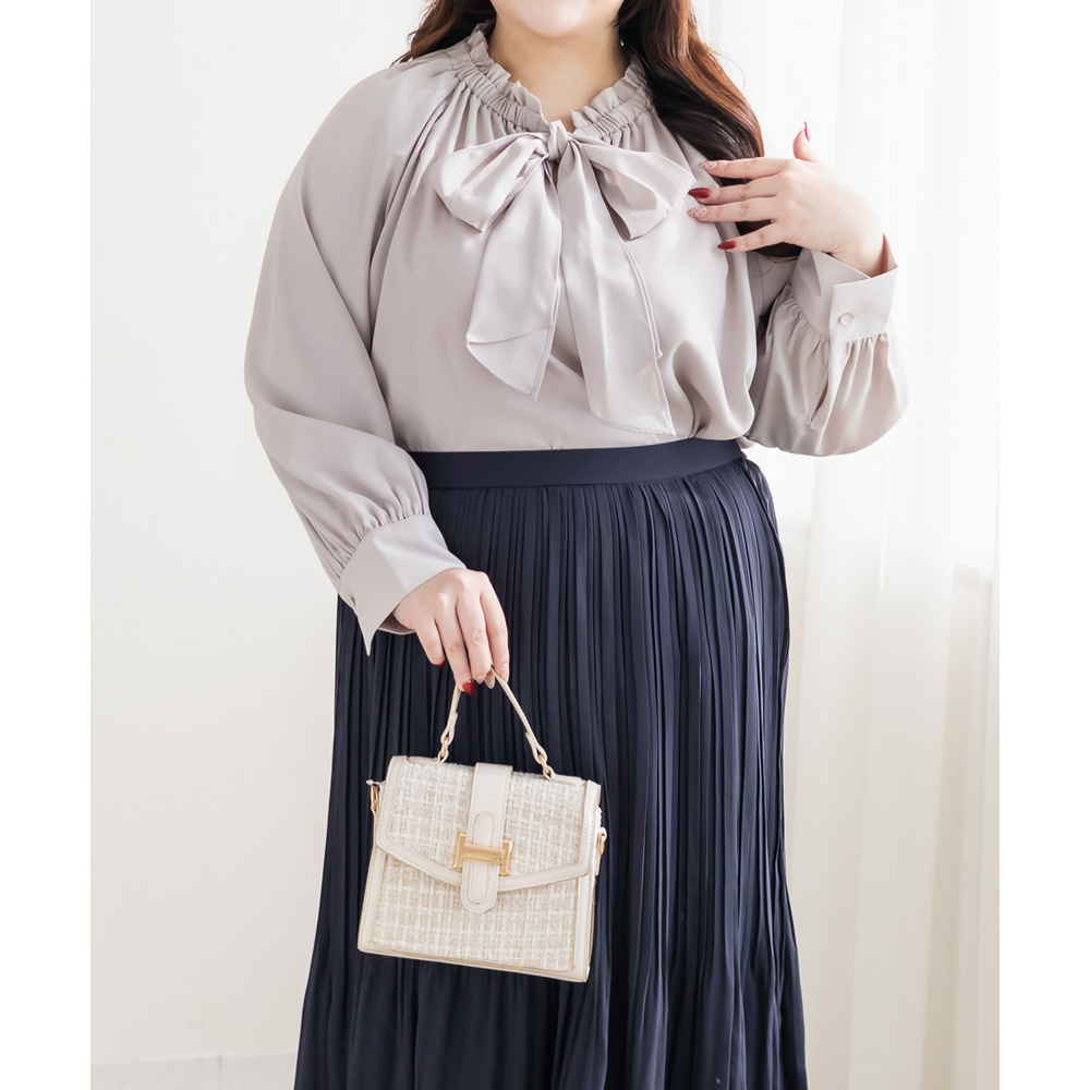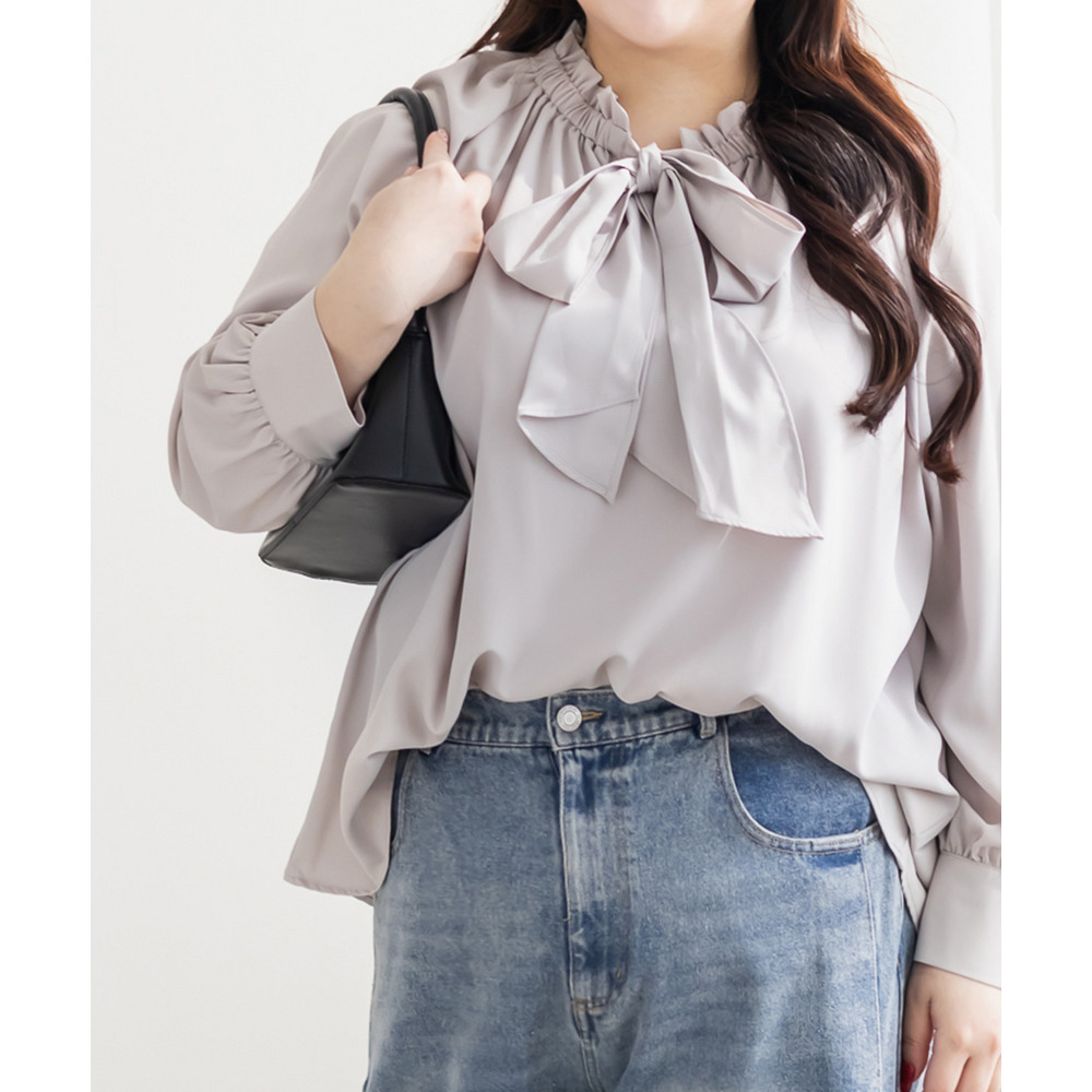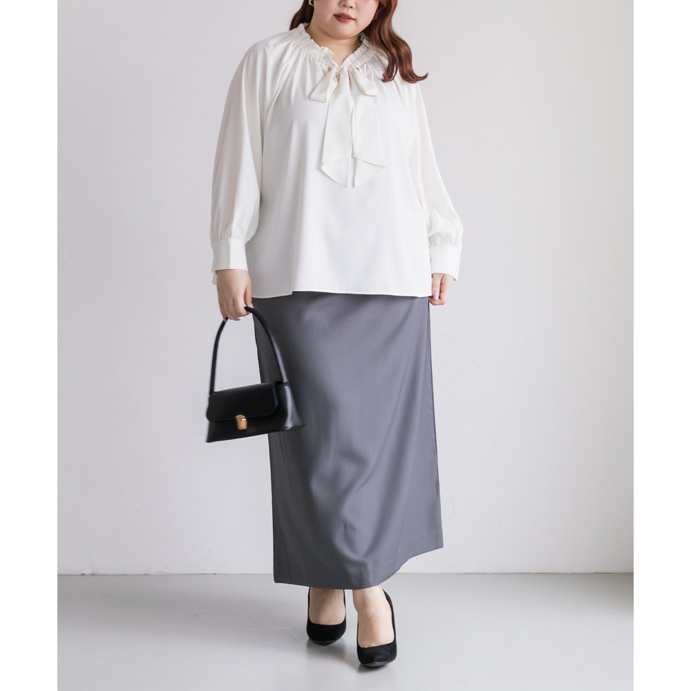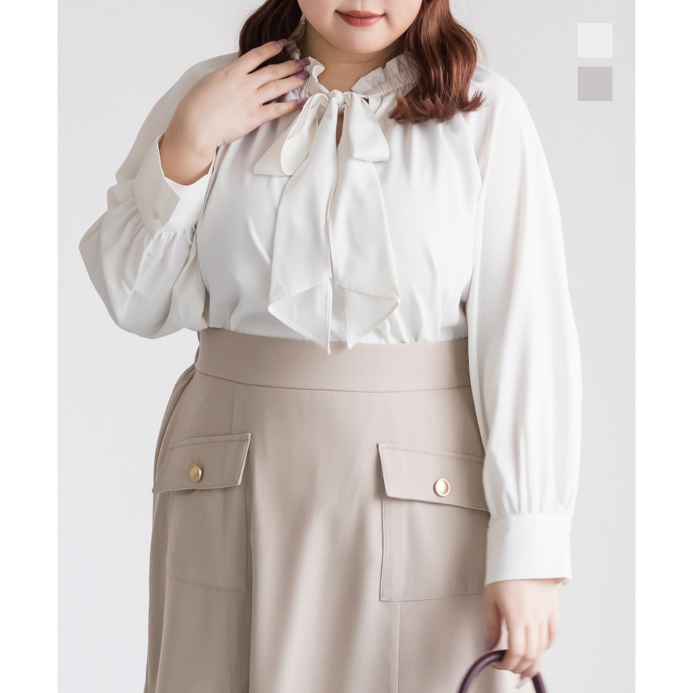 | 3Lサイズを着用しました。身頃や腕まわりに程よくゆとりがあり、全体的にちょうどいい着心地でした。首元のボウタイとフリルギャザーが華やかな印象で、1枚でコーデが決まる主役ブラウスです♪ ふんわりとしたシルエットで気になる体型を自然にカバーしてくれるのも嬉しいポイントでした。ボウタイは結び方で雰囲気を変えられるので、きれいめにもフェミニンにもアレンジできます◎ パンツ合わせできちんと感のあるスタイルに、スカート合わせでより華やかな着こなしにするのもおすすめです。オンオフどちらにも活躍してくれるブラウスだと思いました。 |