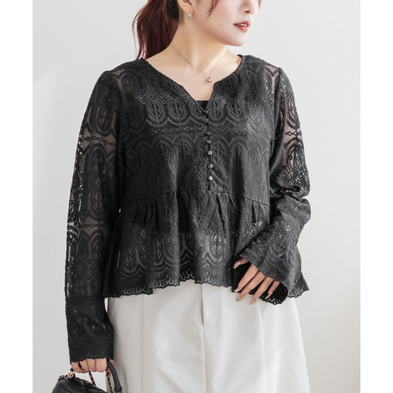 3Lサイズを着用して、身頃も腕まわりも窮屈感なくちょうどいい着心地でした◎さらっと涼しい肌あたりで、透け感が上品でカジュアルにもきれいめにも合わせやすく、1枚で華やかさを演出できる万能トップスです。レースの柄も大人っぽくお洒落な雰囲気です。腕周りしっかりゆとりがあって体型カバーを意識したい日にもぴったりでした♪夏も着れる長袖なので長いシーズン着まわせるブラウスです!