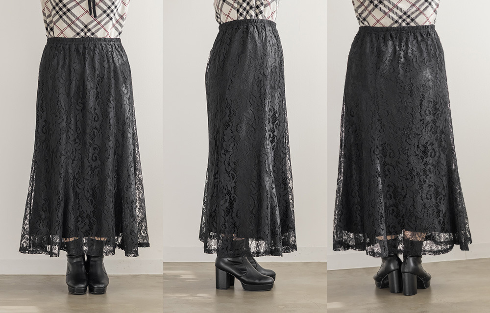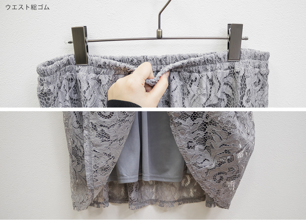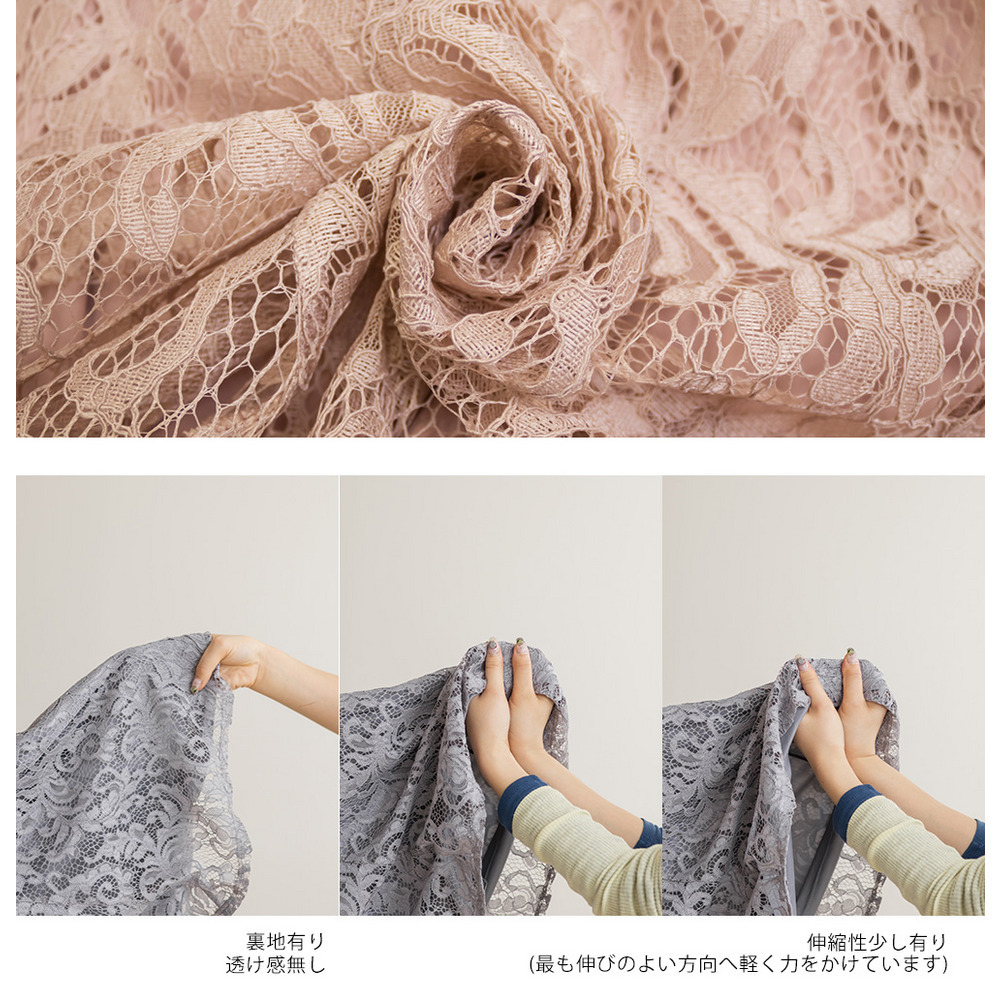素材 ■素材 【表地】ポリエステル100%、【裏地】ポリエステル100% ■裏地・透け感・伸縮性 裏地有り、透け感無し、伸縮性無し ■ポケット 無し ■生地感 伸縮性のないレース生地にさらりとした伸縮性のない裏地付き。