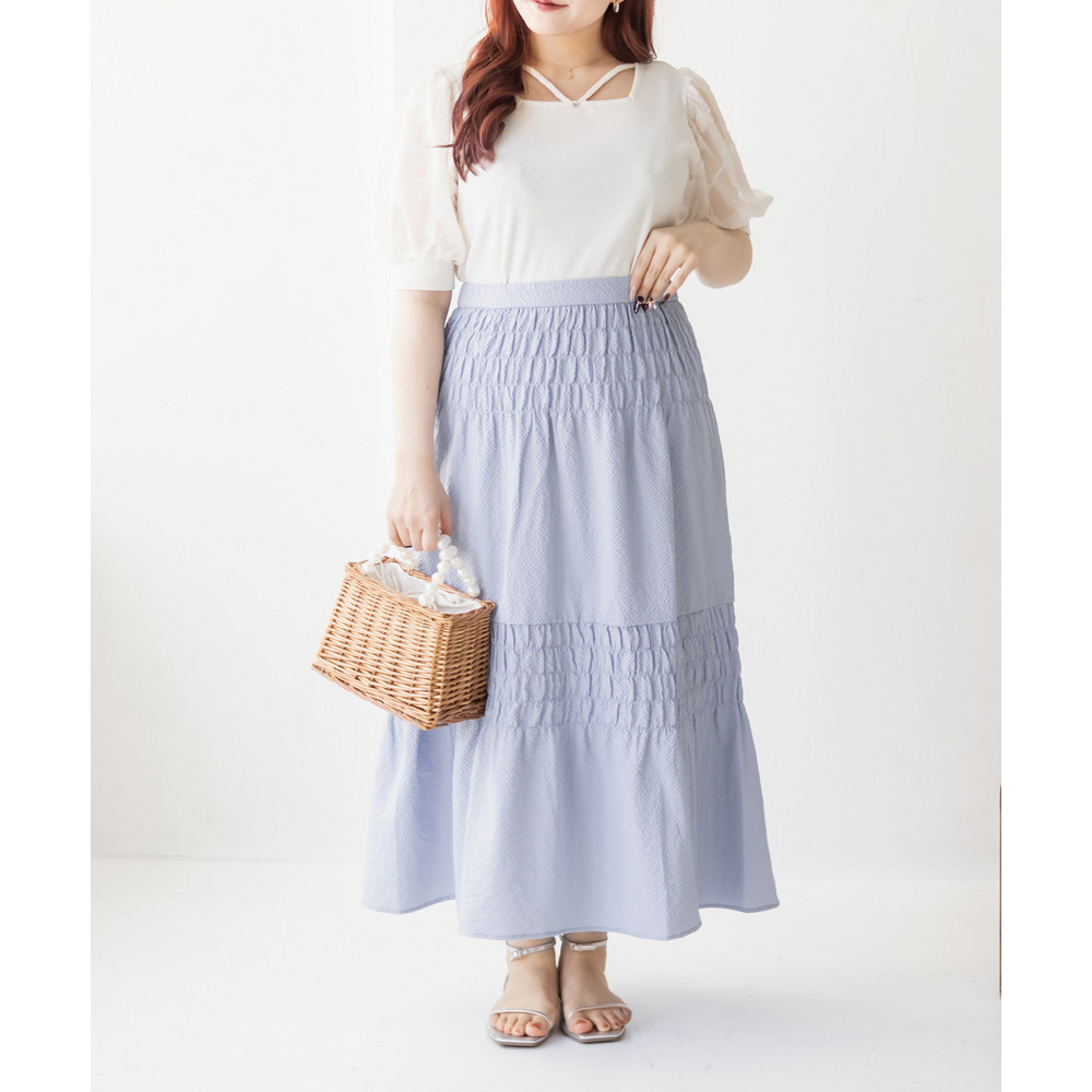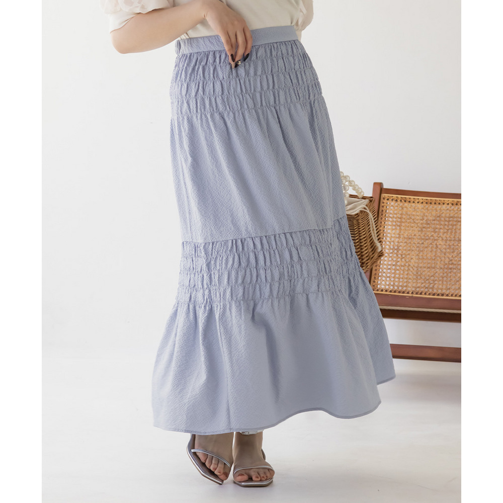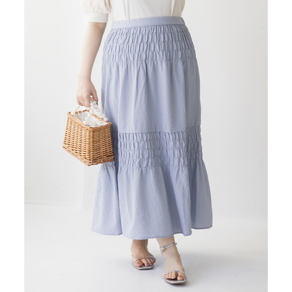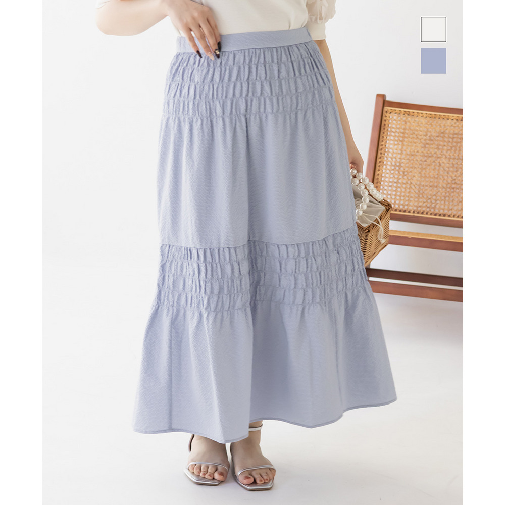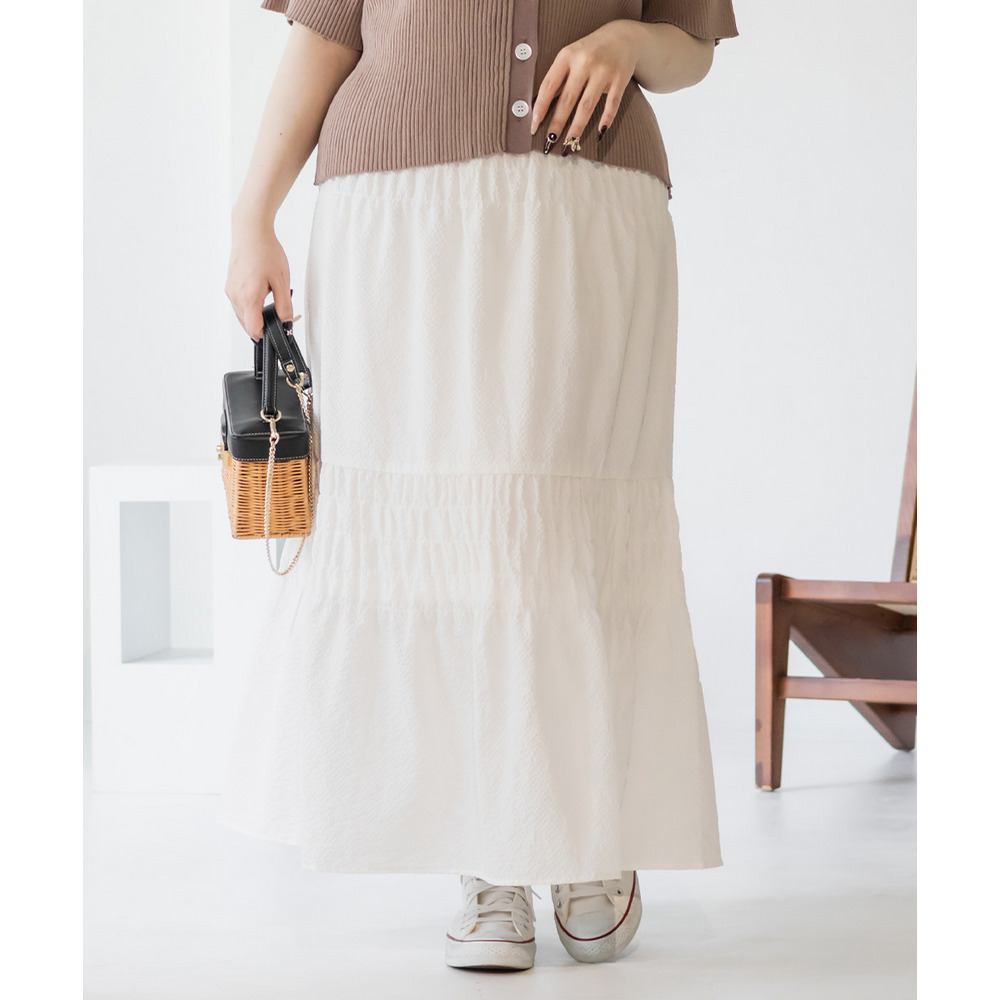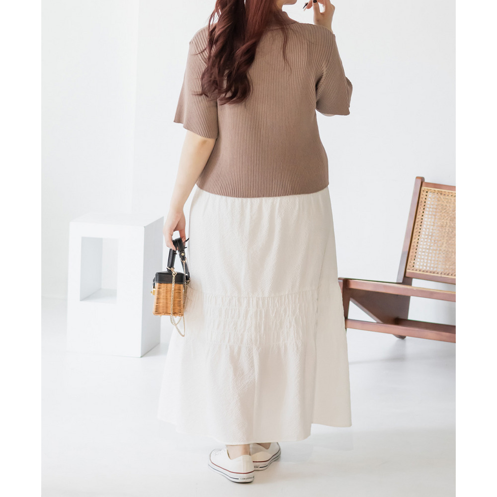 | 3Lサイズを着用しました。ウエストは程よくフィットし、全体的にちょうどいい着心地でした。サッカー素材のシャーリングデザインで、軽やかで涼しげな印象に仕上がるのが魅力です♪凹凸のある生地感なので肌離れがよく、これからの季節も快適に着られました。ふんわりと広がるシルエットで体型を自然にカバーしつつ、女性らしいやわらかさを演出してくれます◎シンプルなトップスと合わせるだけでコーデが決まるので、デイリーに活躍してくれるスカートだと思いました。 |