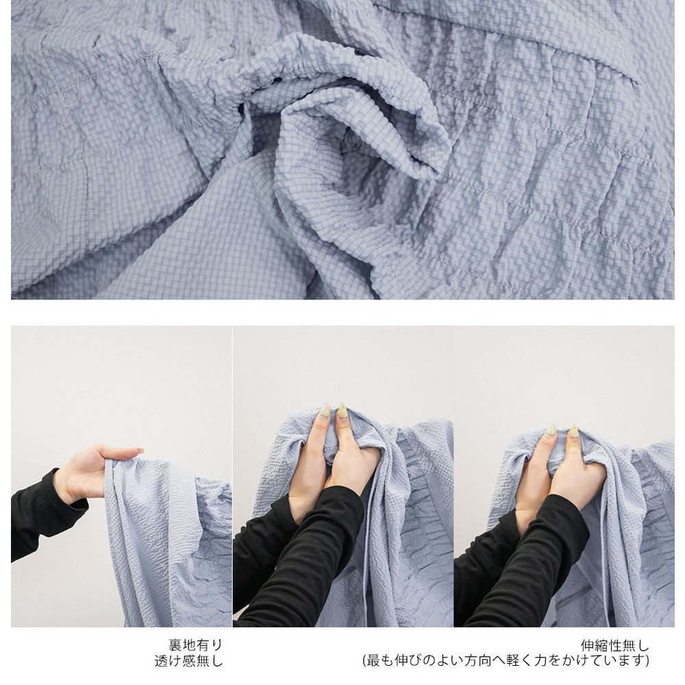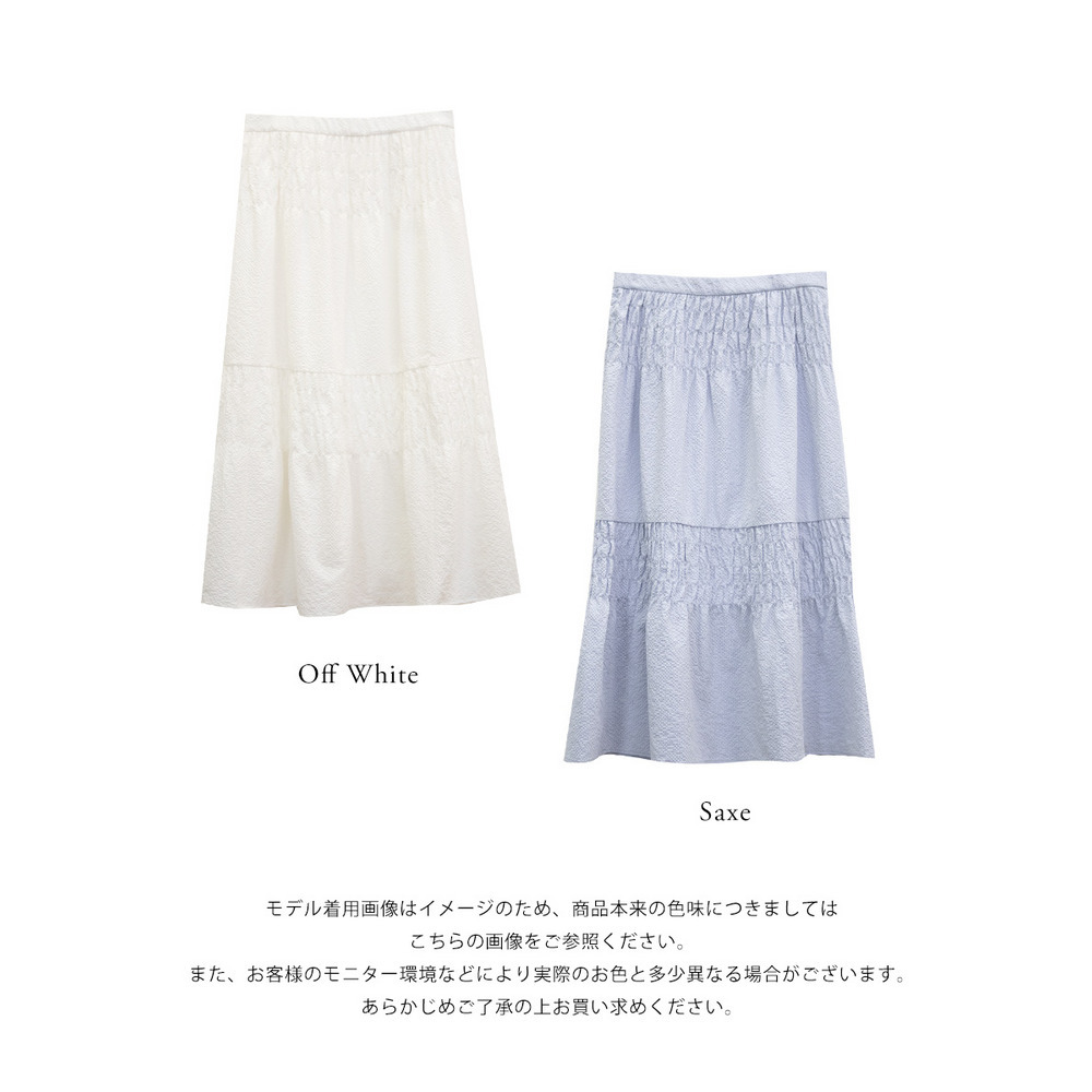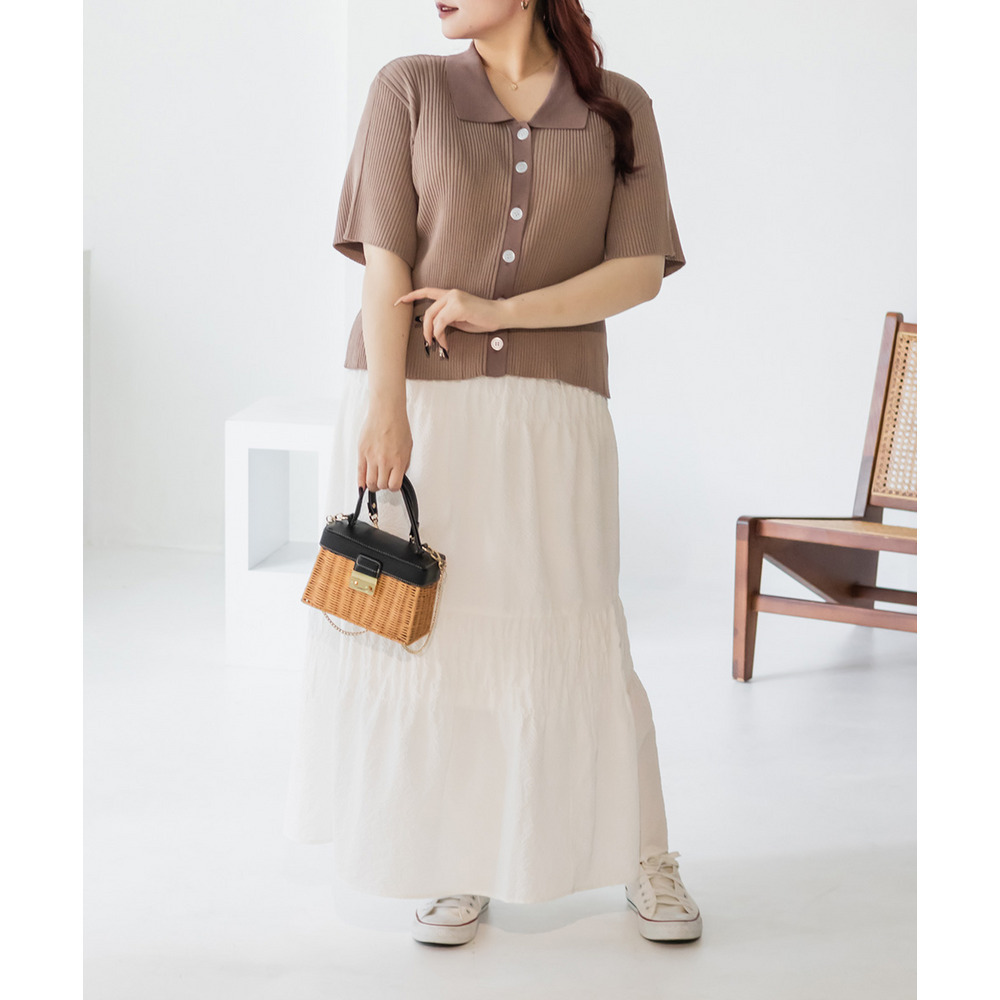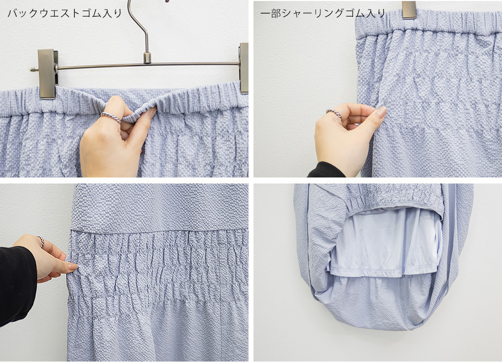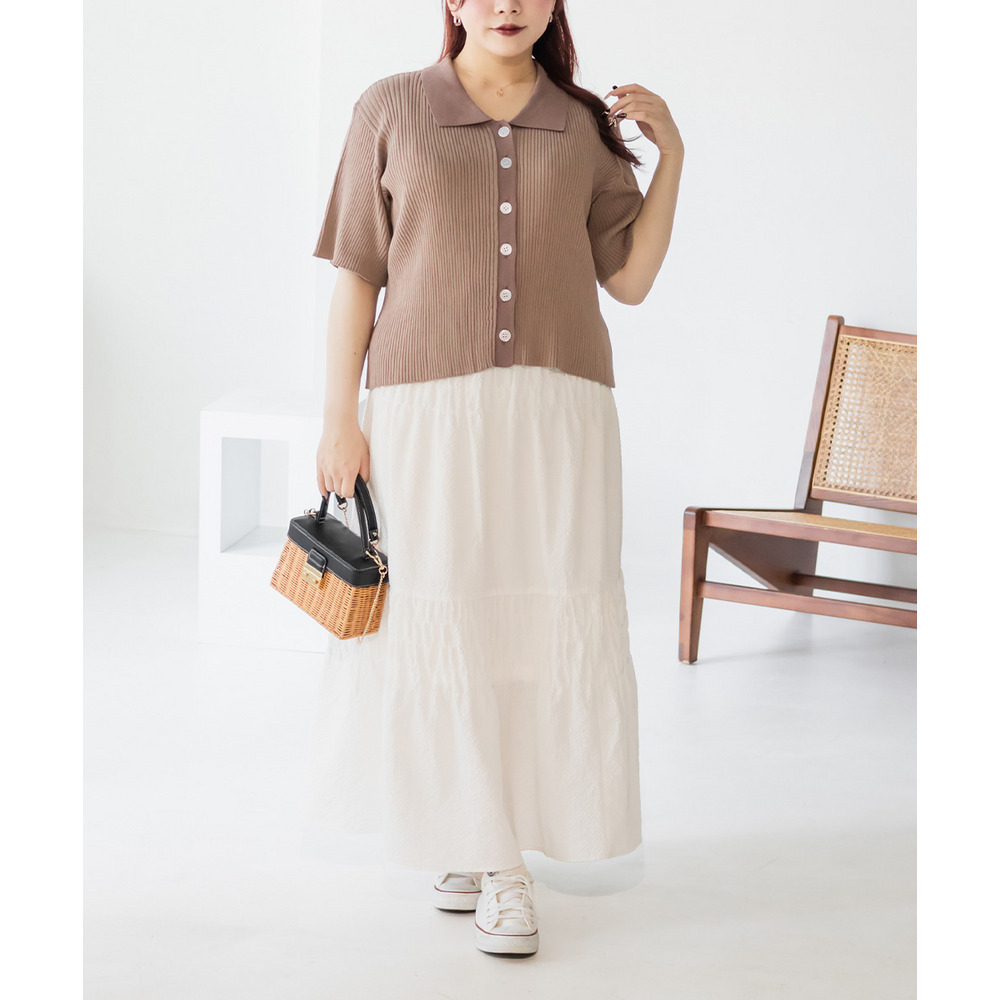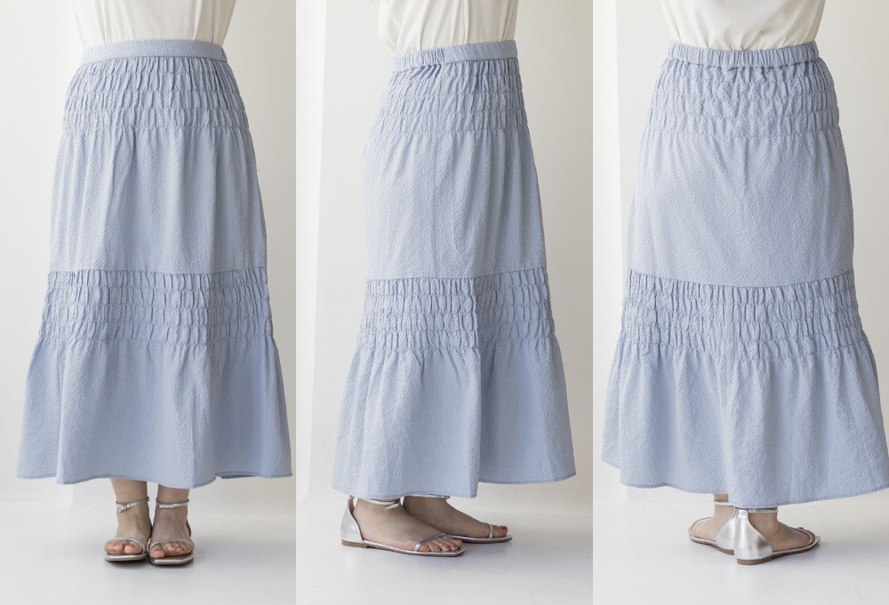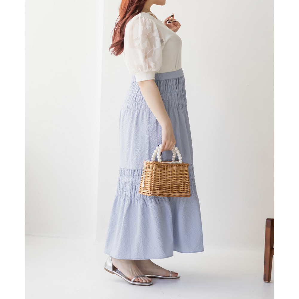 | 3Lサイズを着用しました。ウエストは程よくフィットし、全体的にちょうどいい着心地でした。サッカー素材のシャーリングデザインで、軽やかで涼しげな印象に仕上がるのが魅力です♪凹凸のある生地感なので肌離れがよく、これからの季節も快適に着られました。ふんわりと広がるシルエットで体型を自然にカバーしつつ、女性らしいやわらかさを演出してくれます◎シンプルなトップスと合わせるだけでコーデが決まるので、デイリーに活躍してくれるスカートだと思いました。 |