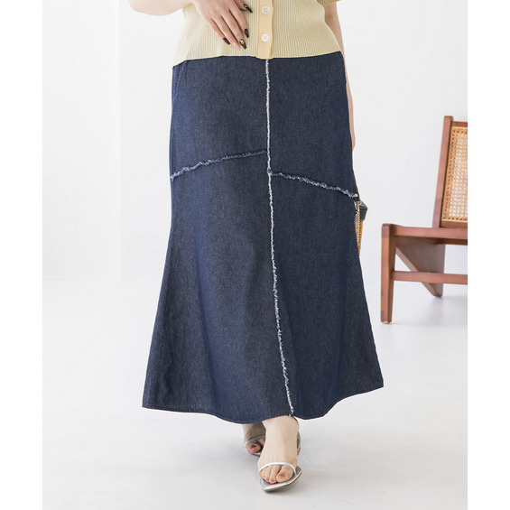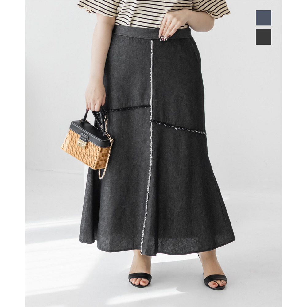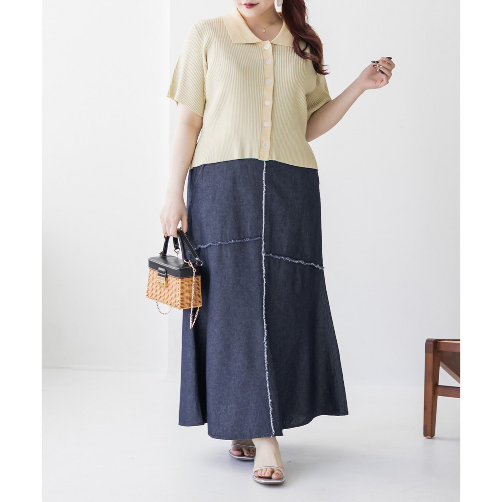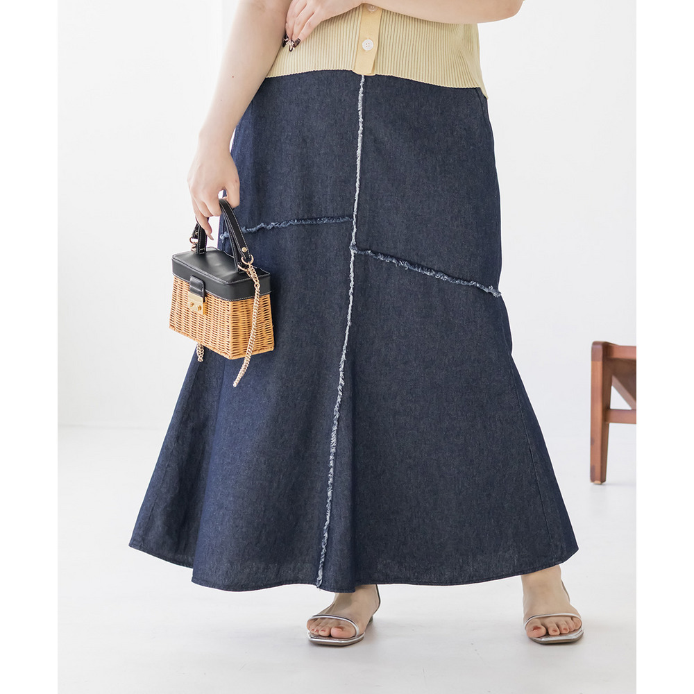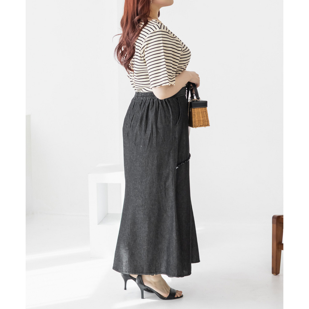 | 3Lサイズを着用てちょうどよいサイズ感でした!後ろゴムで窮屈感無く着脱も問題なくできました。フリンジが入っていてメリハリのあるデザインです。すっきりと華奢に見せてくれます。カジュアルなデニム素材ながら、女性らしいマーメイドラインのスカートにデザインされていて、幅広いイメージで着こなせます!軽いデニム生地なので夏も使えてごわつきにくいのも嬉しい!カジュアルコーデからキレイめまで合わせられるのでトップスを選ばず着用していただけます! |