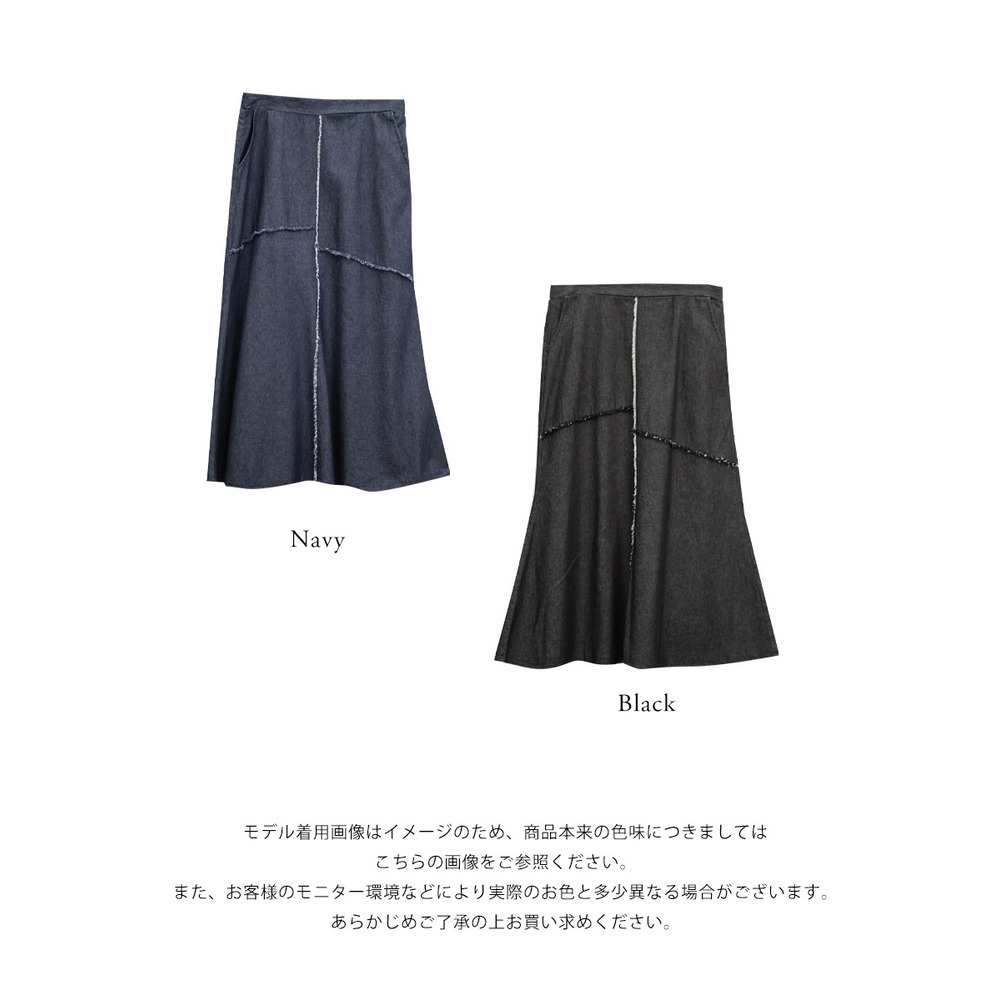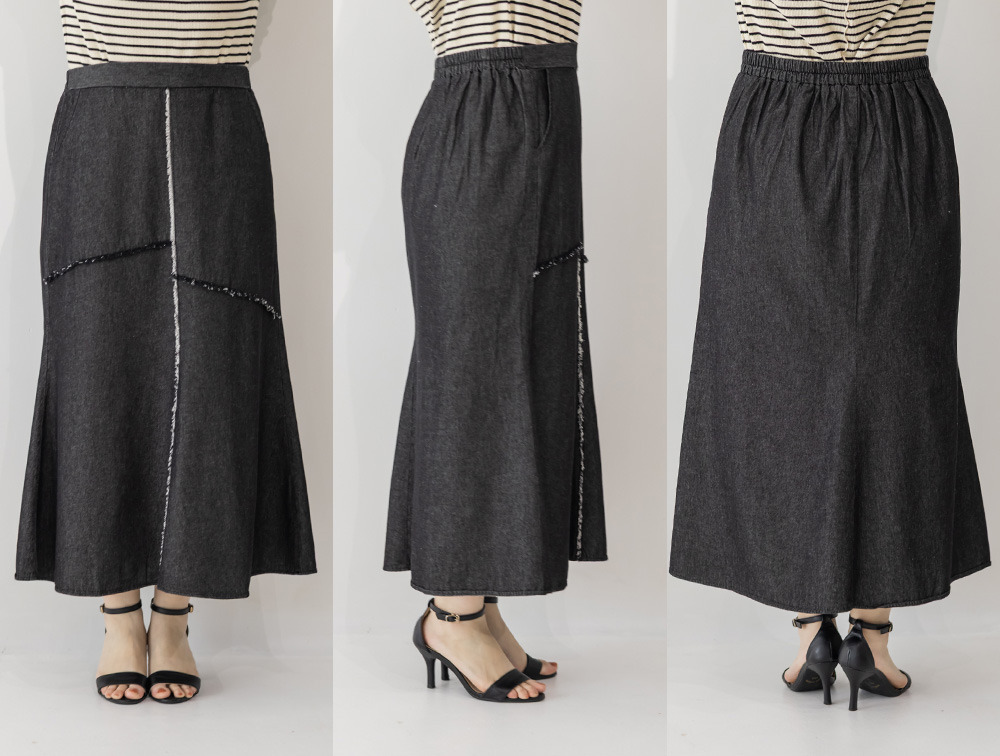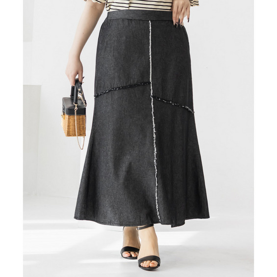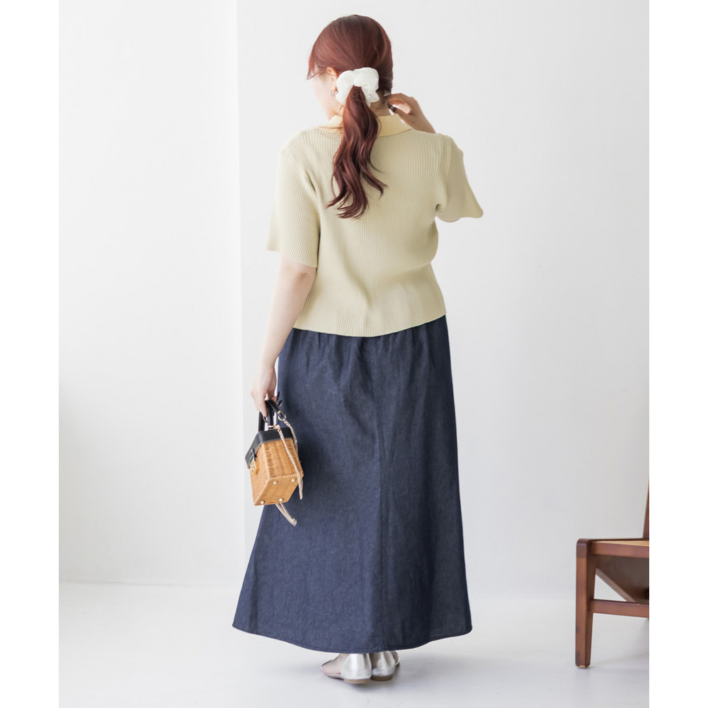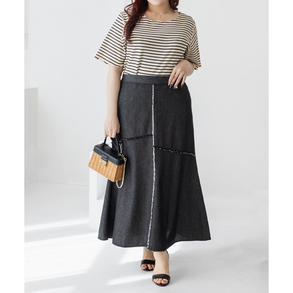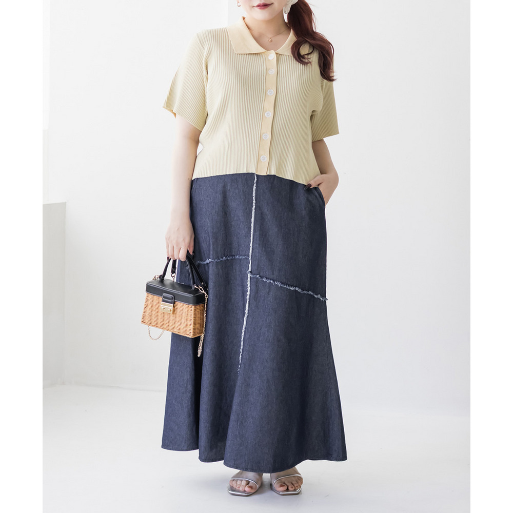 | 3Lサイズを着用てちょうどよいサイズ感でした!後ろゴムで窮屈感無く着脱も問題なくできました。フリンジが入っていてメリハリのあるデザインです。すっきりと華奢に見せてくれます。カジュアルなデニム素材ながら、女性らしいマーメイドラインのスカートにデザインされていて、幅広いイメージで着こなせます!軽いデニム生地なので夏も使えてごわつきにくいのも嬉しい!カジュアルコーデからキレイめまで合わせられるのでトップスを選ばず着用していただけます! |