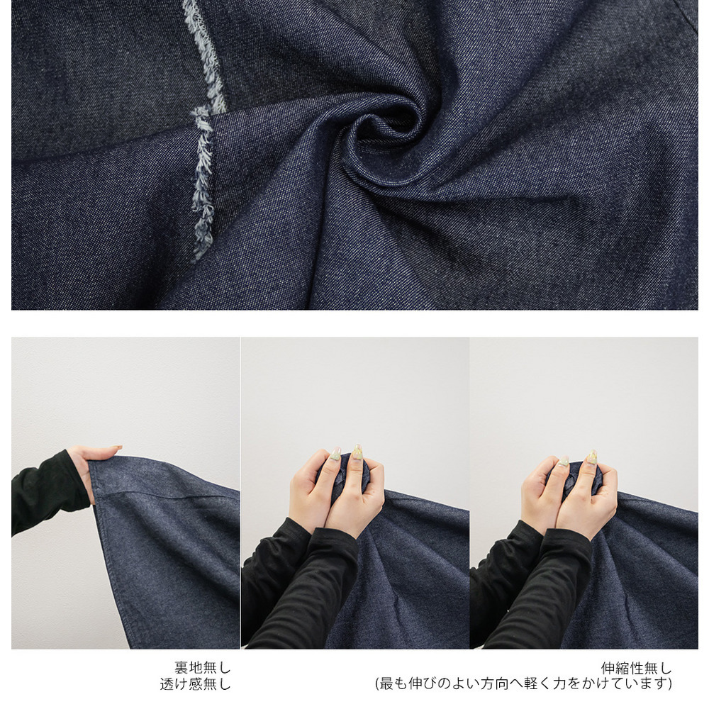 | 素材 | ■素材 綿100% ■裏地・透け感・伸縮性 裏地無し、透け感無し、伸縮性無し ■ポケット 有り ■生地感 薄手のデニム素材です。 |