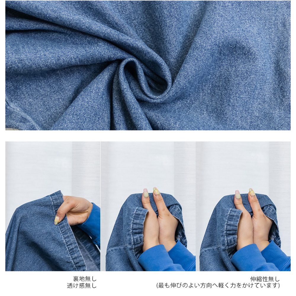 素材 ■素材 綿100% ■裏地・透け感・伸縮性 裏地無し、透け感無し、伸縮性無し ■ポケット 有り ■生地感 薄手のデニム素材です。
