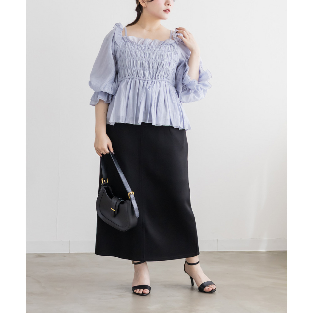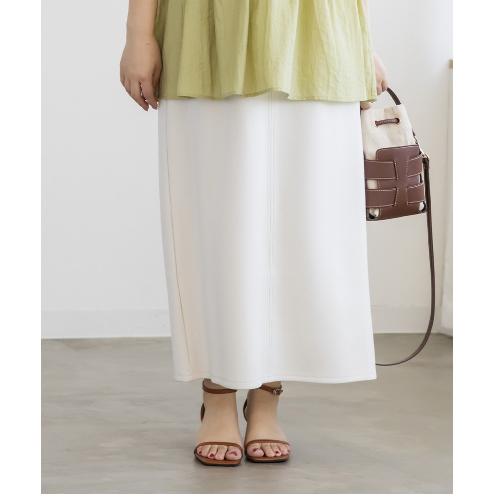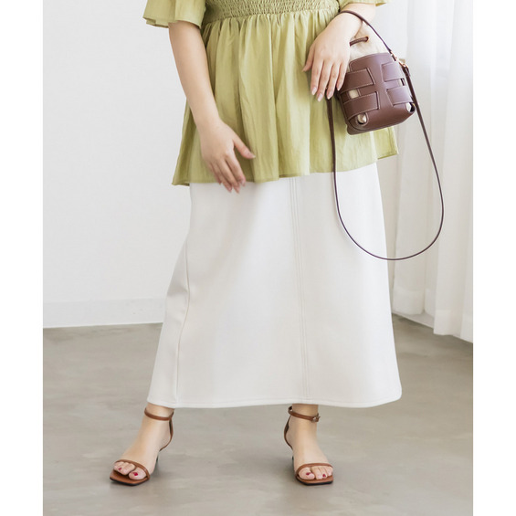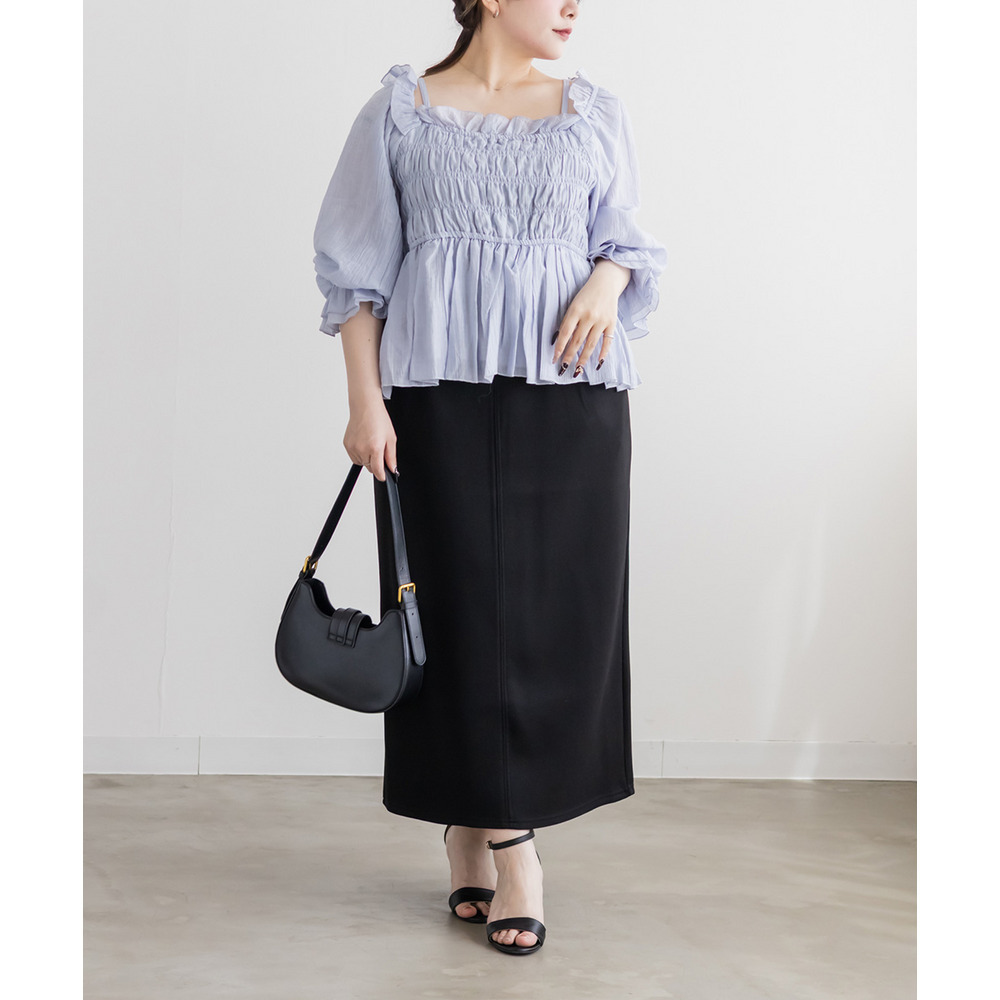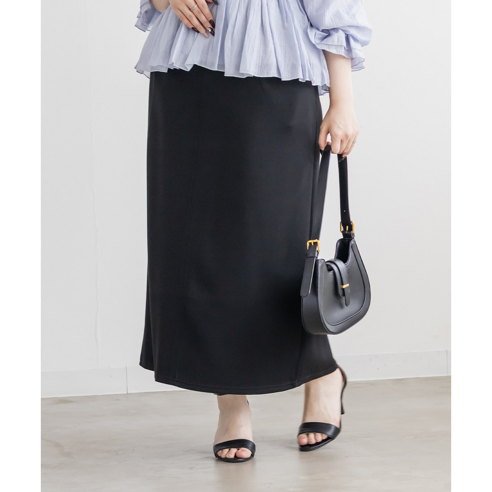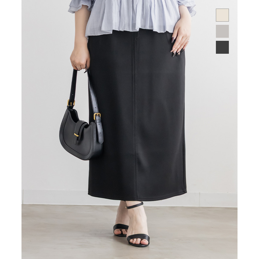 | 3Lを着て丁度いいサイズ感で、窮屈感なくらくちんな着心地でした!いつものナロースカートよりは少しタイトなシルエットですが、ストレスのなく着ていられる生地感で、後ろもゴムだから窮屈感もありません◎スリットはファスナーで自分好みで開けられるのもポイントです!閉めても見えにくいコンシールファスナーなのが嬉しいです!シンプルなデザインだから色々なトップスと合わせやすく、季節問わず使えるので1枚は持っておきたいスカートです! |