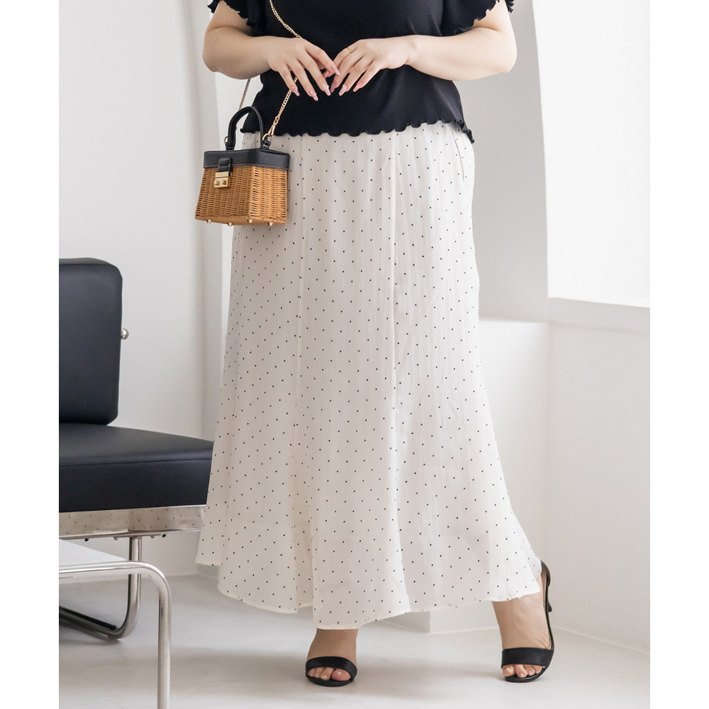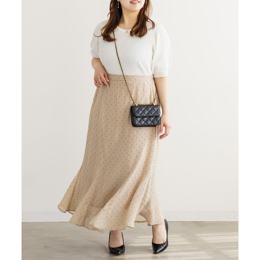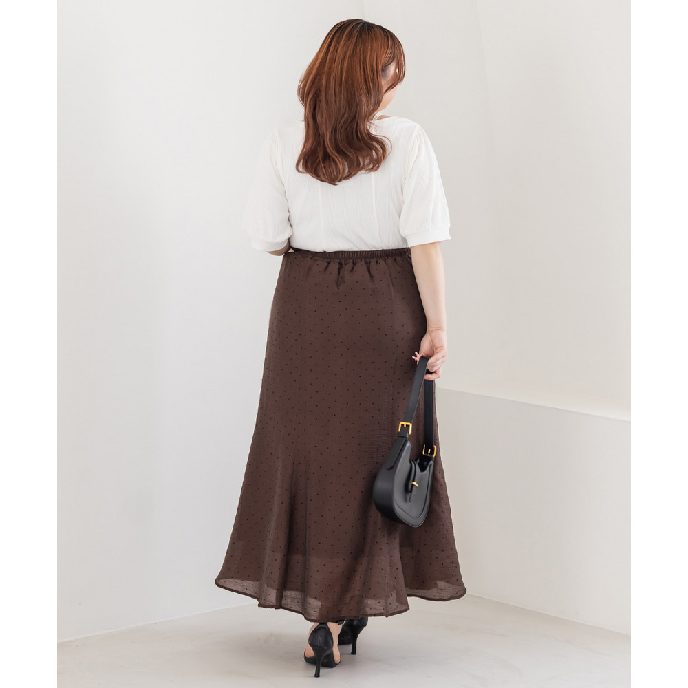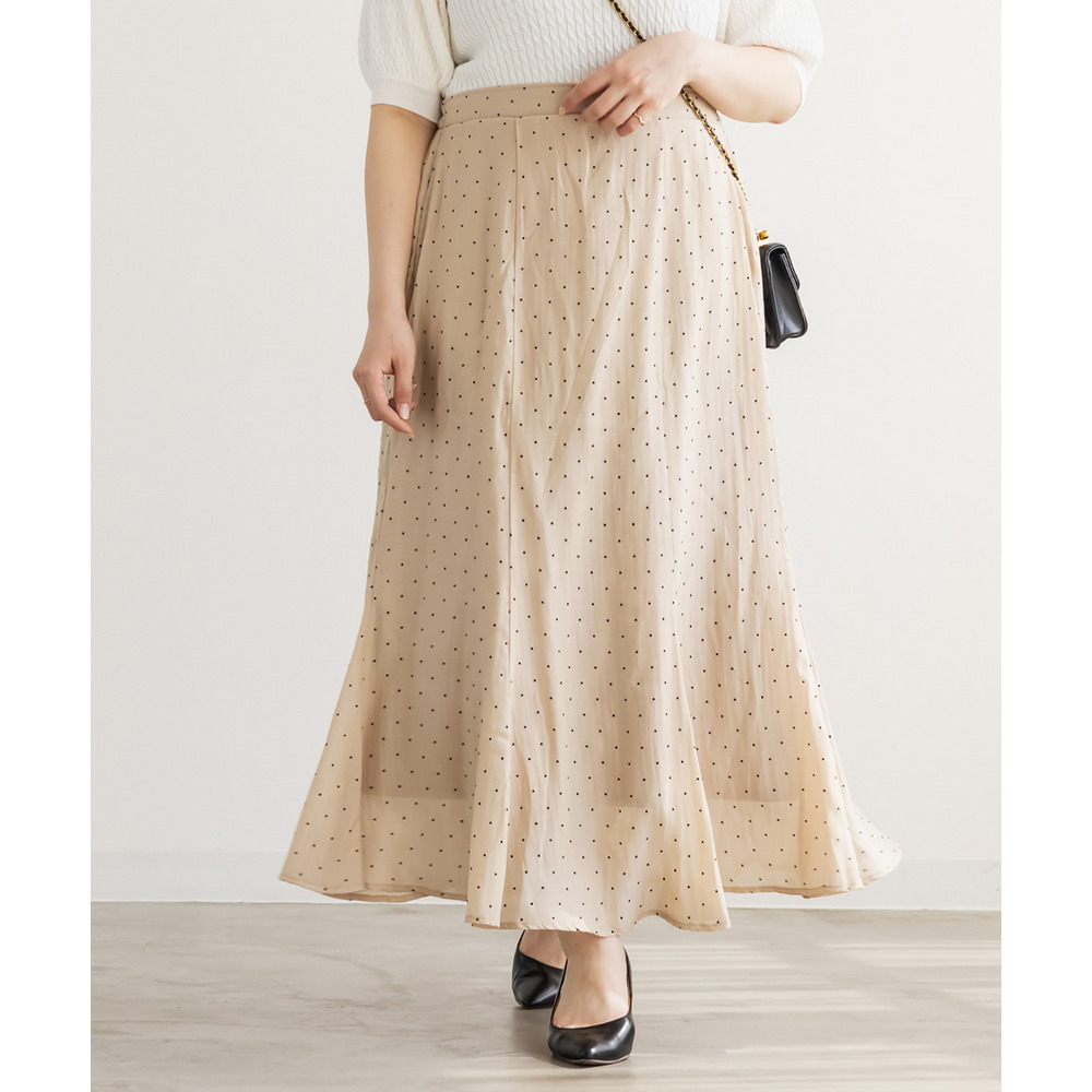 | 3Lを着てちょうどいいサイズでした。後ろゴムになっていて着心地らくちんでトレンドのドット柄とシアーな質感が可愛いです。マーメイドのすっきりとしたシルエットになっていて、どんなトップスともコーディネートしやすいです。お仕事から普段使いも活躍して、着回しが効くアイテムです。 |