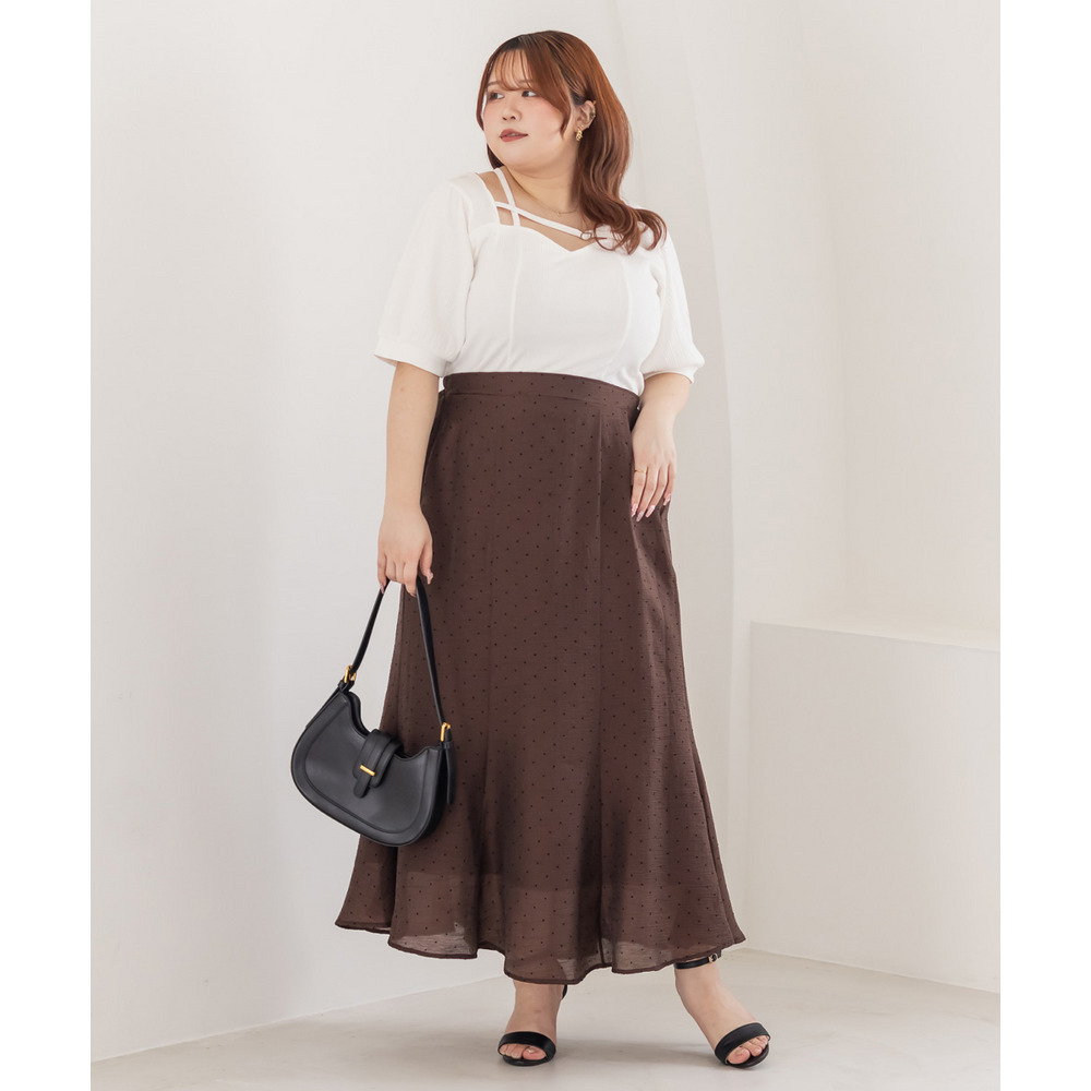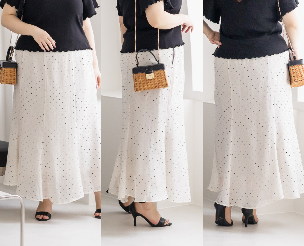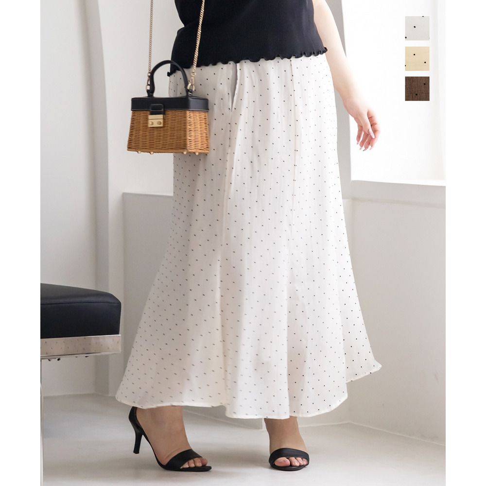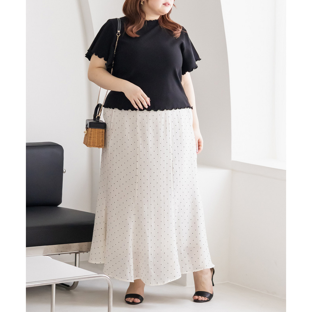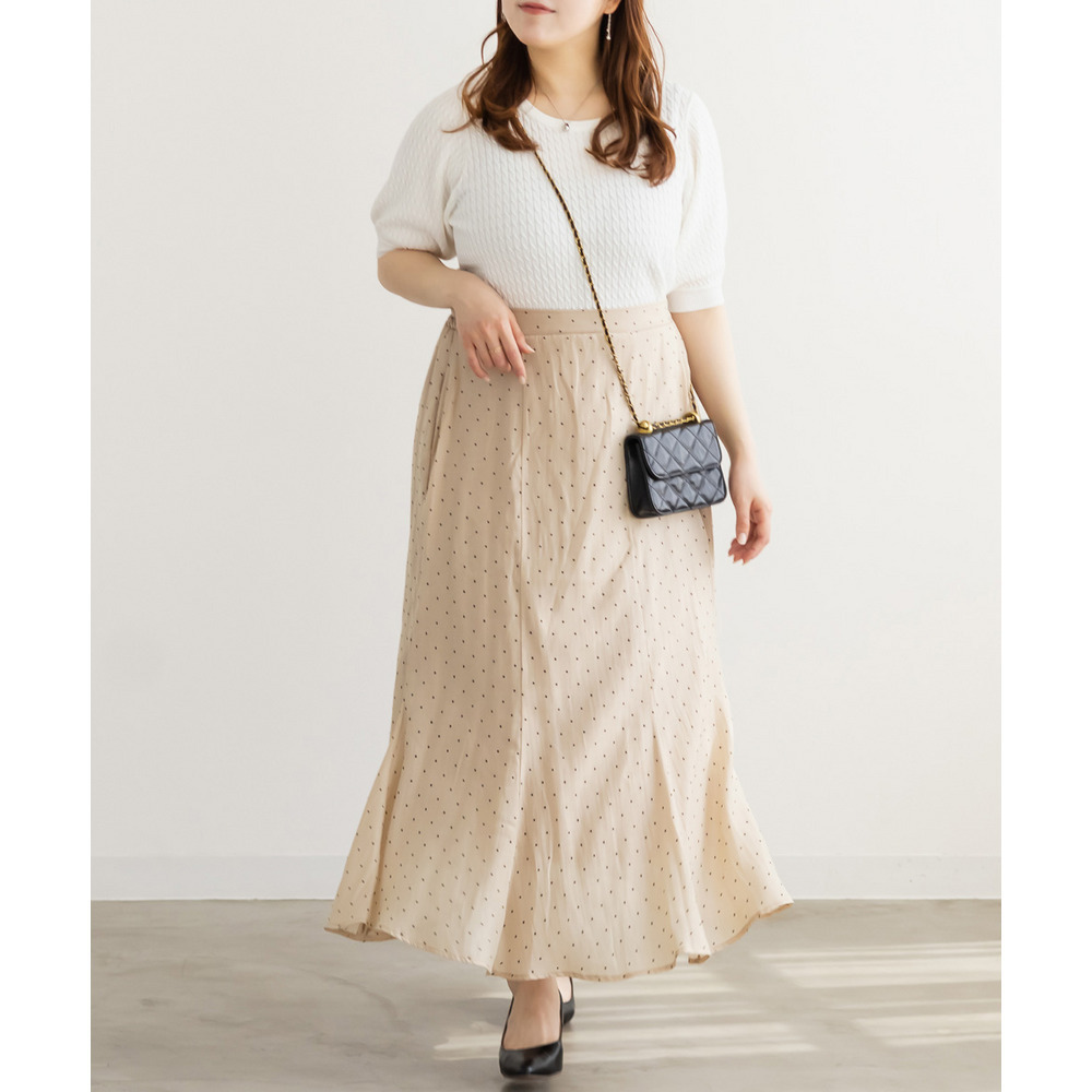 | 3Lを着てちょうどいいサイズでした。後ろゴムになっていて着心地らくちんでトレンドのドット柄とシアーな質感が可愛いです。マーメイドのすっきりとしたシルエットになっていて、どんなトップスともコーディネートしやすいです。お仕事から普段使いも活躍して、着回しが効くアイテムです。 |