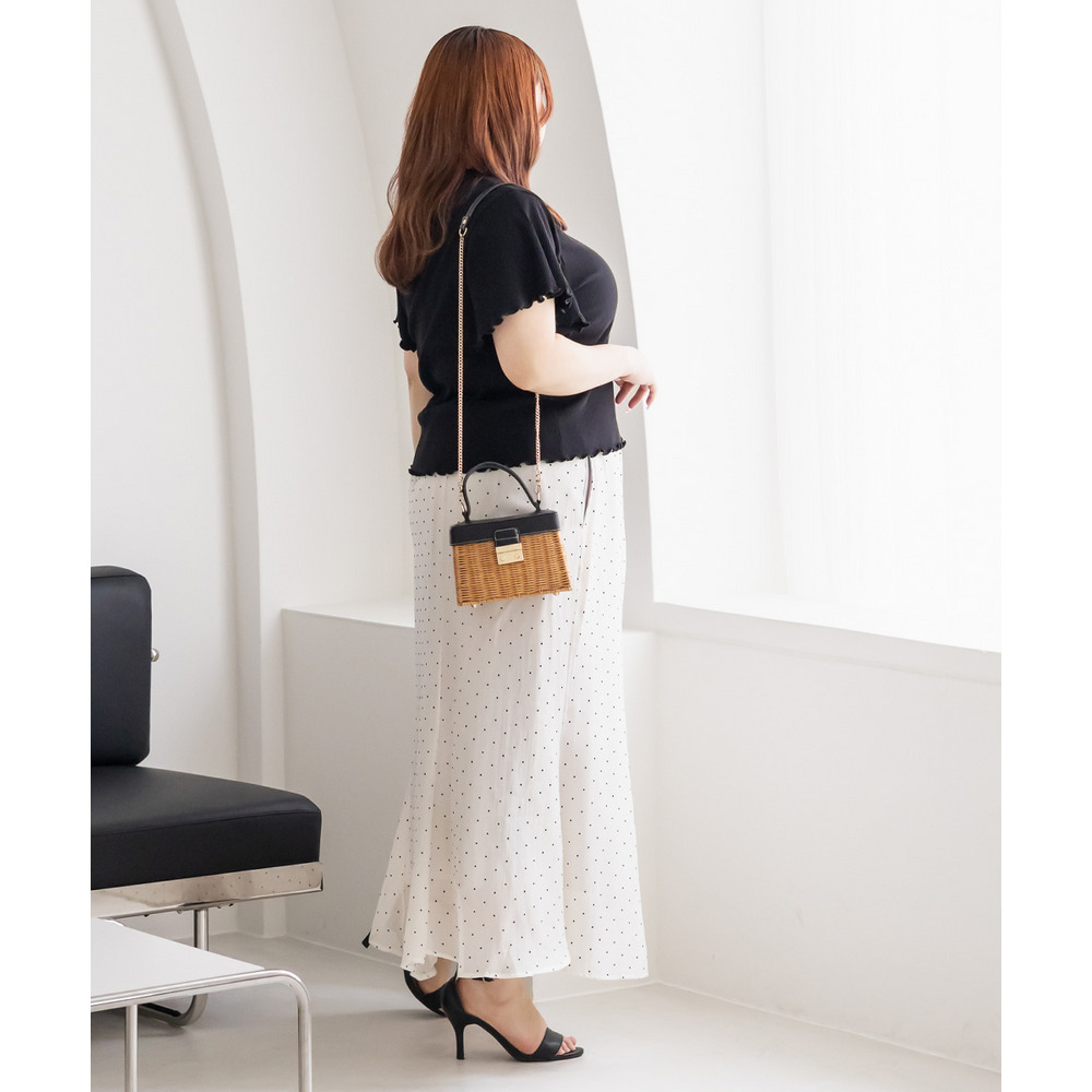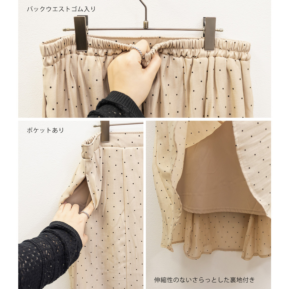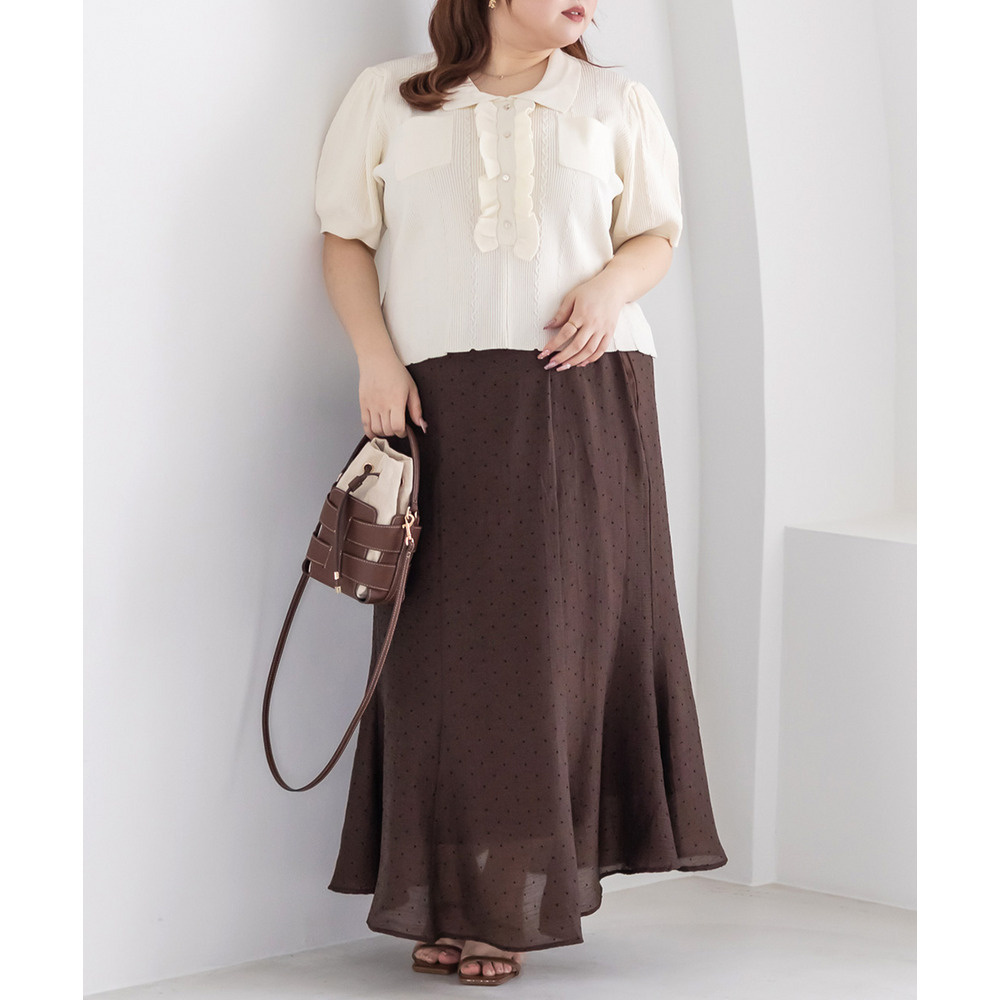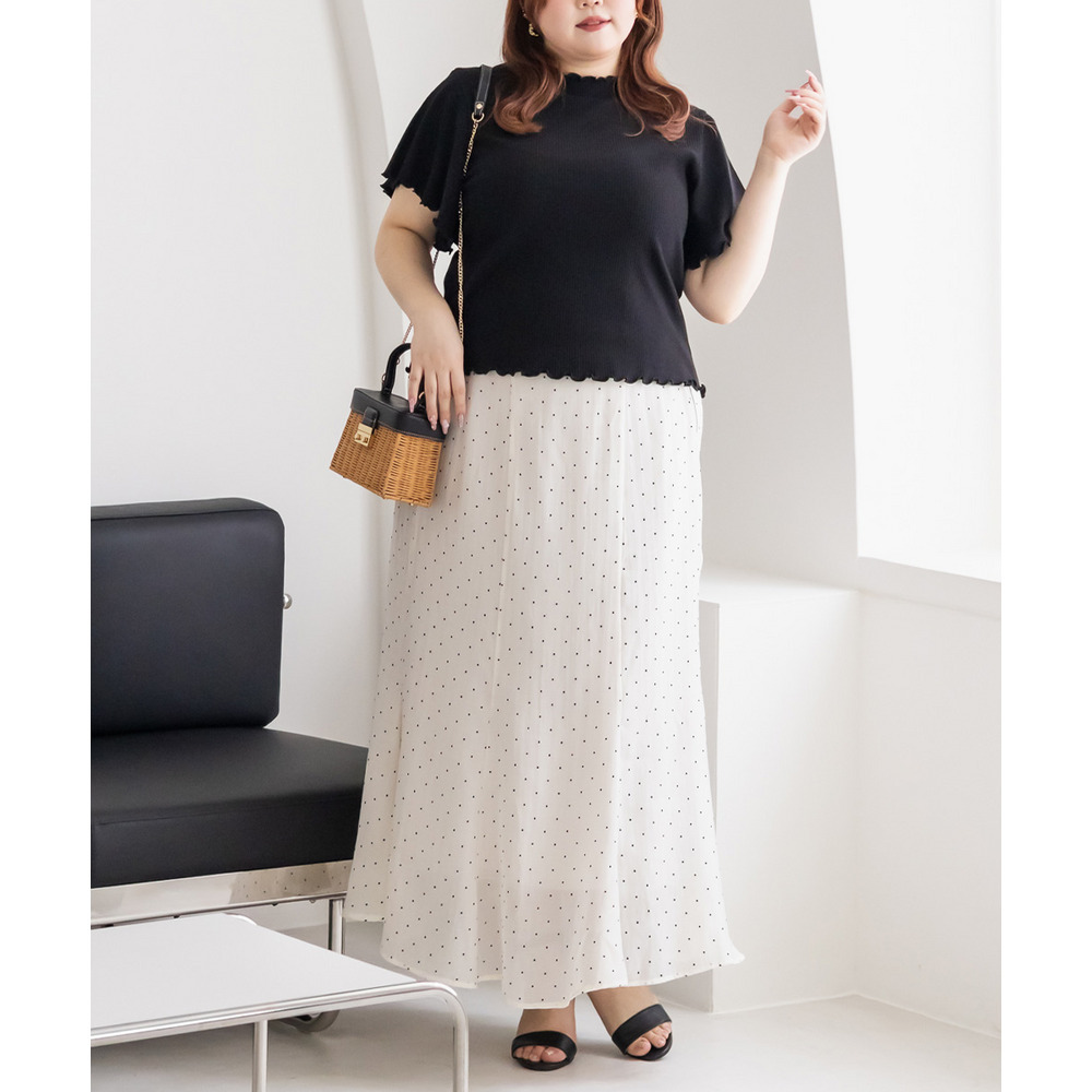 | 3Lを着てちょうどいいサイズでした。後ろゴムになっていて着心地らくちんでトレンドのドット柄とシアーな質感が可愛いです。マーメイドのすっきりとしたシルエットになっていて、どんなトップスともコーディネートしやすいです。お仕事から普段使いも活躍して、着回しが効くアイテムです。 |