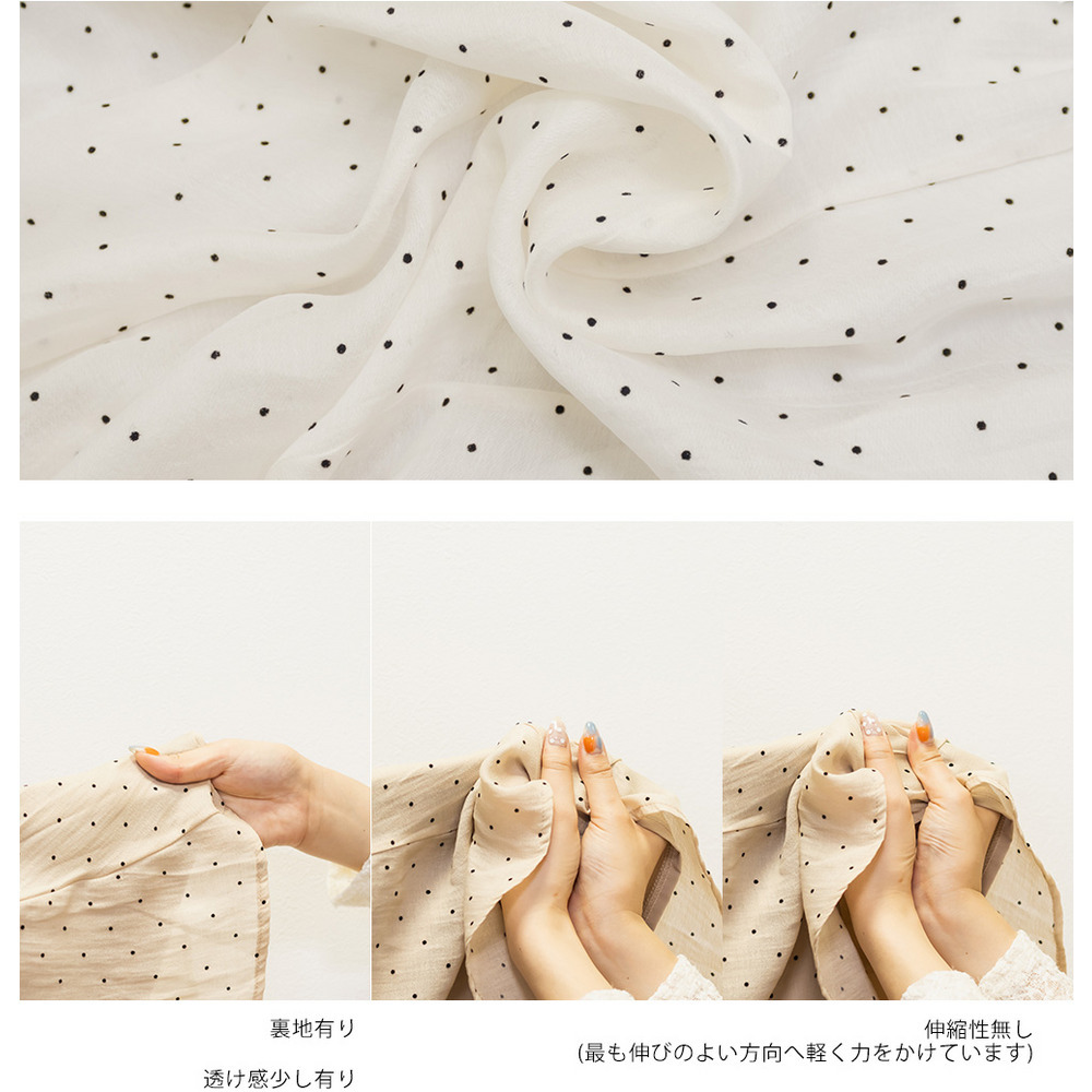 | 素材 | ■素材 【表地】その他75%、ポリエステル25%、【裏地】ポリエステル96%、ポリウレタン4% ■裏地・透け感・伸縮性 裏地有り、透け感少し有り、伸縮性無し ■ポケット 有り ■生地感 表面感のある素材。(フロッキードット) ※さらりとした肌触りの裏地付き |