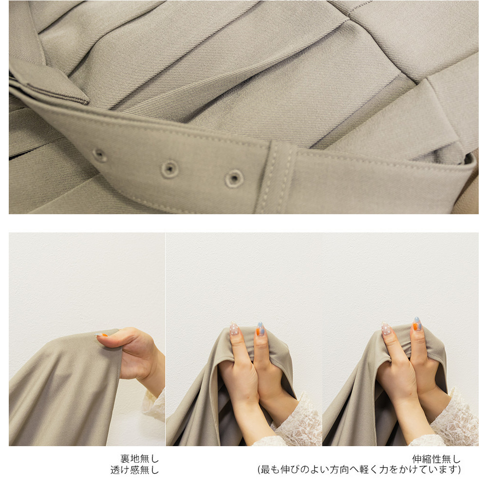 | 素材 | ■素材 ポリエステル95%、ポリウレタン5% ■裏地・透け感・伸縮性 裏地無し、透け感無し、伸縮性無し ■ポケット 無し ■生地感 程よくはりのある上品な印象の布帛素材。 |