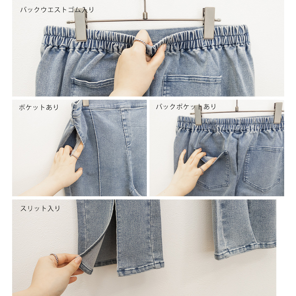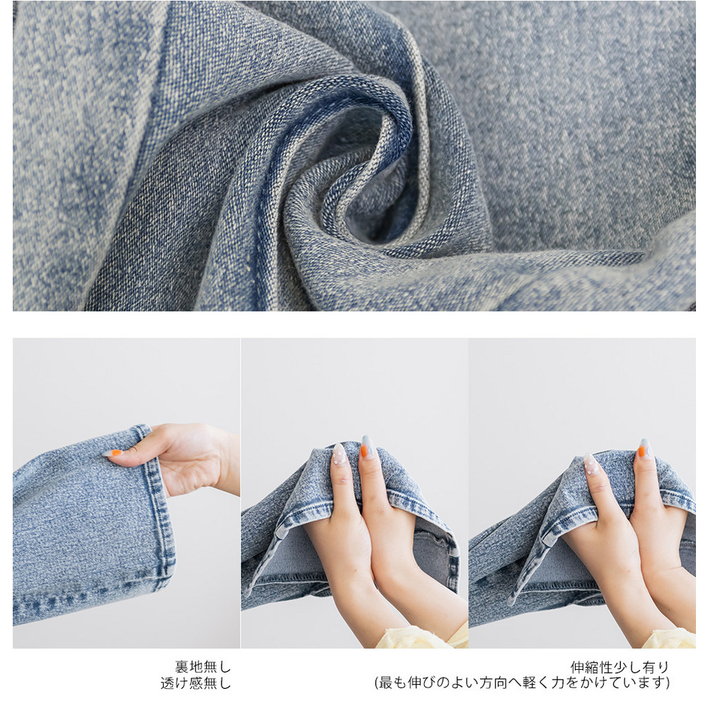 | 素材 | ■素材 綿65%、ポリエステル30%、ポリウレタン5% ■裏地・透け感・伸縮性 裏地無し、透け感無し、伸縮性少し有り ■ポケット 有り ■生地感 伸縮性があり程よくしっかりとしたストレッチデニム素材です。 |