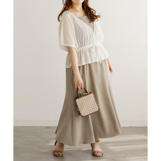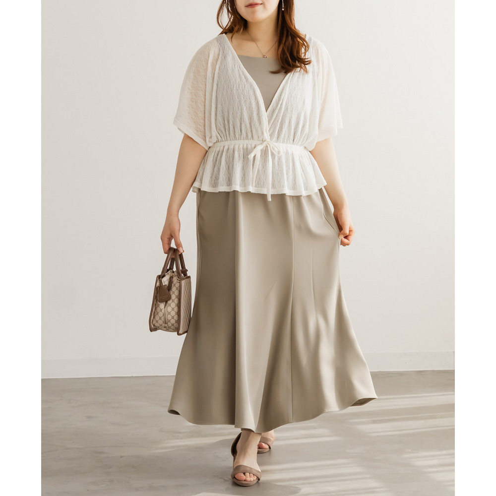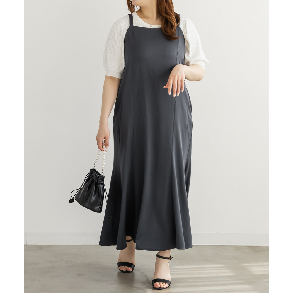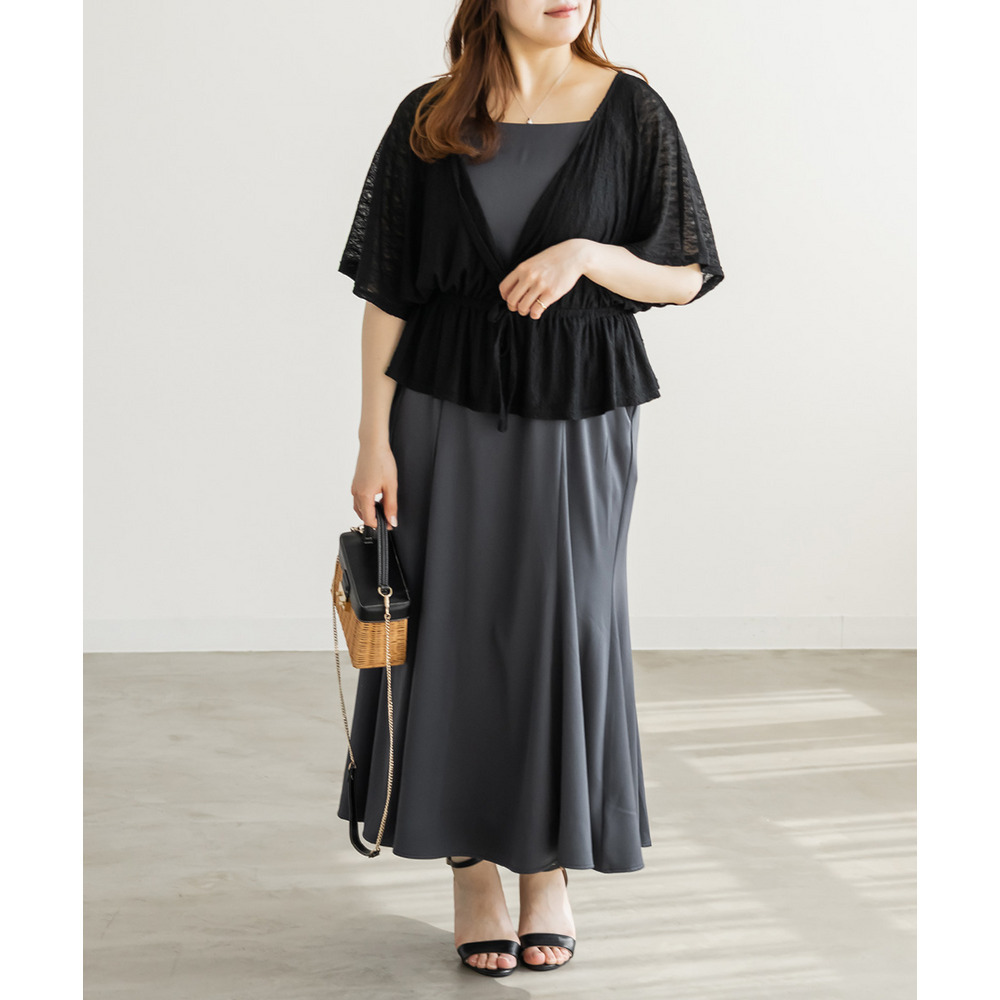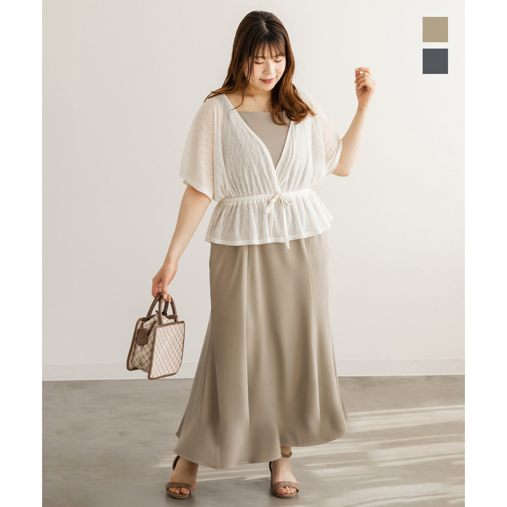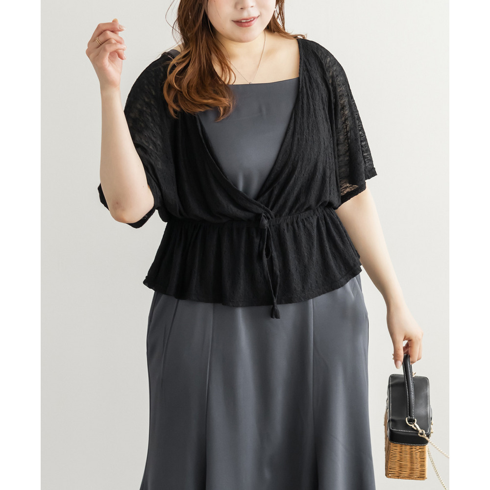 | 3Lを着て丁度いいサイズ感でした。オールシーズン着れるような生地のキャミワンピに、レーストップスのセットアイテムです。1セット買うだけでそれぞれ別々にも使えて便利です!トップスはシアー感があってさらっとしていて真夏にもぴったりです◎着心地も楽で、きちんと感のあるコーデが簡単に完成します。 |