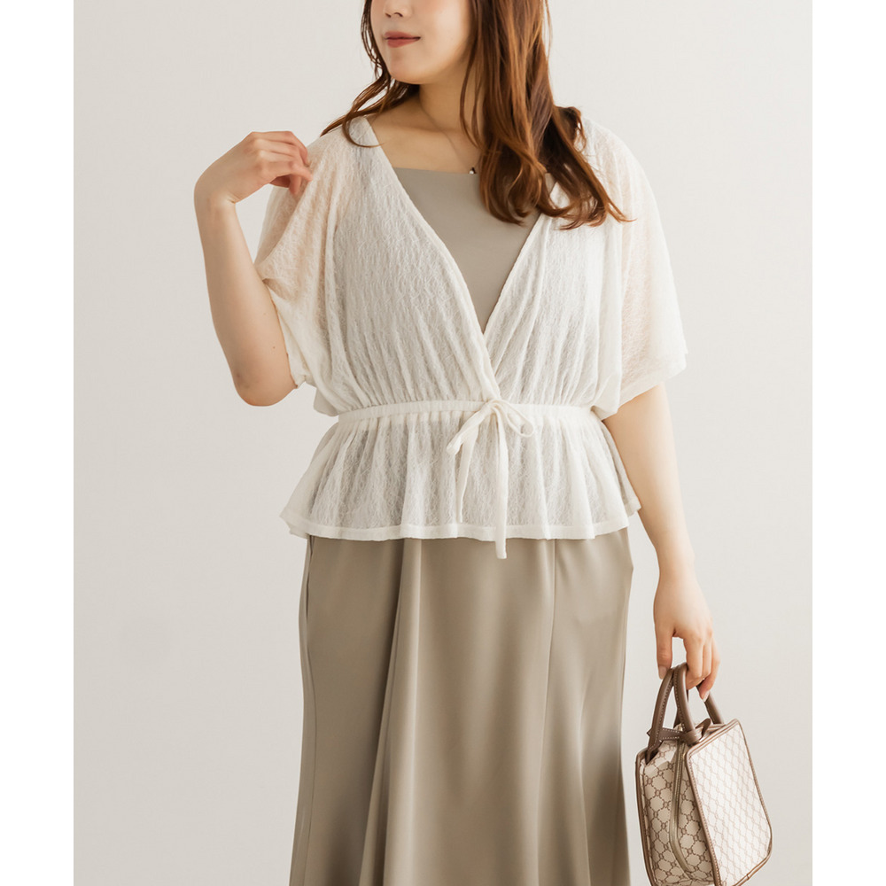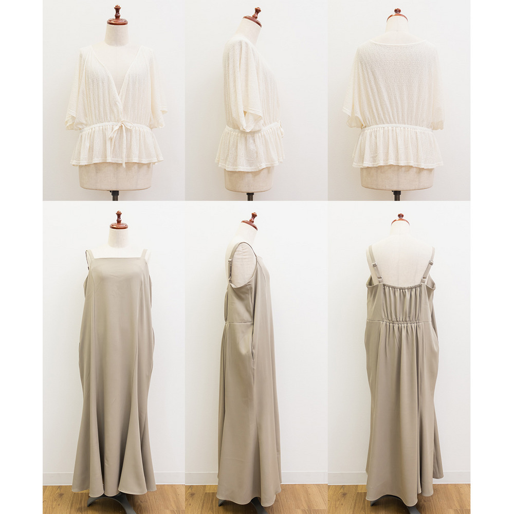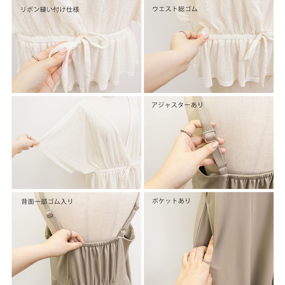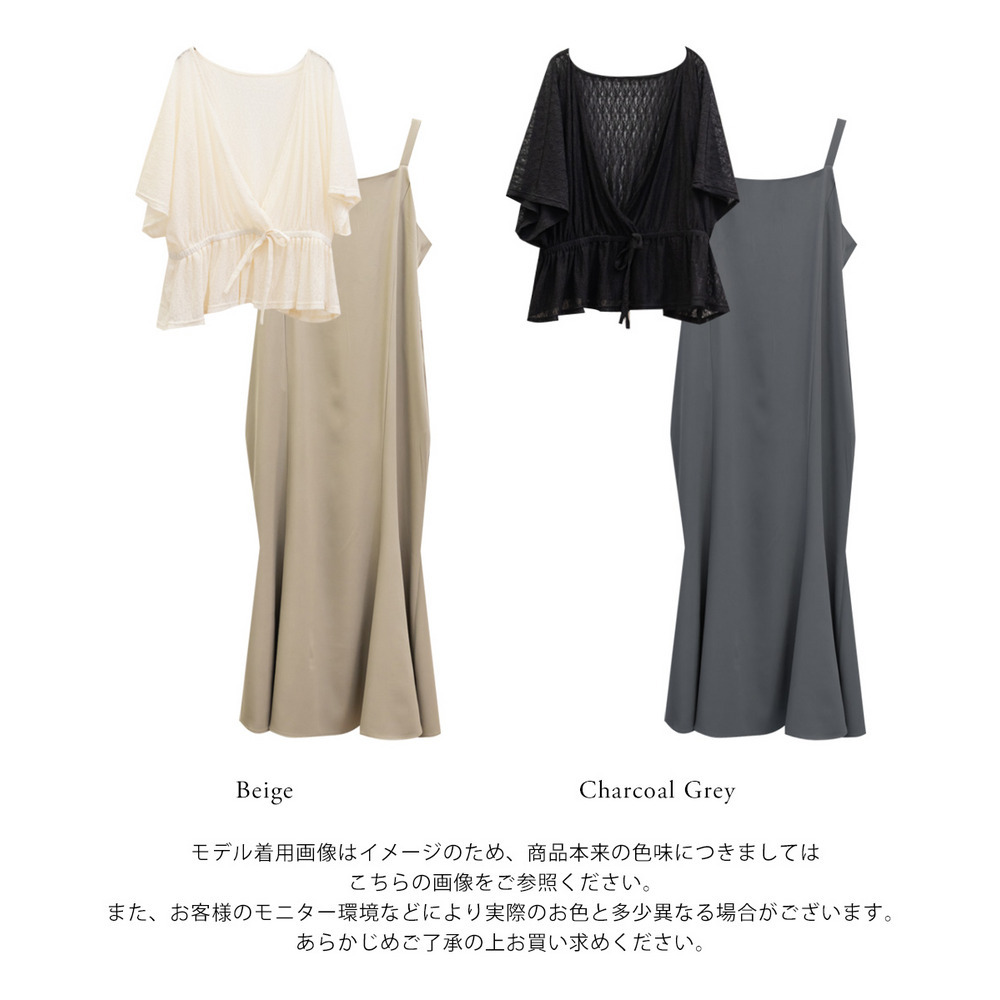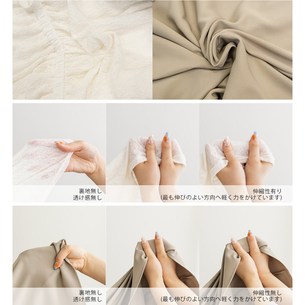 | 素材 | ■素材 【トップス】ナイロン90%、ポリウレタン10%、【ワンピース】ポリエステル95%、ポリウレタン5% ■裏地・透け感・伸縮性 トップス:裏地無し、透け感有り、伸縮性有り / ワンピース:裏地無し、透け感無し、伸縮性無し ■ポケット 有り ■生地感 トップス:透け感と伸縮性のあるレース素材。 ワンピース:さらっとした布帛素材。オールシーズン対応可能。 |