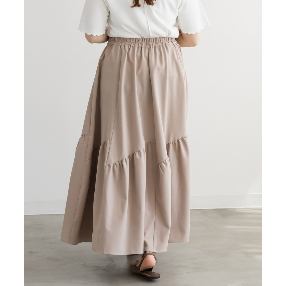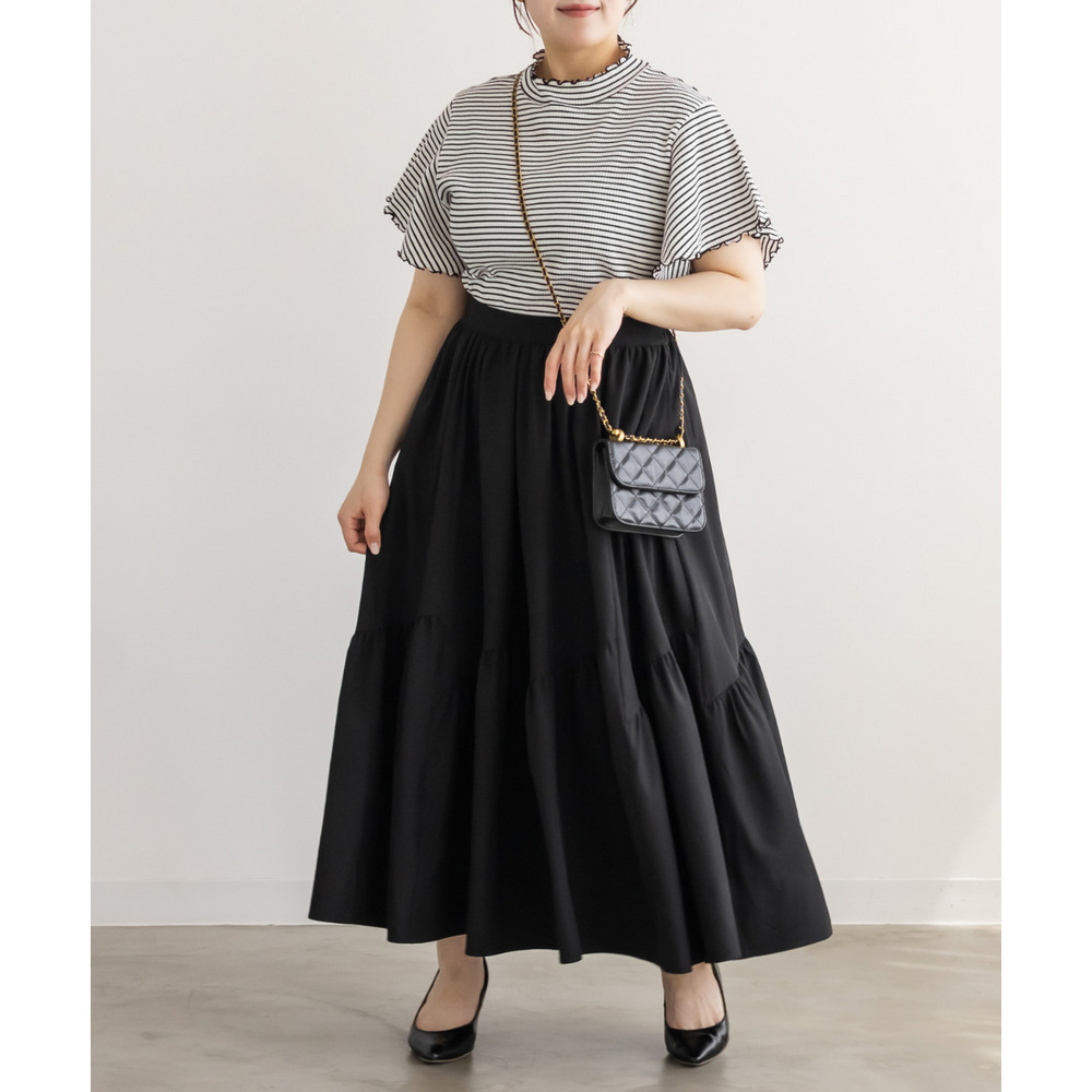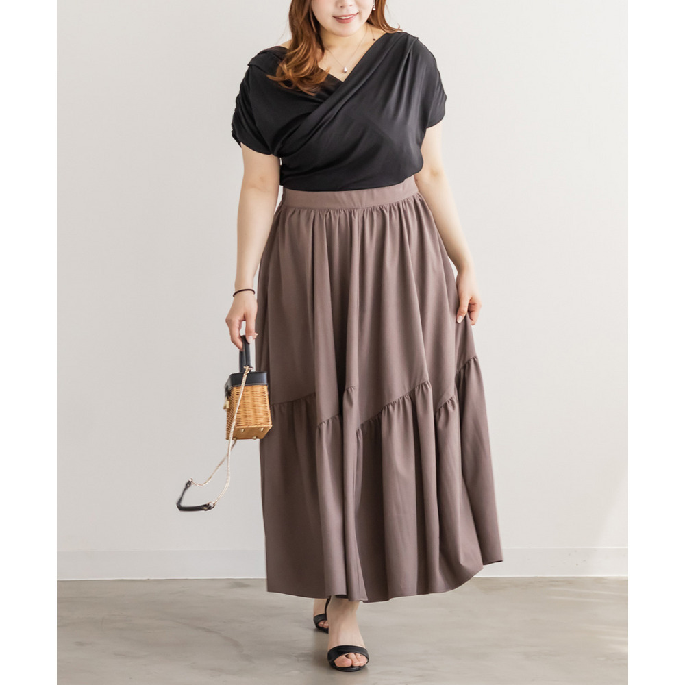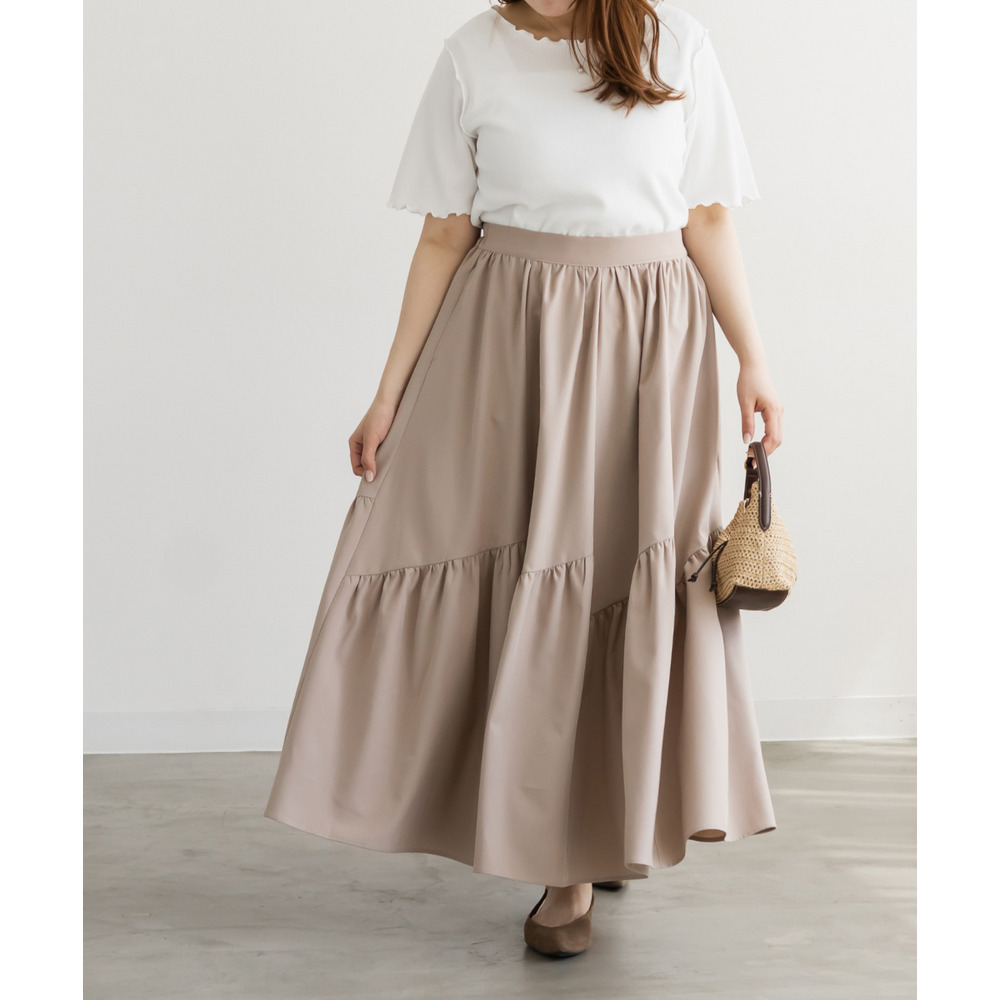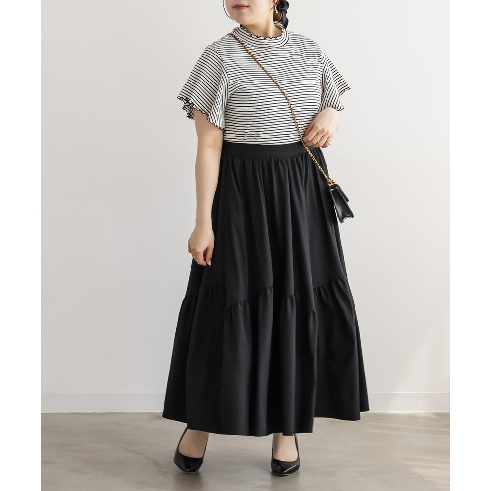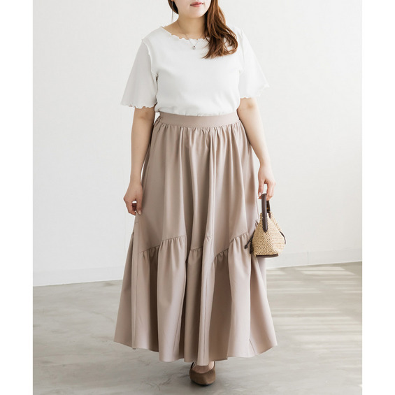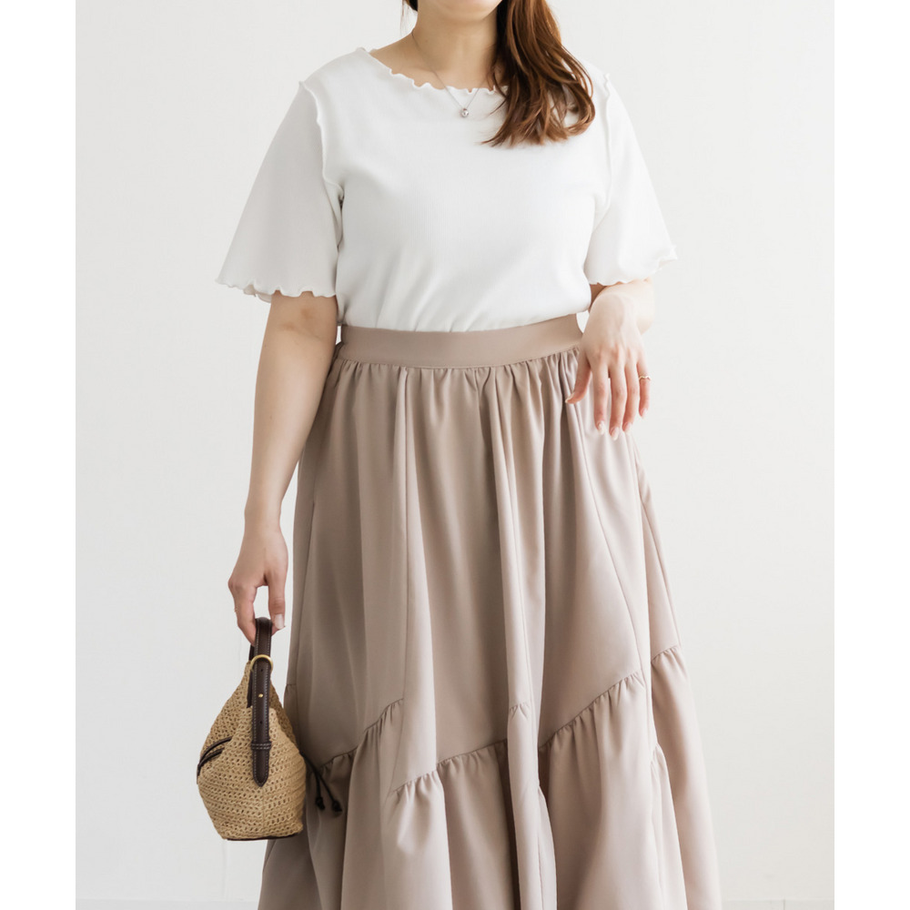 | 3Lサイズを着用してちょうどいいサイズ感でした!パネル切替のデザインが動くたびにきれいに広がって、軽やかで女性らしい印象に見せてくれます◎ボリューム感はありつつも広がりすぎないので、すっきりとバランスよく着られました♪ウエストも楽な穿き心地でストレスなく、シンプルなトップスと合わせるだけで華やかに決まる一枚です! |