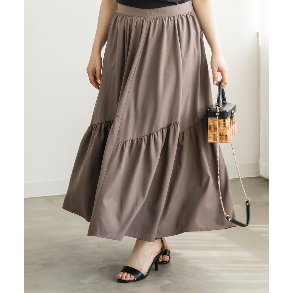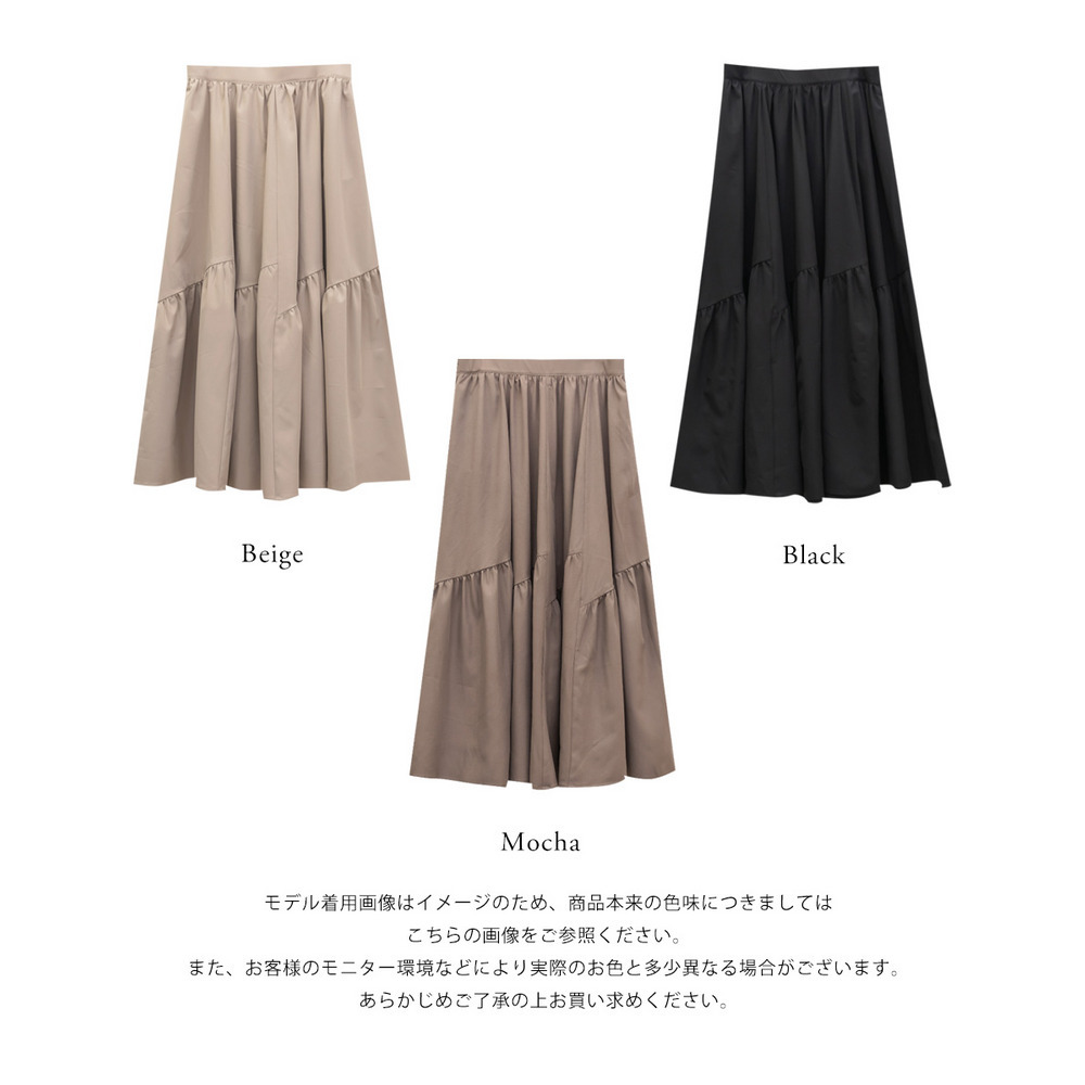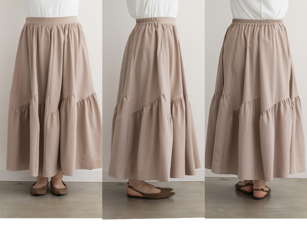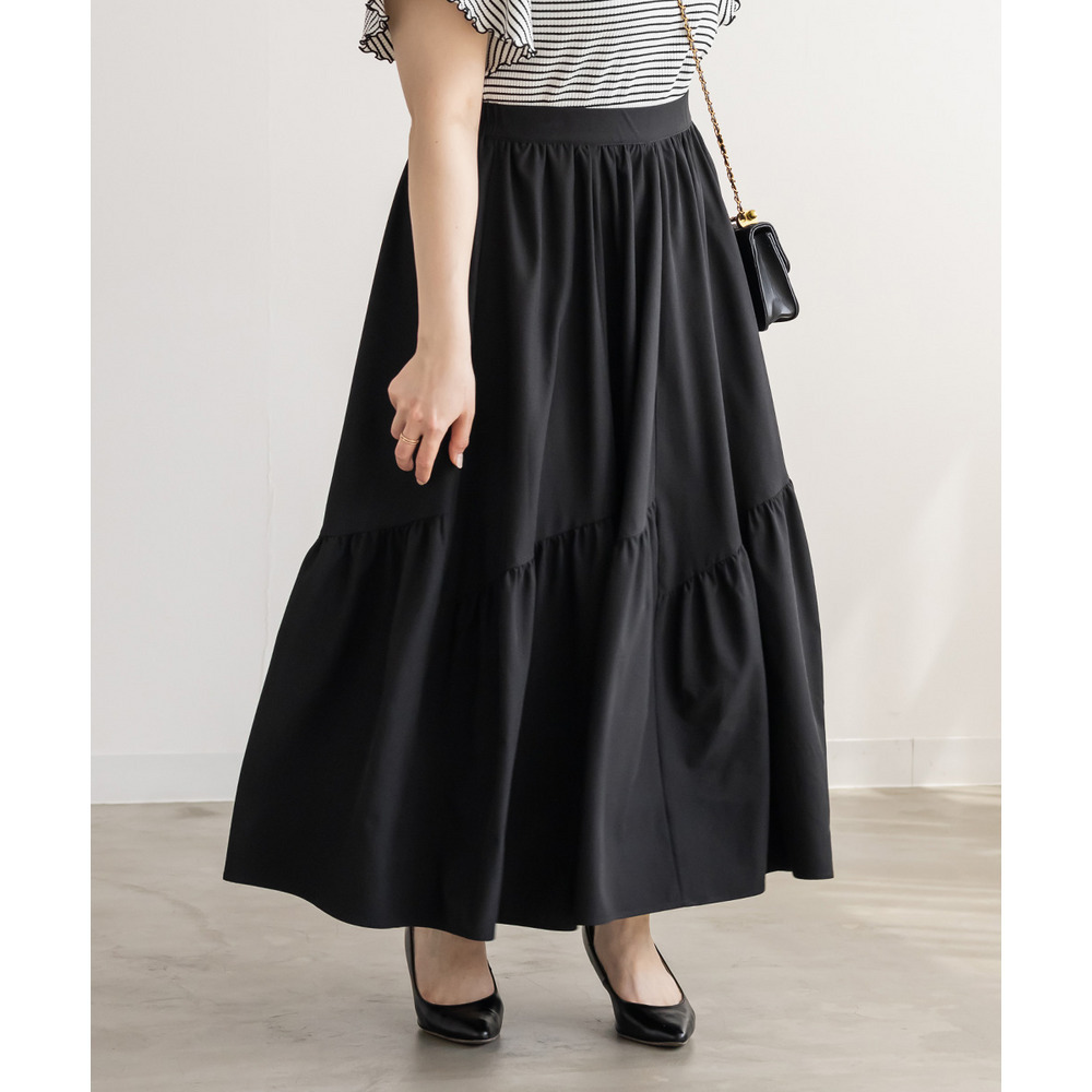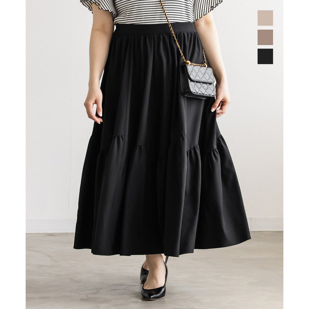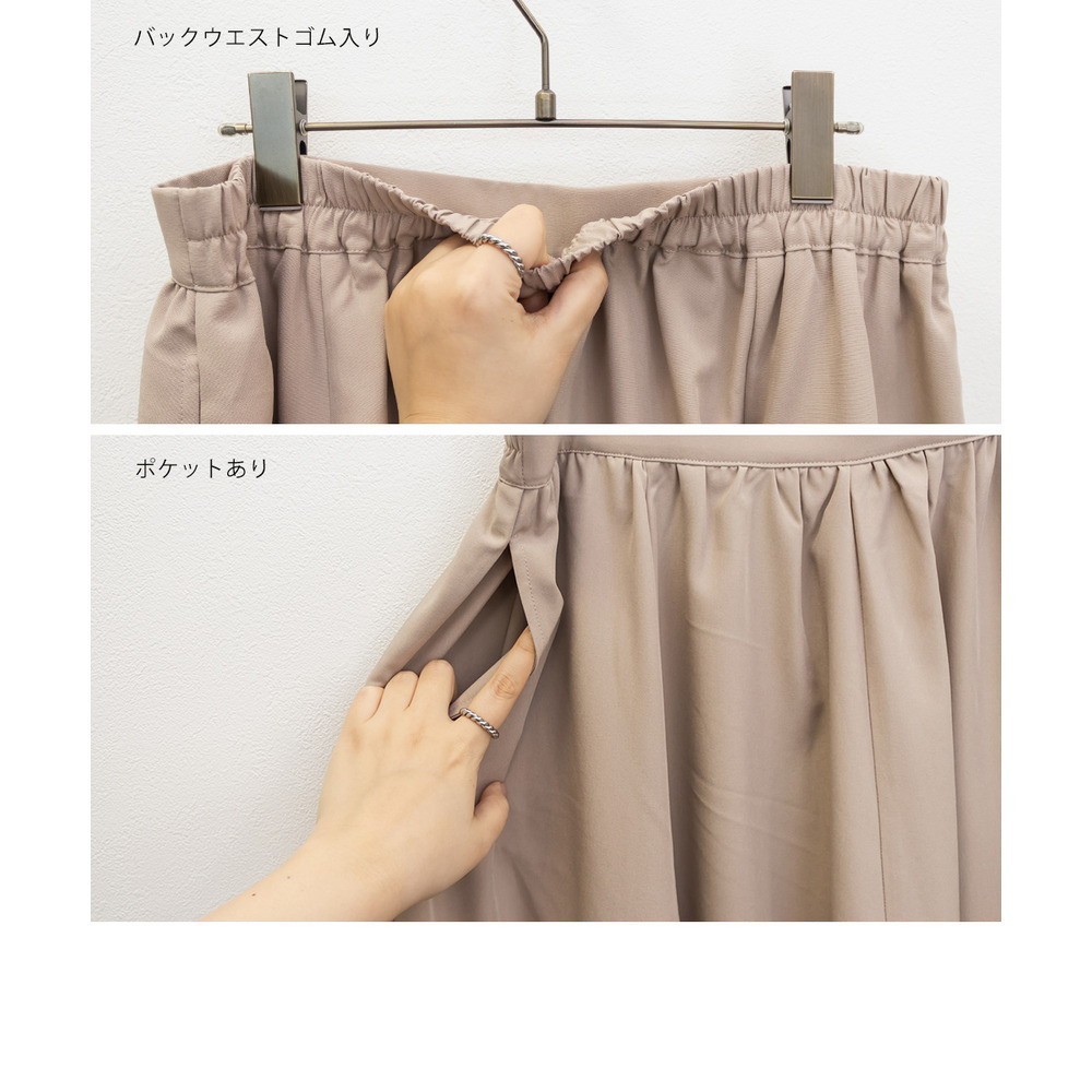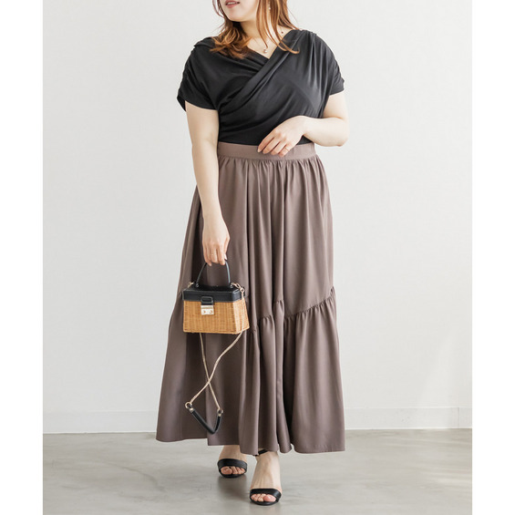 | 3Lサイズを着用してちょうどいいサイズ感でした!パネル切替のデザインが動くたびにきれいに広がって、軽やかで女性らしい印象に見せてくれます◎ボリューム感はありつつも広がりすぎないので、すっきりとバランスよく着られました♪ウエストも楽な穿き心地でストレスなく、シンプルなトップスと合わせるだけで華やかに決まる一枚です! |
