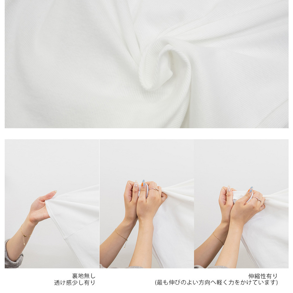 | 素材 | ■素材 ポリエステル65%、綿30%、ポリウレタン5% ■裏地・透け感・伸縮性 裏地無し、透け感無し、伸縮性有り ■ポケット 無し ■生地感 伸縮性のあるカットソー素材。 |