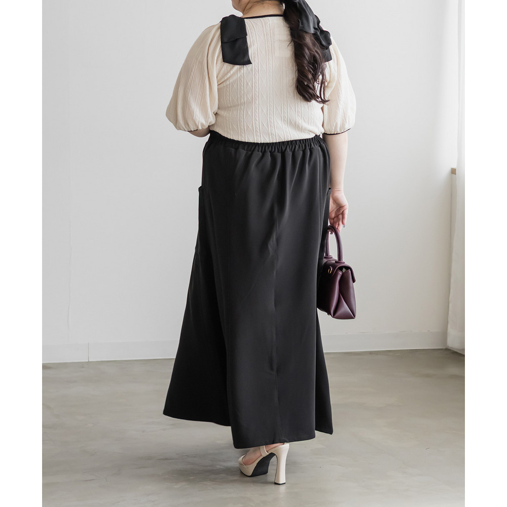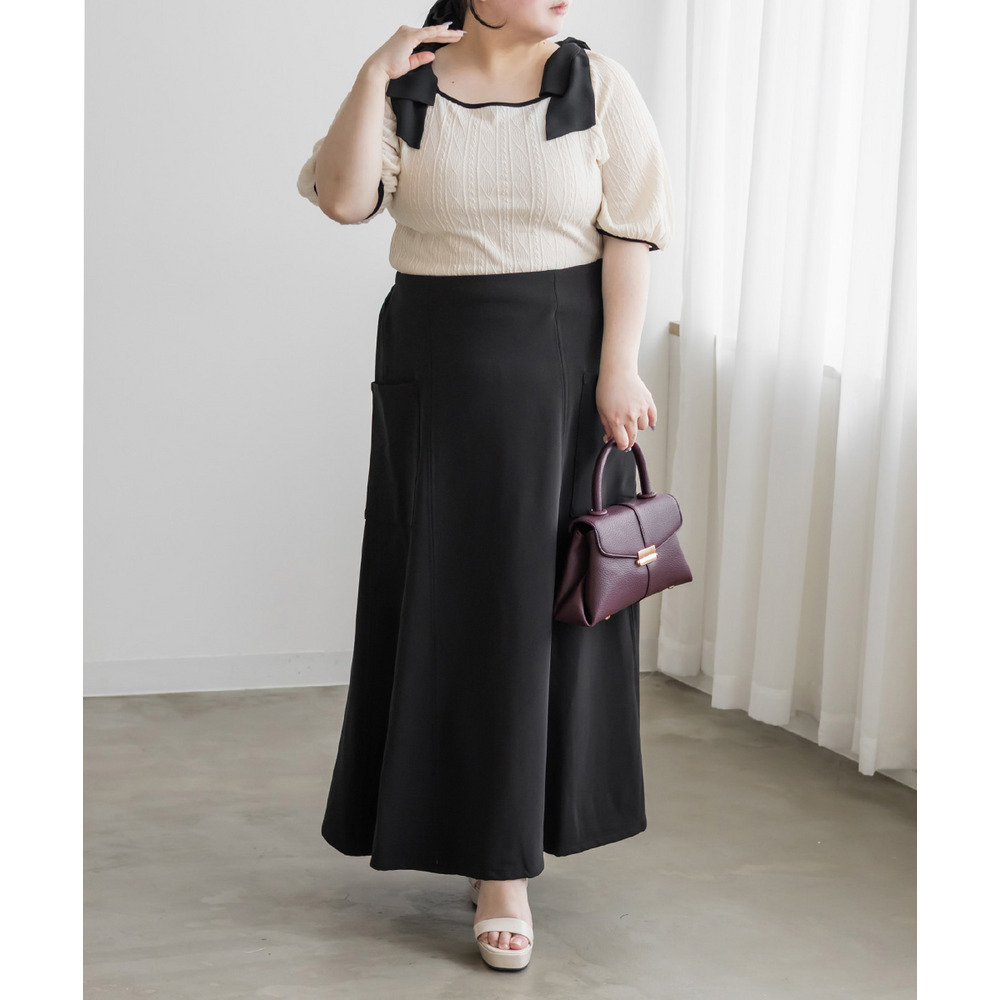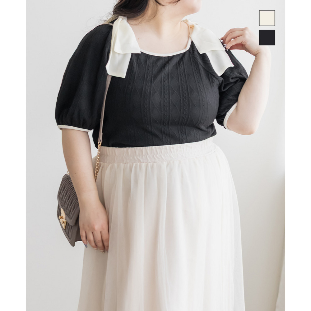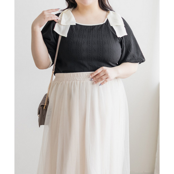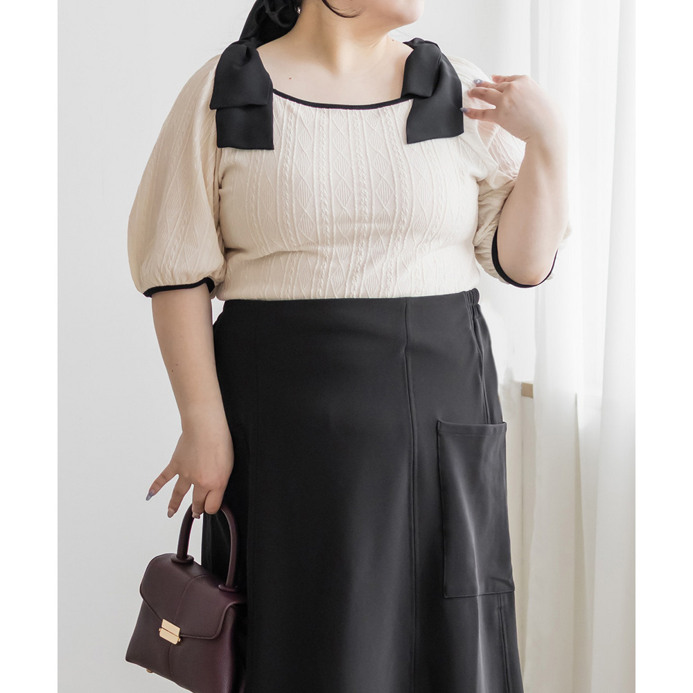 3Lサイズを着用しました。身幅や肩まわりもちょうどいい着心地でしたとても軽く凹凸のある生地がボディラインを拾いづらくしてくれます。スクエアネックがデコルテをすっきり見せてくれて、肩のリボン華やかな印象に♪ スカート合わせでフェミニンに、パンツ合わせで甘さを抑えた着こなしも楽しめる、着映えトップスだと思いました。