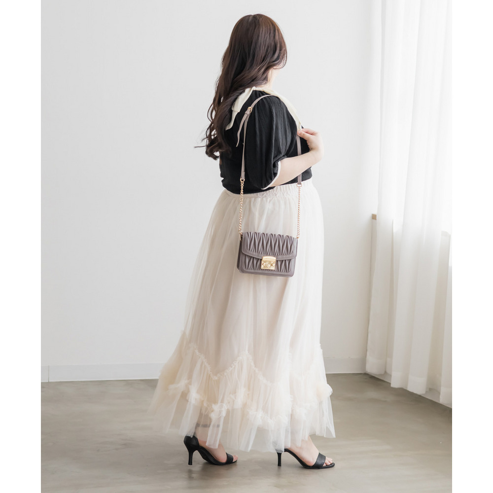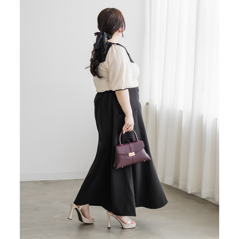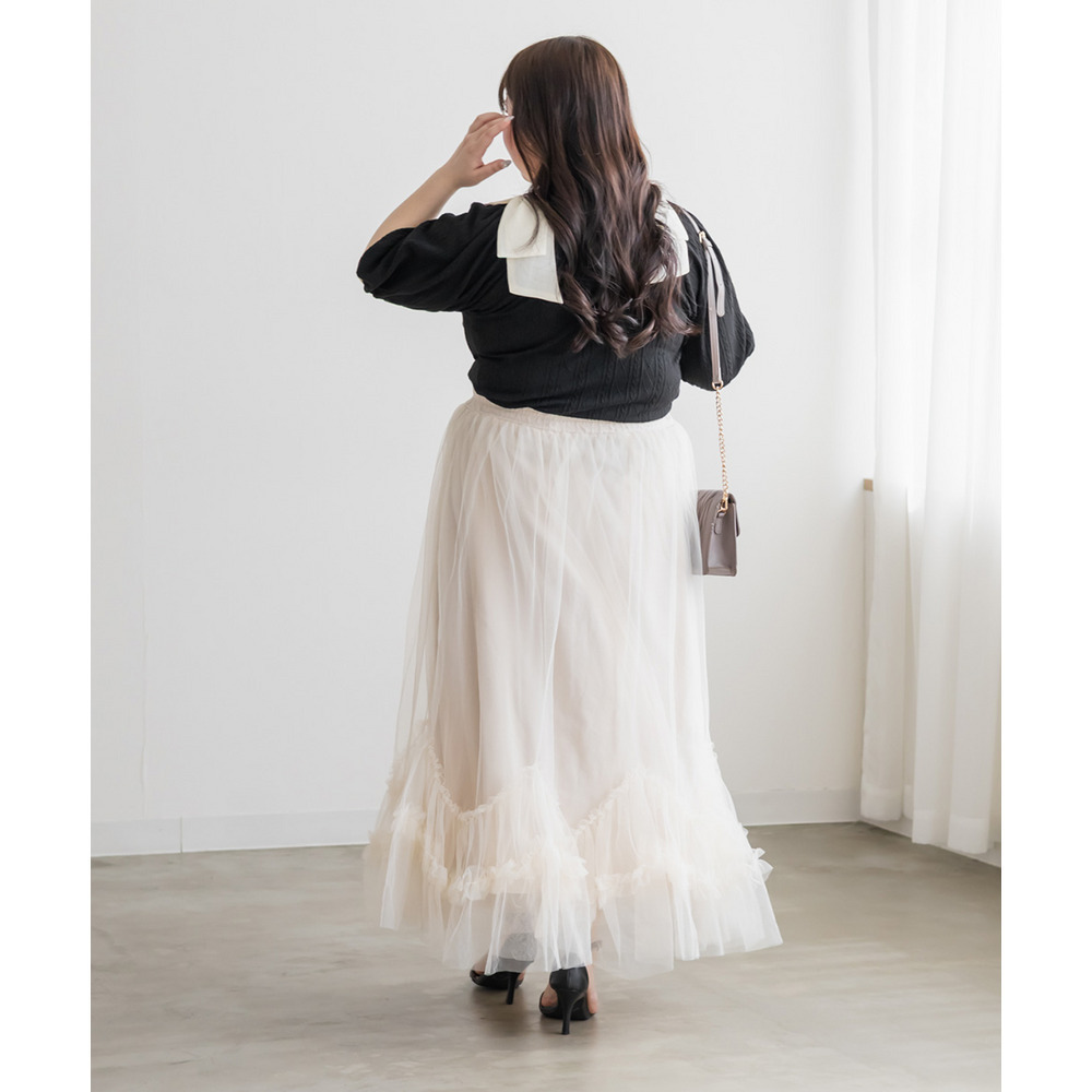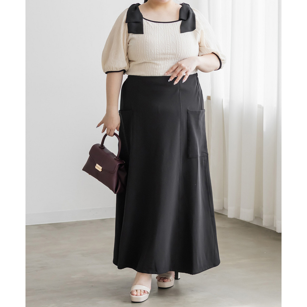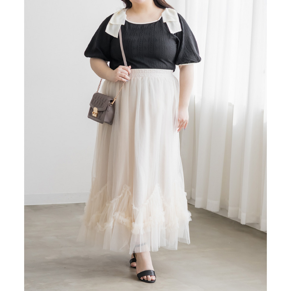 3Lサイズを着用しました。身幅や肩まわりもちょうどいい着心地でしたとても軽く凹凸のある生地がボディラインを拾いづらくしてくれます。スクエアネックがデコルテをすっきり見せてくれて、肩のリボン華やかな印象に♪ スカート合わせでフェミニンに、パンツ合わせで甘さを抑えた着こなしも楽しめる、着映えトップスだと思いました。