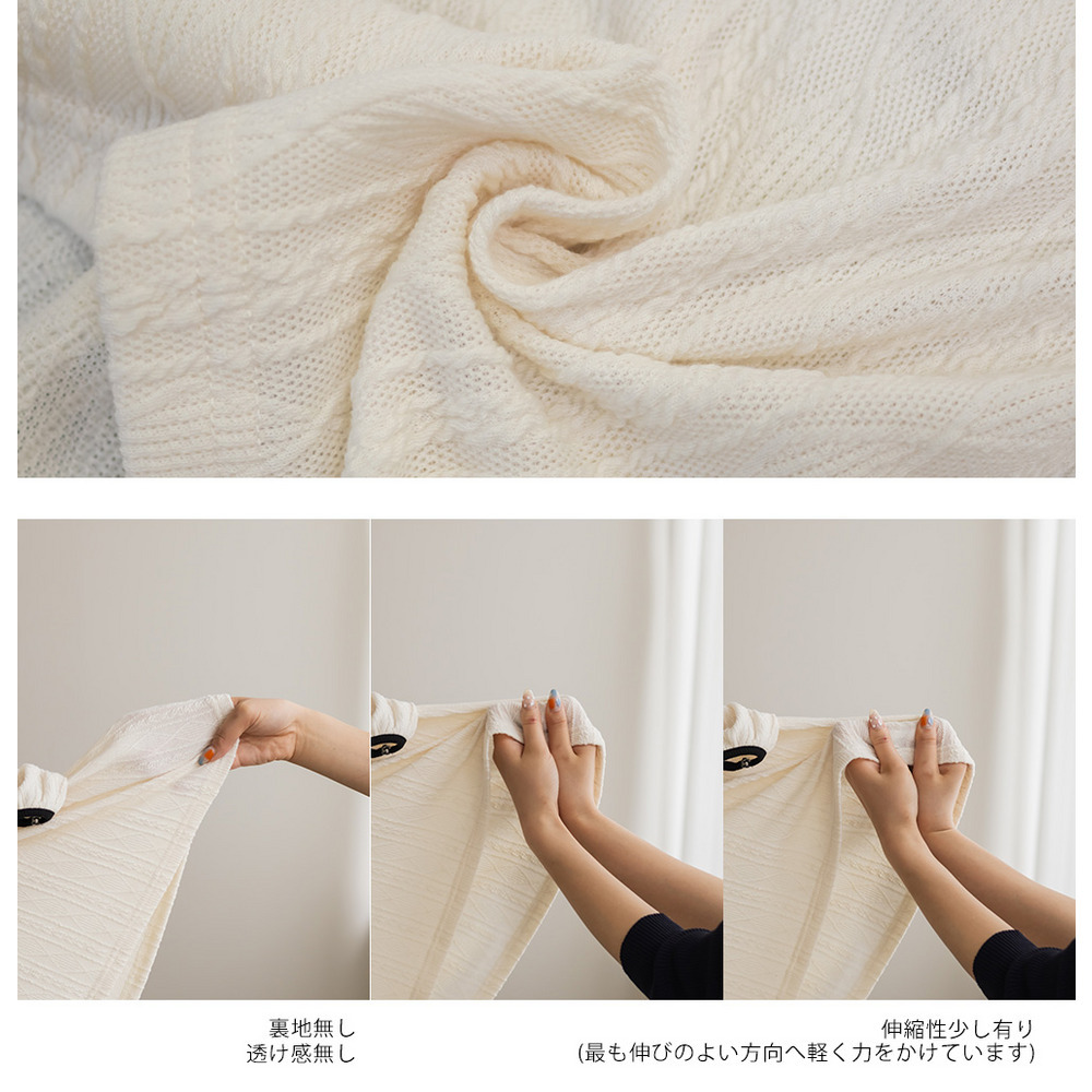 素材 ■素材 ポリエステル100% ■裏地・透け感・伸縮性 裏地無し、透け感無し、伸縮性少し有り ■ポケット 無し ■生地感 凹凸のある伸縮性のある素材です。