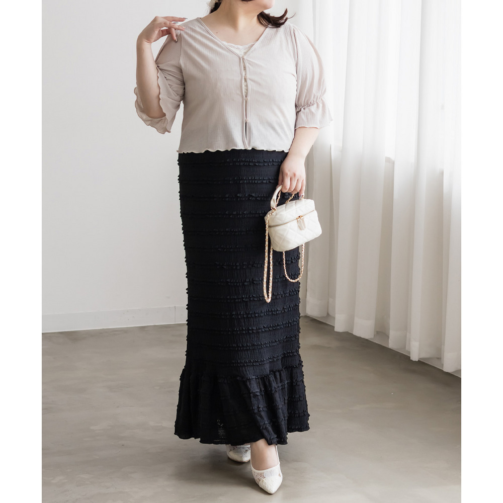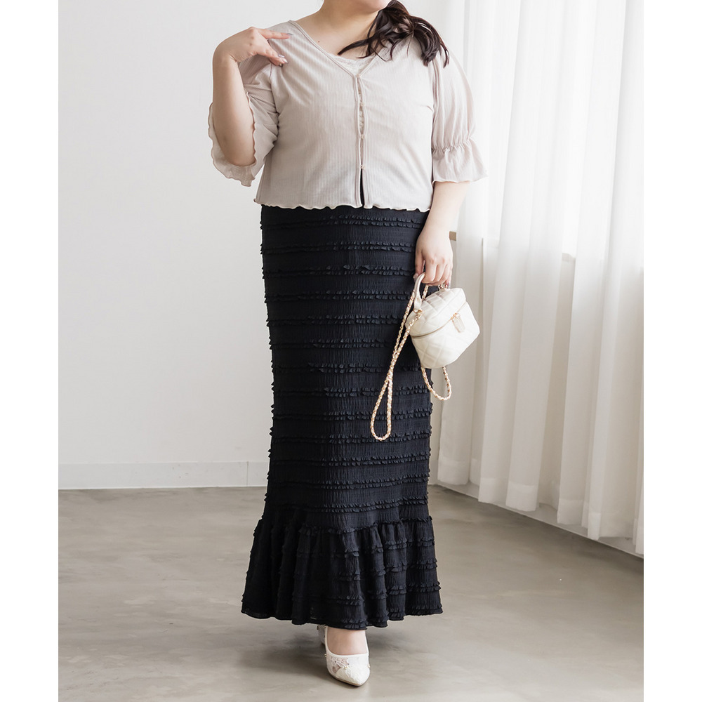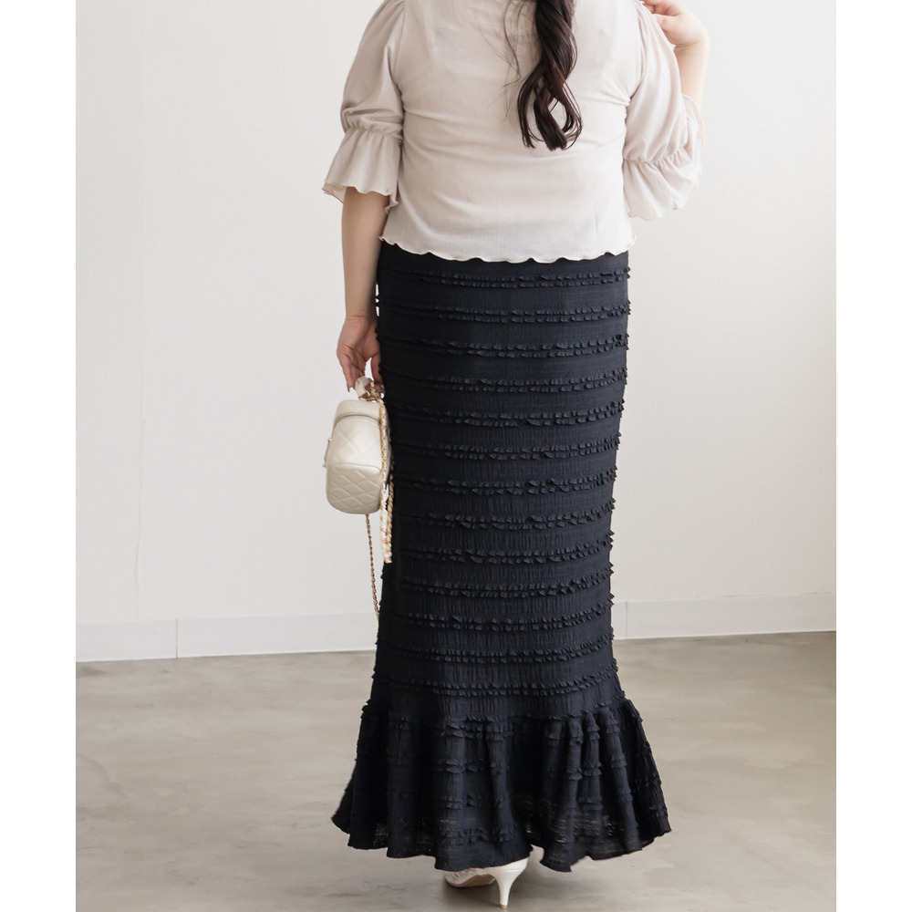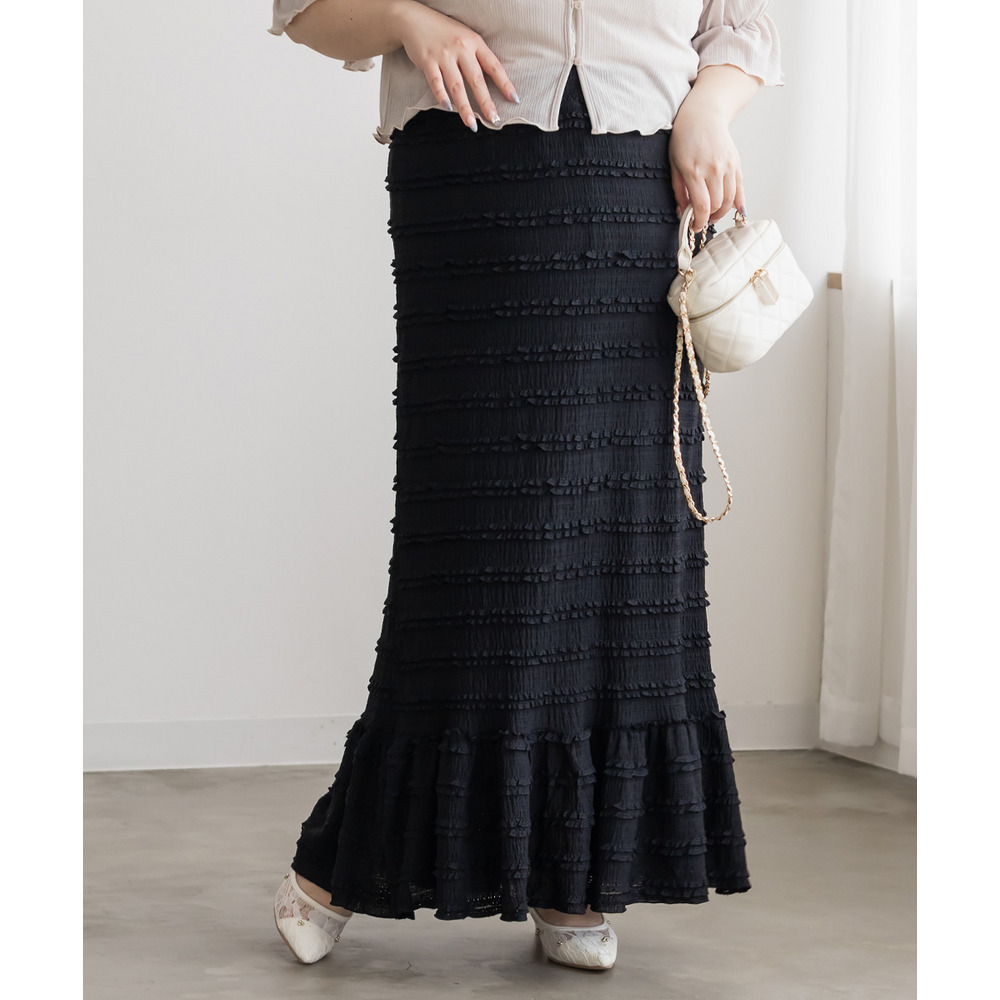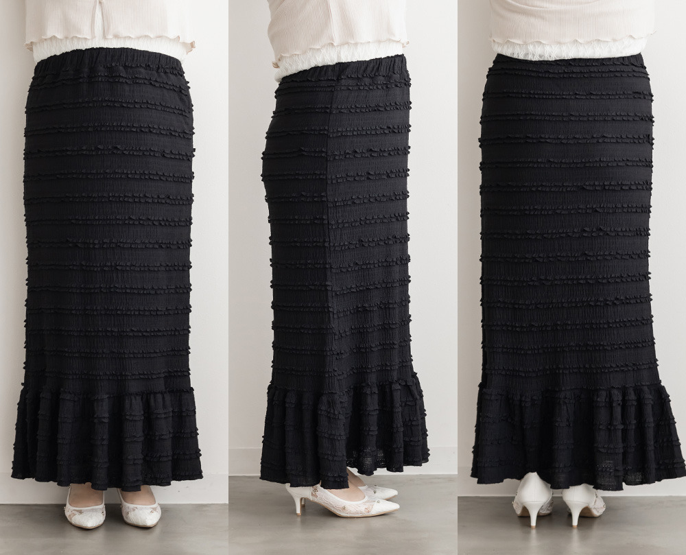 3Lサイズを着用して、ウエストは総ゴム仕様で楽ちんな履き心地でした♪ すとんと落ちるIラインシルエットで縦長効果があり、すっきりとした印象に◎ 裾の切替kら広がるフリル感がフェミニンで可愛いです。小さなフリルが全体にあしらわれた生地が華やかで凹凸があるのでボディラインを拾いにくく、着やせ効果も◎ しっかりロング丈なのですらっと脚長に見えます!Tシャツやブラウス、ショート丈アウターとも相性抜群!カジュアルにもきれいめにも使える万能スカートです♪