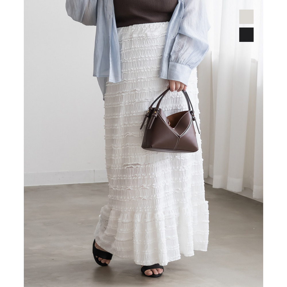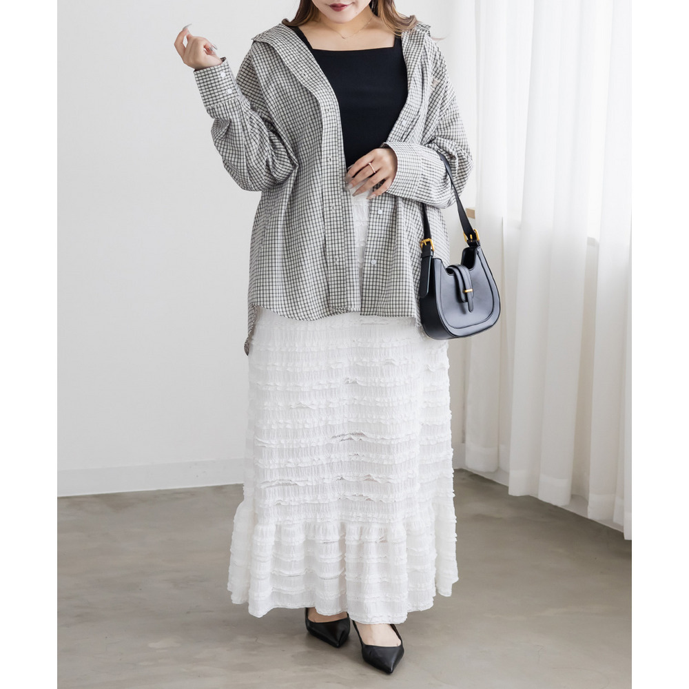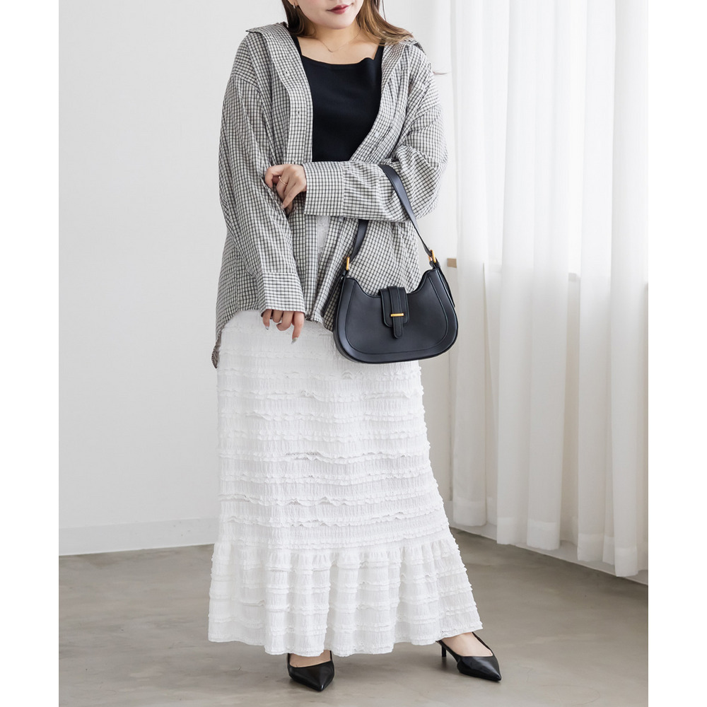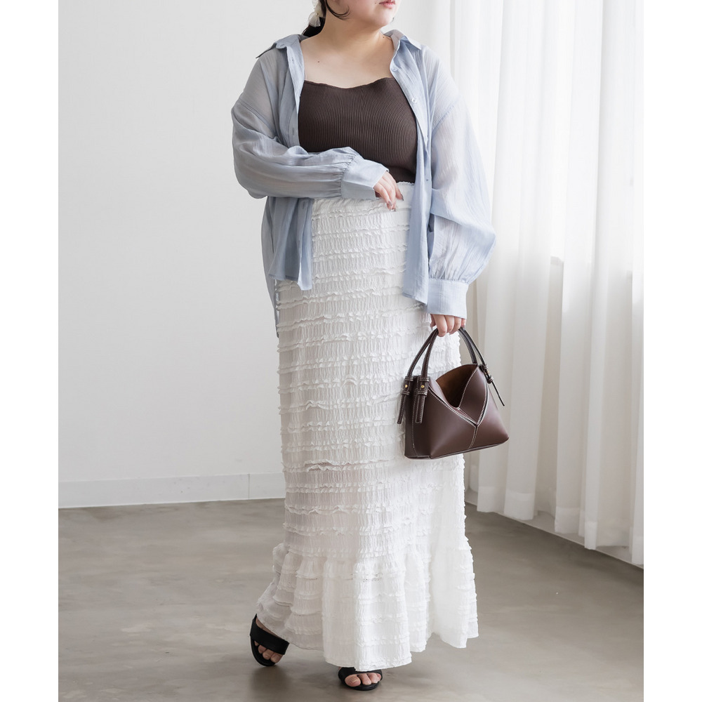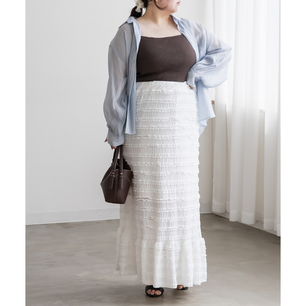 3Lサイズを着用して、ウエストは総ゴム仕様で楽ちんな履き心地でした♪ すとんと落ちるIラインシルエットで縦長効果があり、すっきりとした印象に◎ 裾の切替kら広がるフリル感がフェミニンで可愛いです。小さなフリルが全体にあしらわれた生地が華やかで凹凸があるのでボディラインを拾いにくく、着やせ効果も◎ しっかりロング丈なのですらっと脚長に見えます!Tシャツやブラウス、ショート丈アウターとも相性抜群!カジュアルにもきれいめにも使える万能スカートです♪