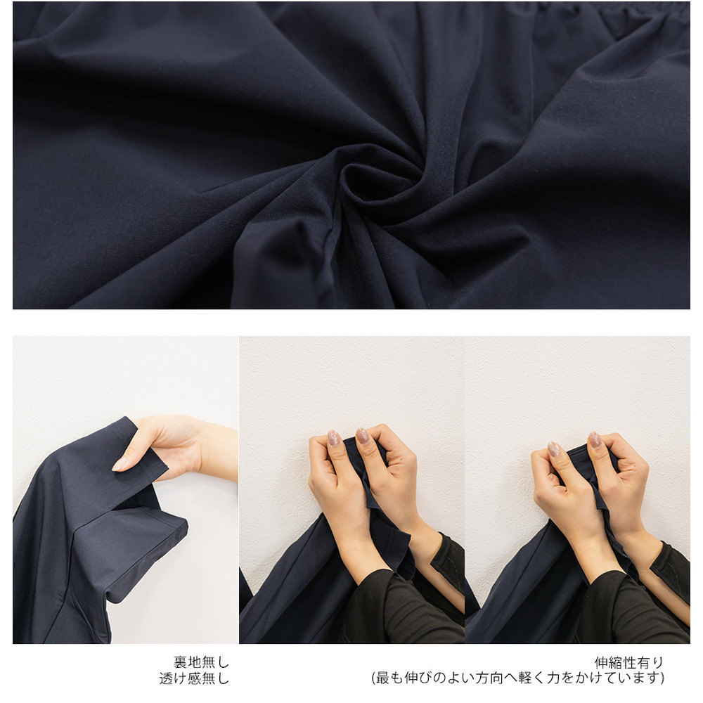 素材 ■素材 ナイロン90%、ポリウレタン10% ■裏地・透け感・伸縮性 裏地無し、透け感無し、伸縮性少し有り ■ポケット 有り ■生地感 やや伸縮性のある、外側がさらっとした柔らかい素材です。