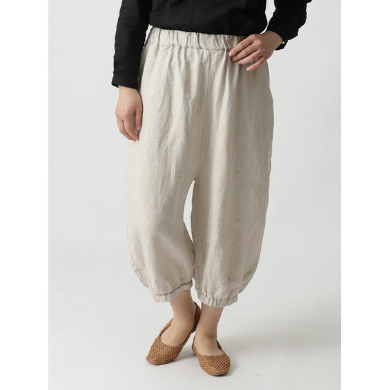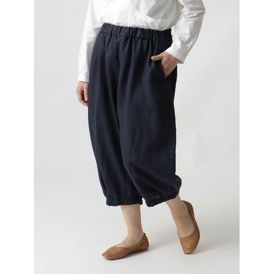 裾にぐるりとゴムを入れて、丸みのあるシルエットです。ウエストは総ゴムで内側に調節できる紐つき。サイドやバックにポケットもあり、利便性も兼ね備えたアイテムです